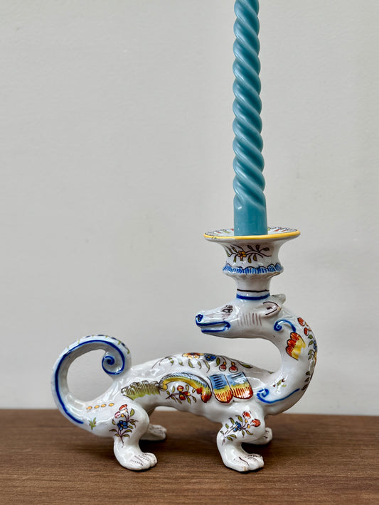 Fourmaintraux 社のファイアンス焼、ドラゴンのキャンドル ホルダー: デヴル、フランス、1900年頃