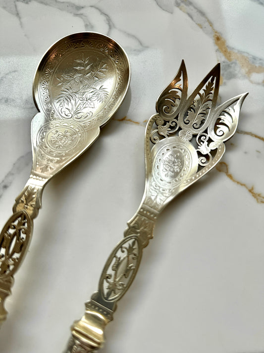 ビクトリア朝時代のマッピング・ブラザーズ社製、サービング・スプーンとフォークのセット - A1 高品質のシルバープレート、19世紀中頃