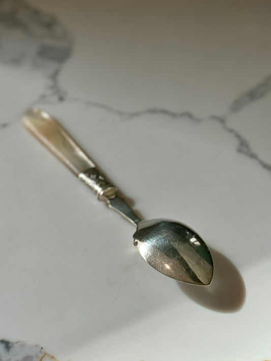 ヴィンテージ シルバープレートのジャムスプーン 花柄彫刻入り|マザーオブパールハンドル付き