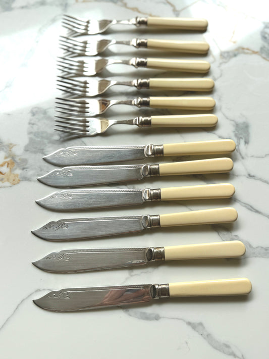 ヴィンテージ、シルバープレートのフィッシュ・ナイフとフォーク6人用セット|フェイクボーンのハンドル、1930年代