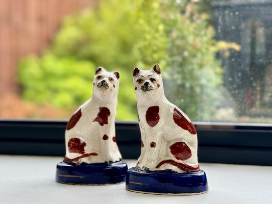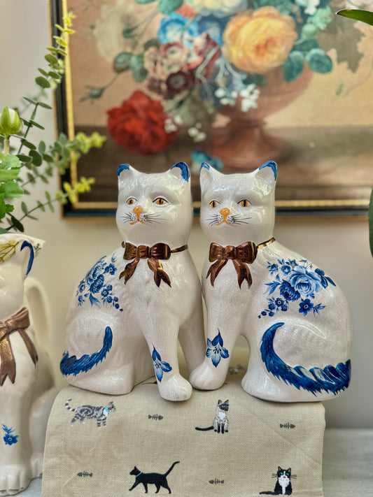 ヴィンテージ スタッフォードシャーキャット(ペア)|ブルー&ホワイト花柄 × 金色リボン