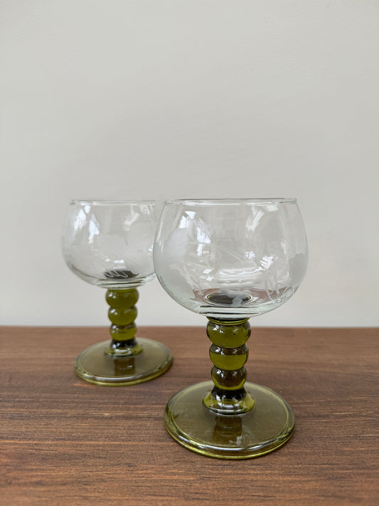 ヴィンテージ・ローマー・ワイングラス - オリーブグリーンのバブルステムとブドウ柄のエッチング - 2個セット