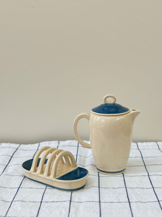 スージークーパー、ターコイズのバンド柄コーヒーポットとトーストラックのセット|C.1938年/パターンNo.1579