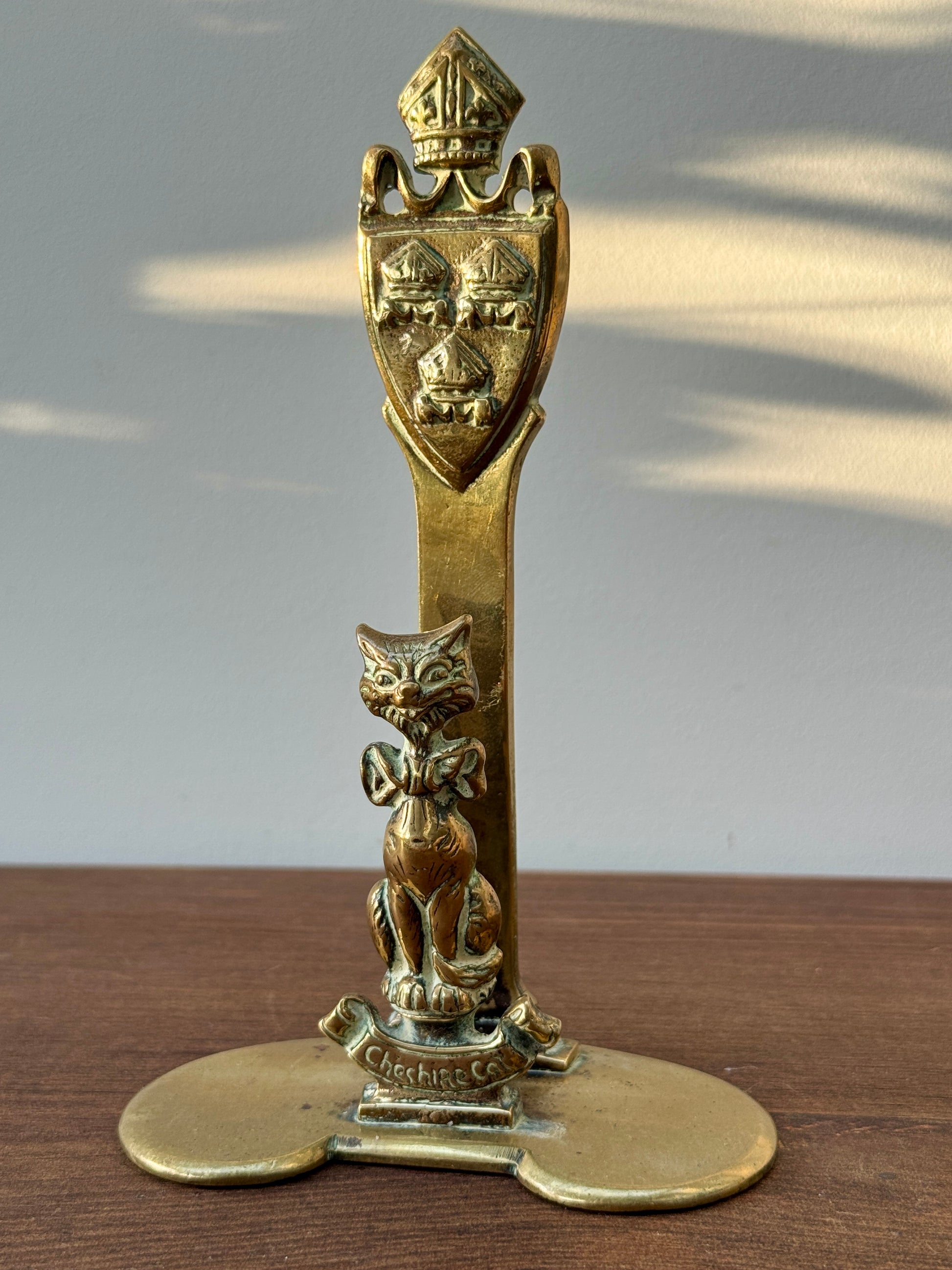 3つの麦の穂が描かれたチェシャ州の紋章と、微笑みを浮かべた立ち姿のチェシャ猫という、英国らしい遊び心と伝統が調和したデザイン。重厚感のある真鍮の輝きと経年によるやわらかな色合いが、どのような空間にも上品な温かみを添えます。