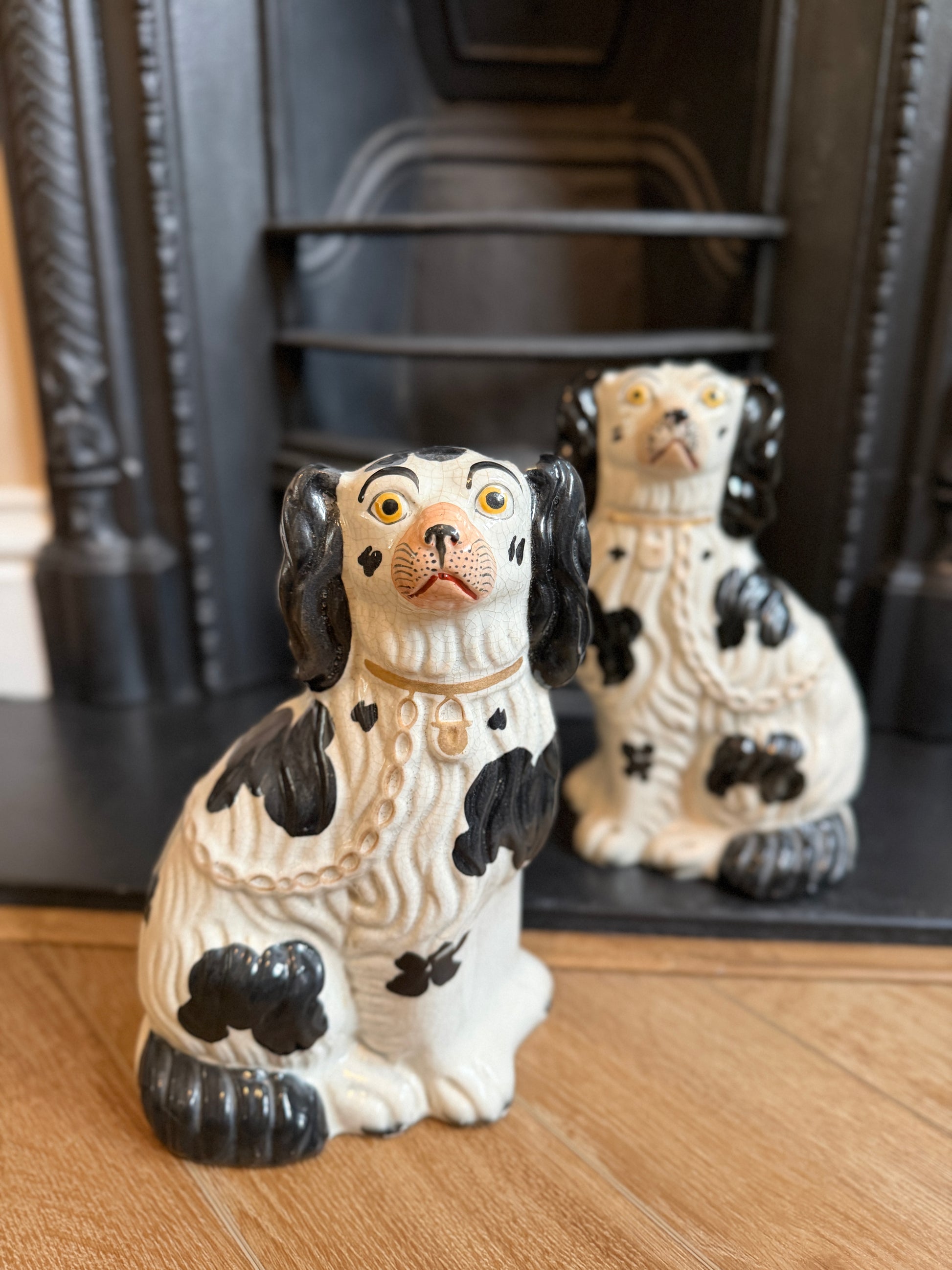19世紀中頃、1850年頃に作られたアンティークのスタッフォードシャードッグ、コンフォーター・スパニエルのペアです。このデザインは Clive Mason Pope 著 The A–Z of Staffordshire Dogs にも掲載されている、スタッフォードシャードッグの中でもよく知られた代表的なモデルです。