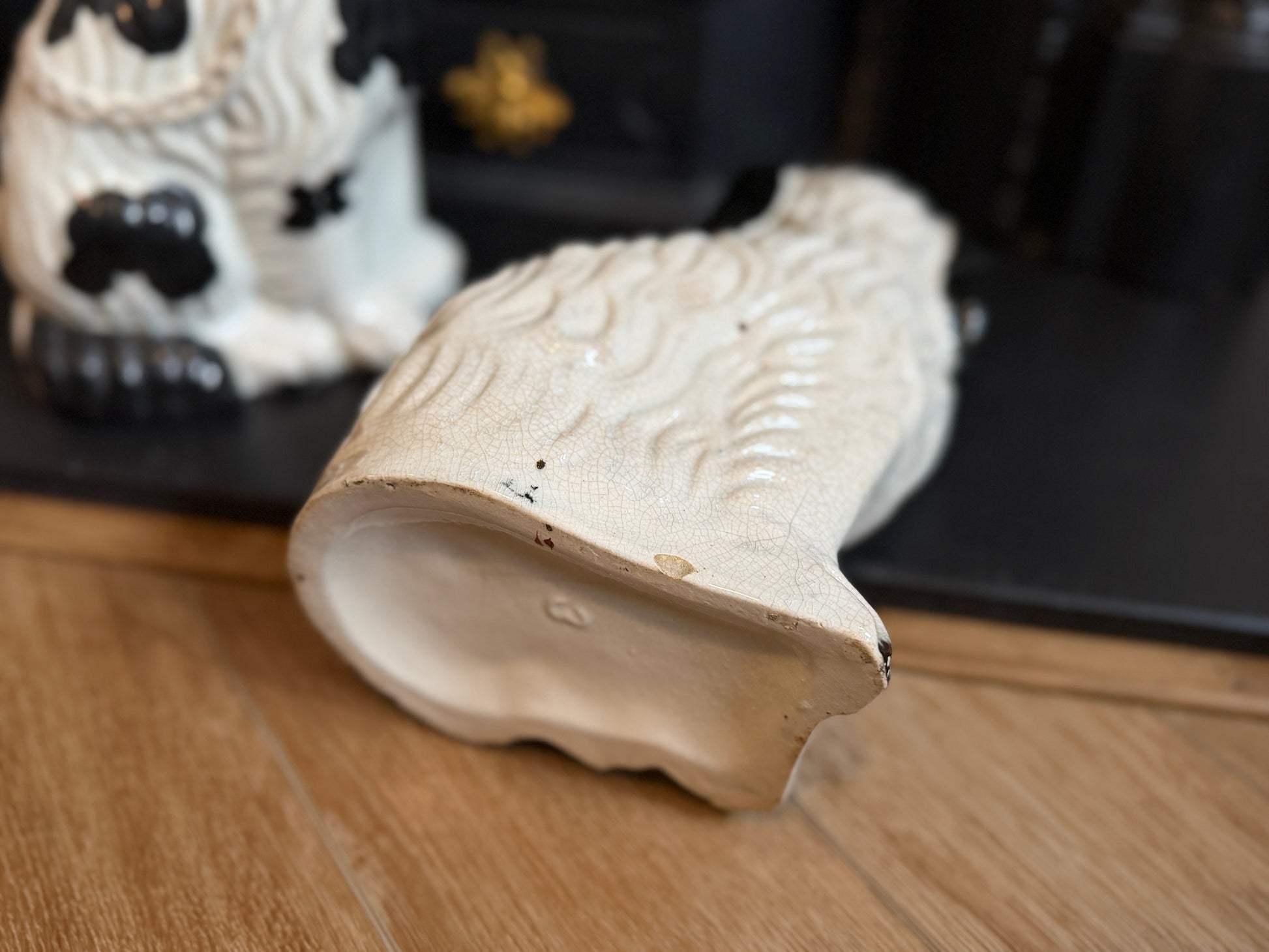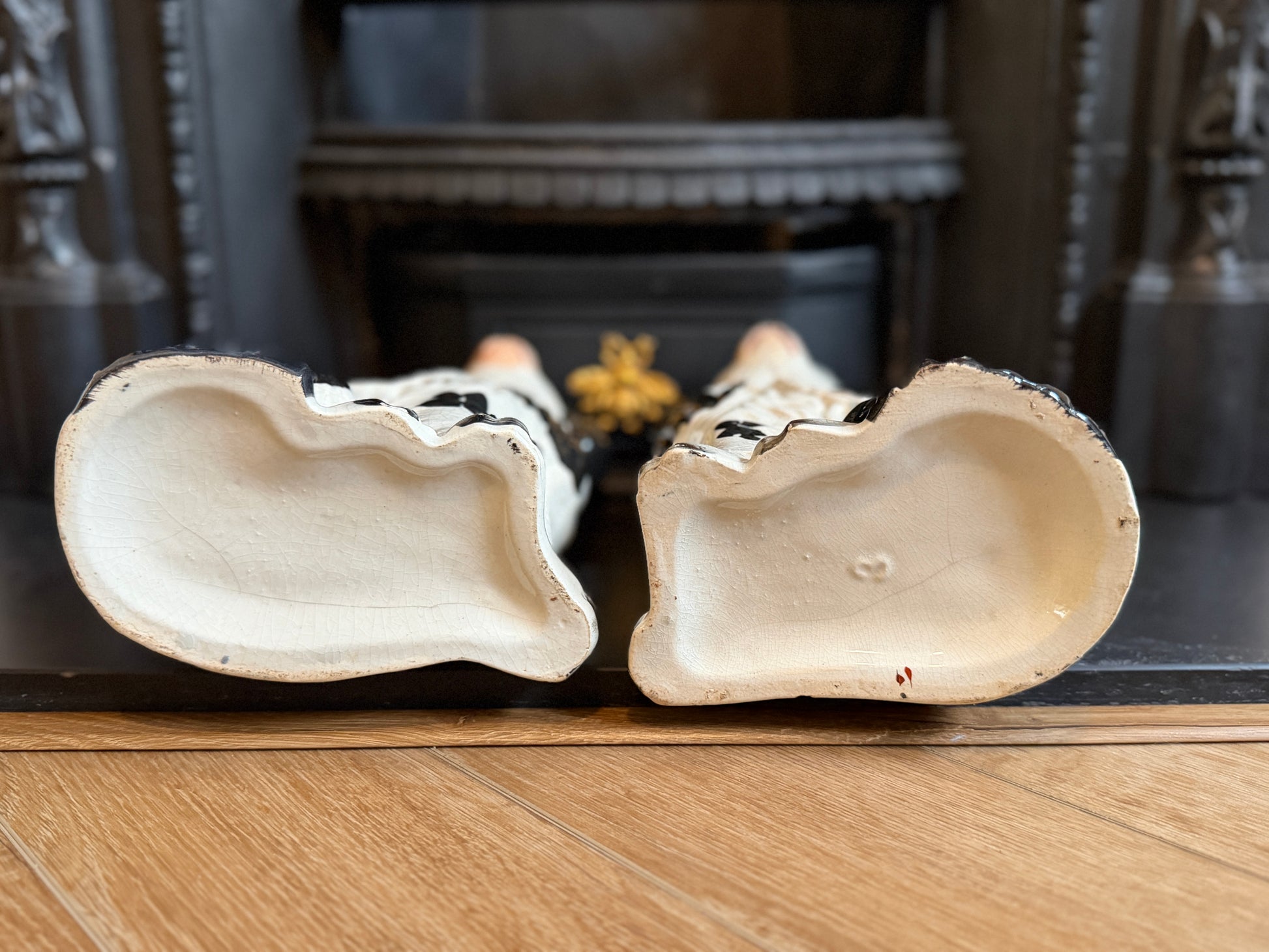 一体の背面にごく小さなチップが見られます(写真参照)。また、底部には焼成時に生じたヘアラインのようなfiring marks(窯跡)が見られますが、19世紀のスタッフォードシャー陶器にはよく見られるものです。約175年という時代を考えると、全体として非常に美しく、安心して飾っていただける状態です。