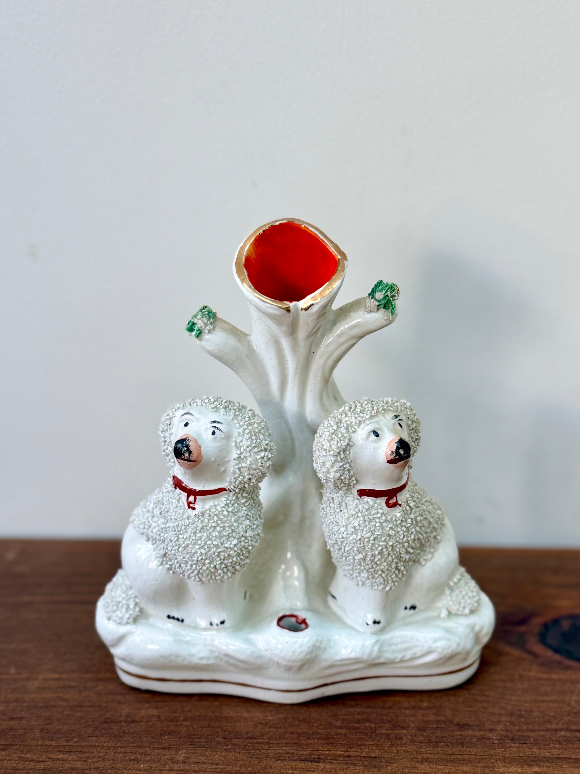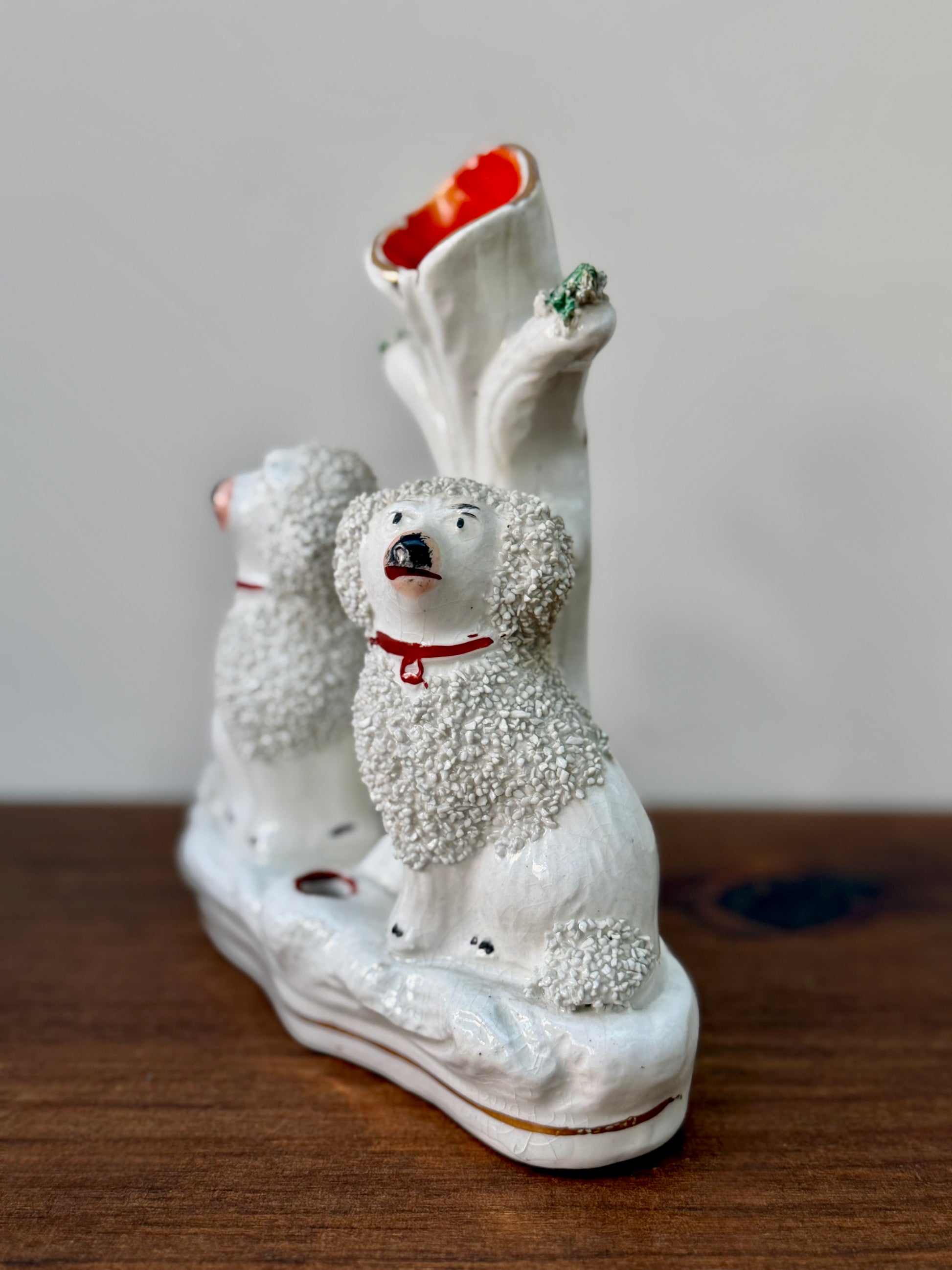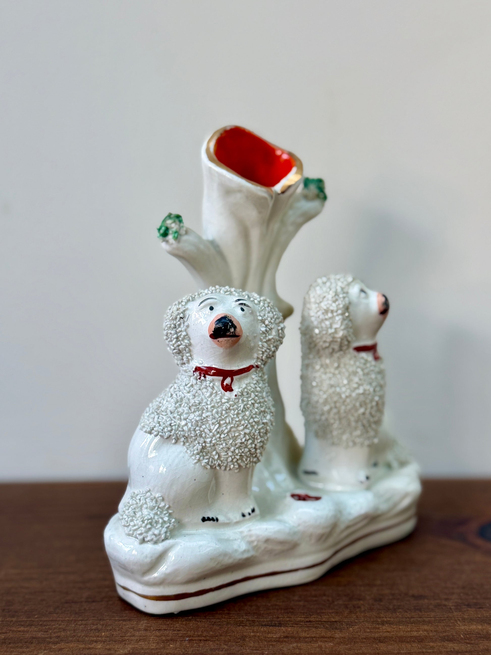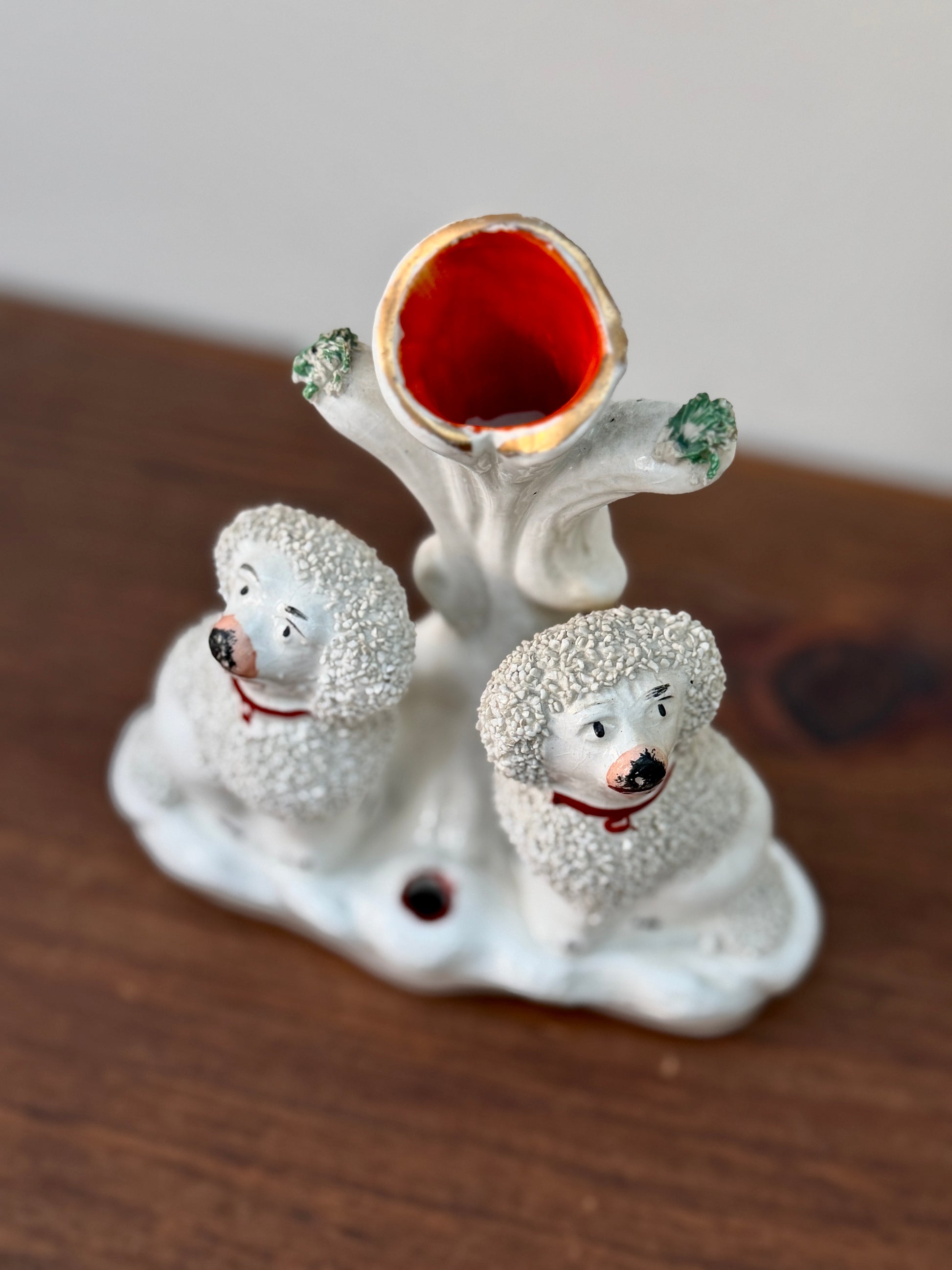 プードルのペアが仲良く並んで座った、イギリスらしい佇まいのアンティーク・スピルベースです。ふんわりとした毛並みの立体感や、優しい表情のハンドペイントが愛らしく、小ぶりながら存在感のあるアイテムです。