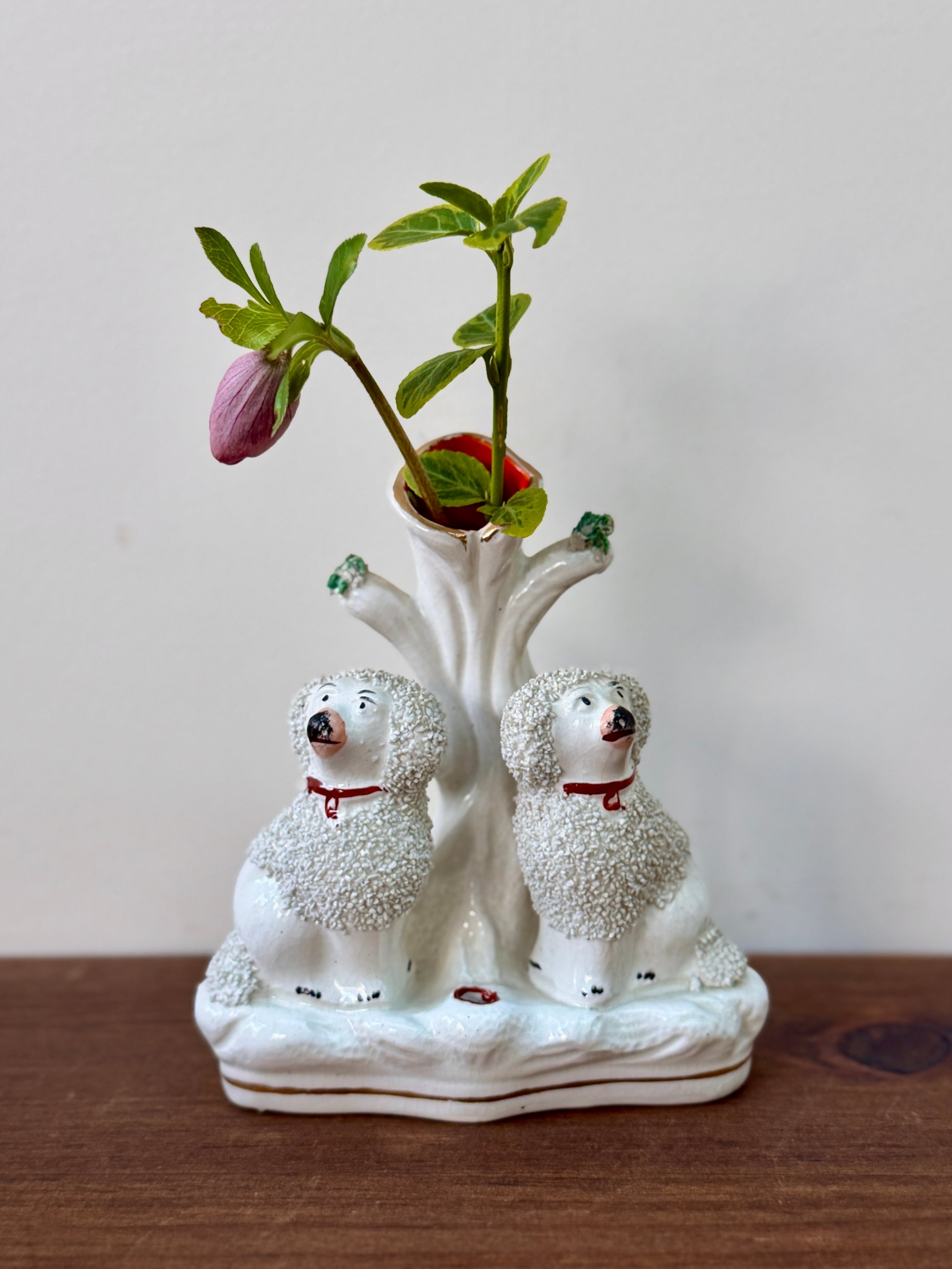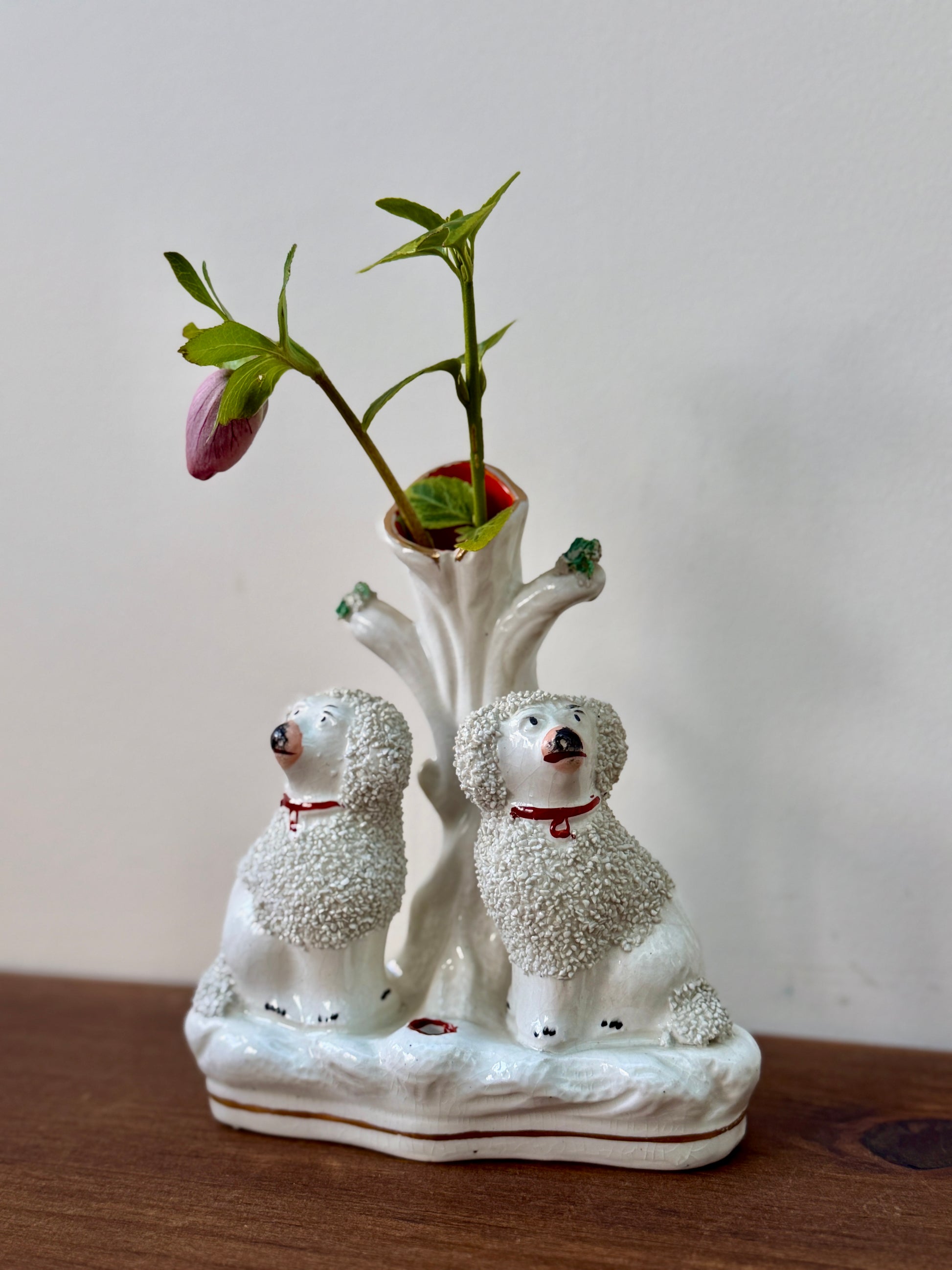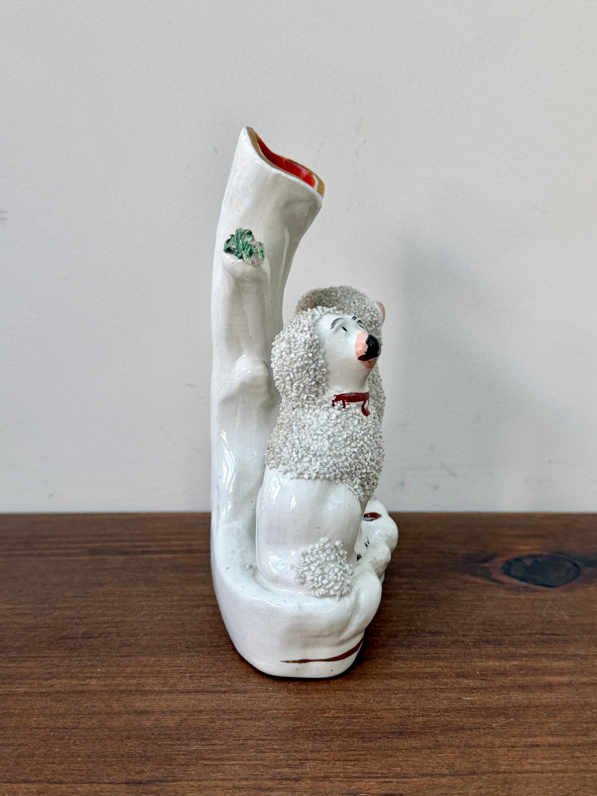 プードルのペアが仲良く並んで座った、イギリスらしい佇まいのアンティーク・スピルベースです。ふんわりとした毛並みの立体感や、優しい表情のハンドペイントが愛らしく、小ぶりながら存在感のあるアイテムです。