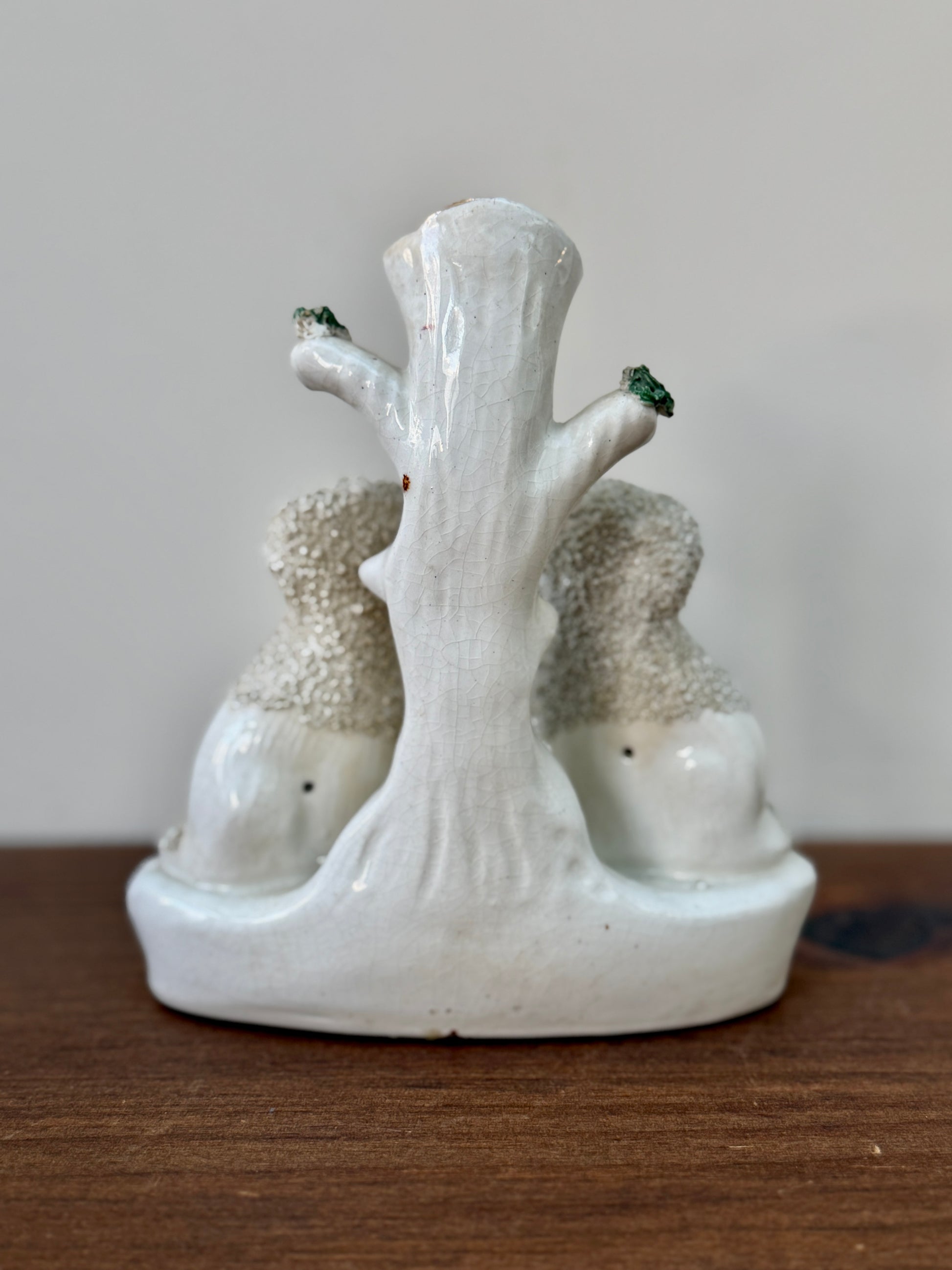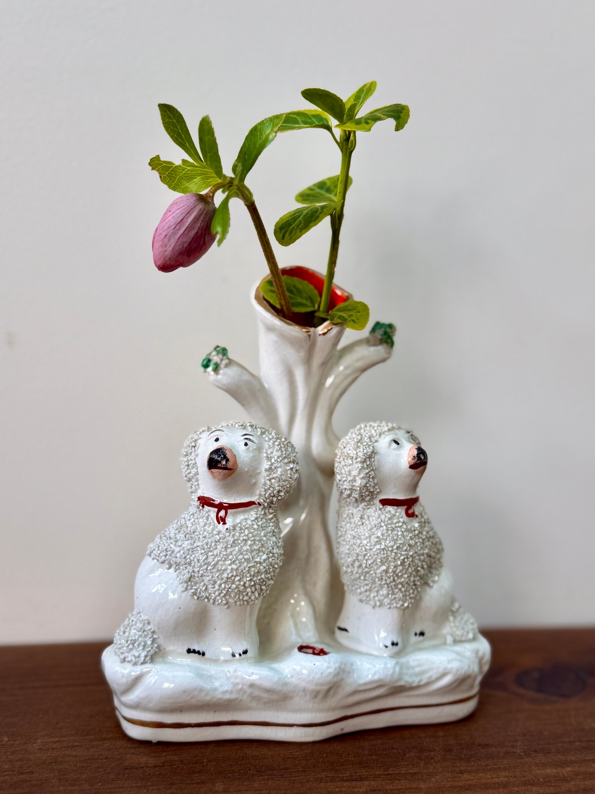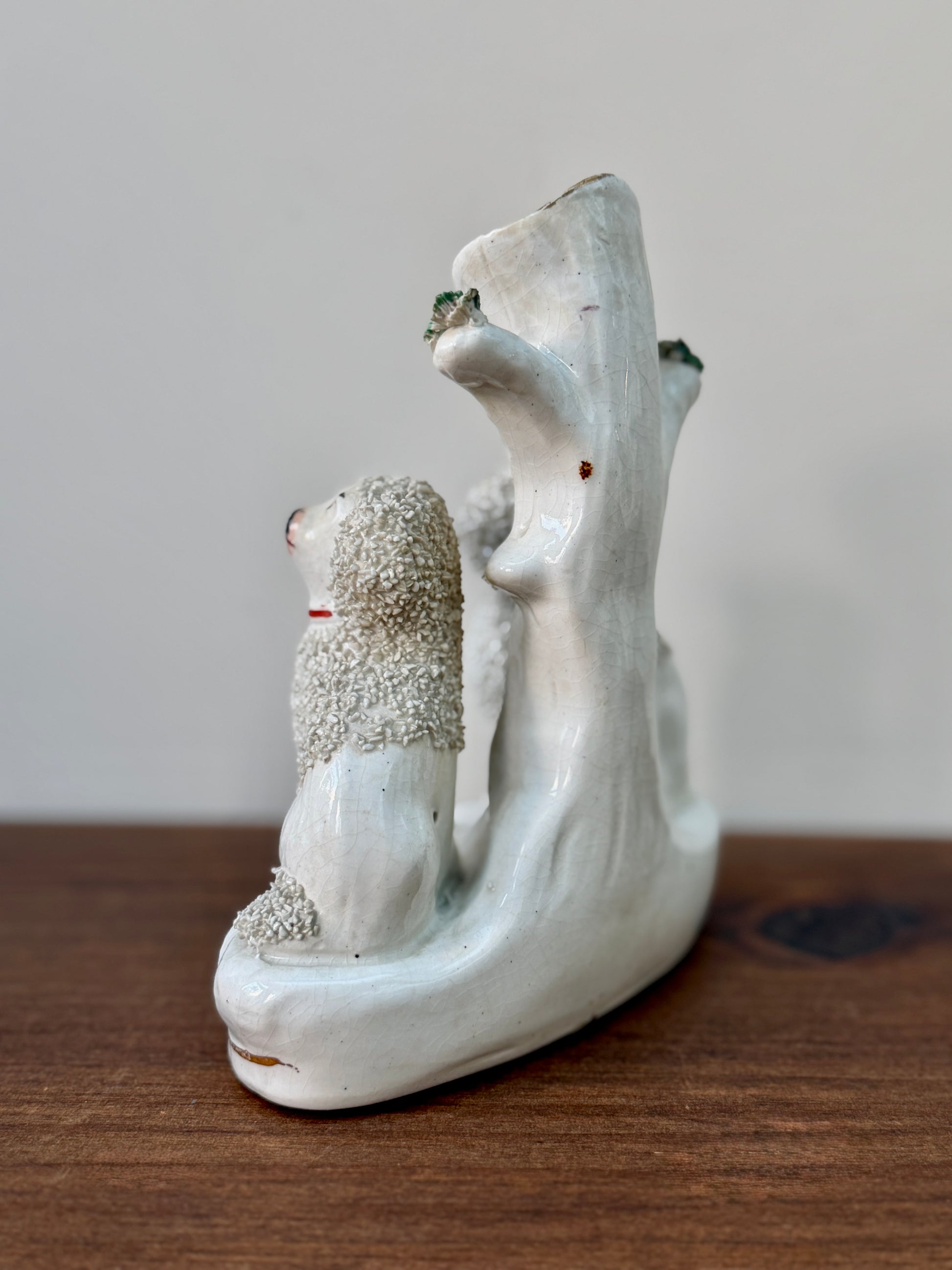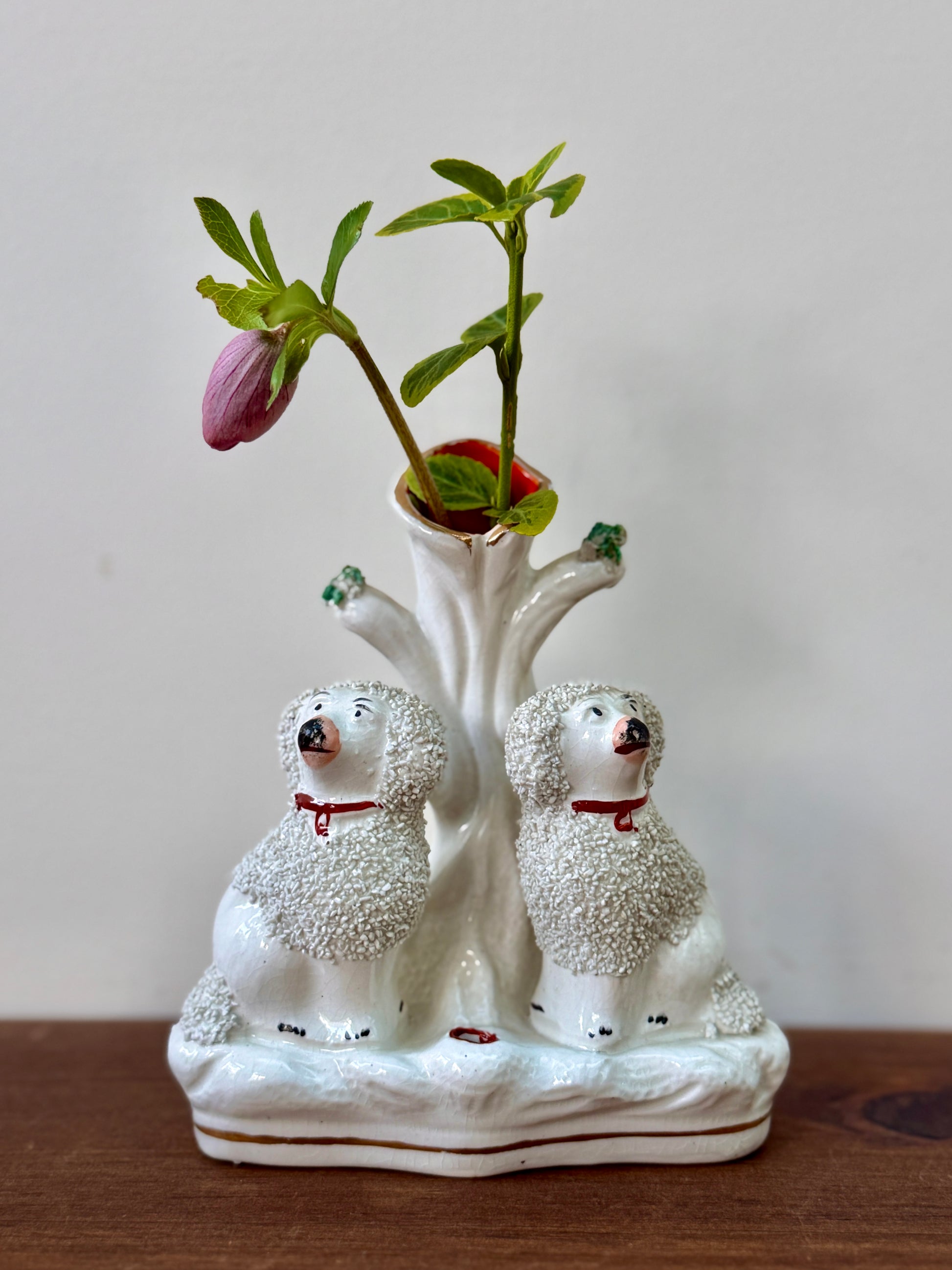 プードルのペアが仲良く並んで座った、イギリスらしい佇まいのアンティーク・スピルベースです。ふんわりとした毛並みの立体感や、優しい表情のハンドペイントが愛らしく、小ぶりながら存在感のあるアイテムです。