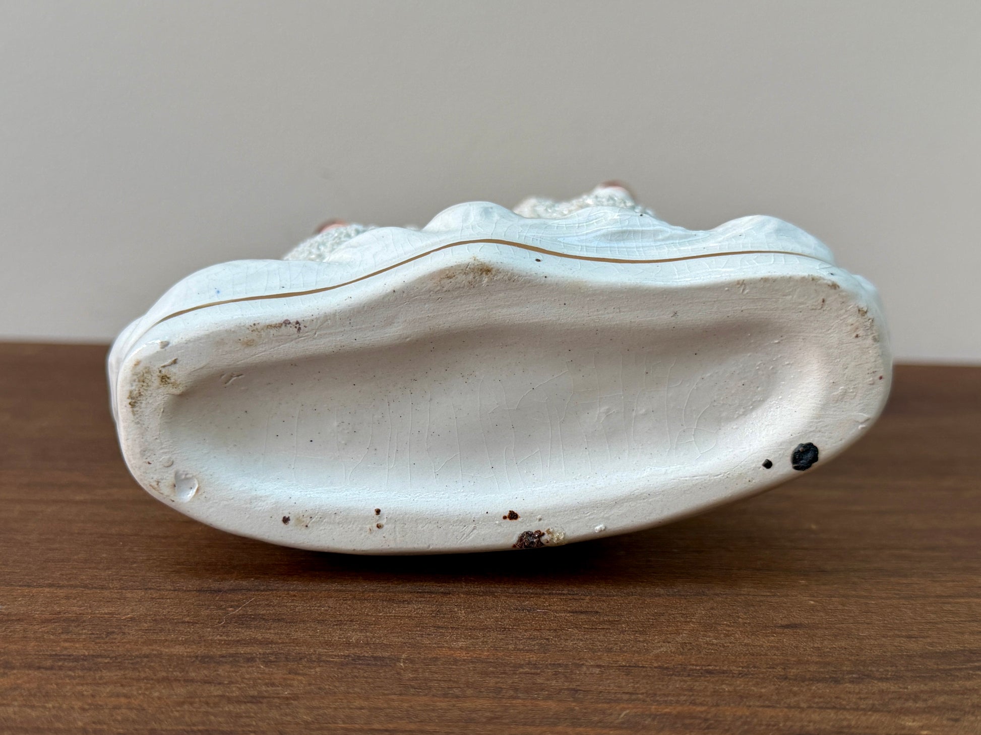 全体的に落ち着いた色合いで、アンティーク陶器らしい釉薬の表情が見られます。飾ったときの印象も美しく、インテリアに取り入れやすいコンディションです。底部には当時の焼成に伴う自然な跡が見られます。