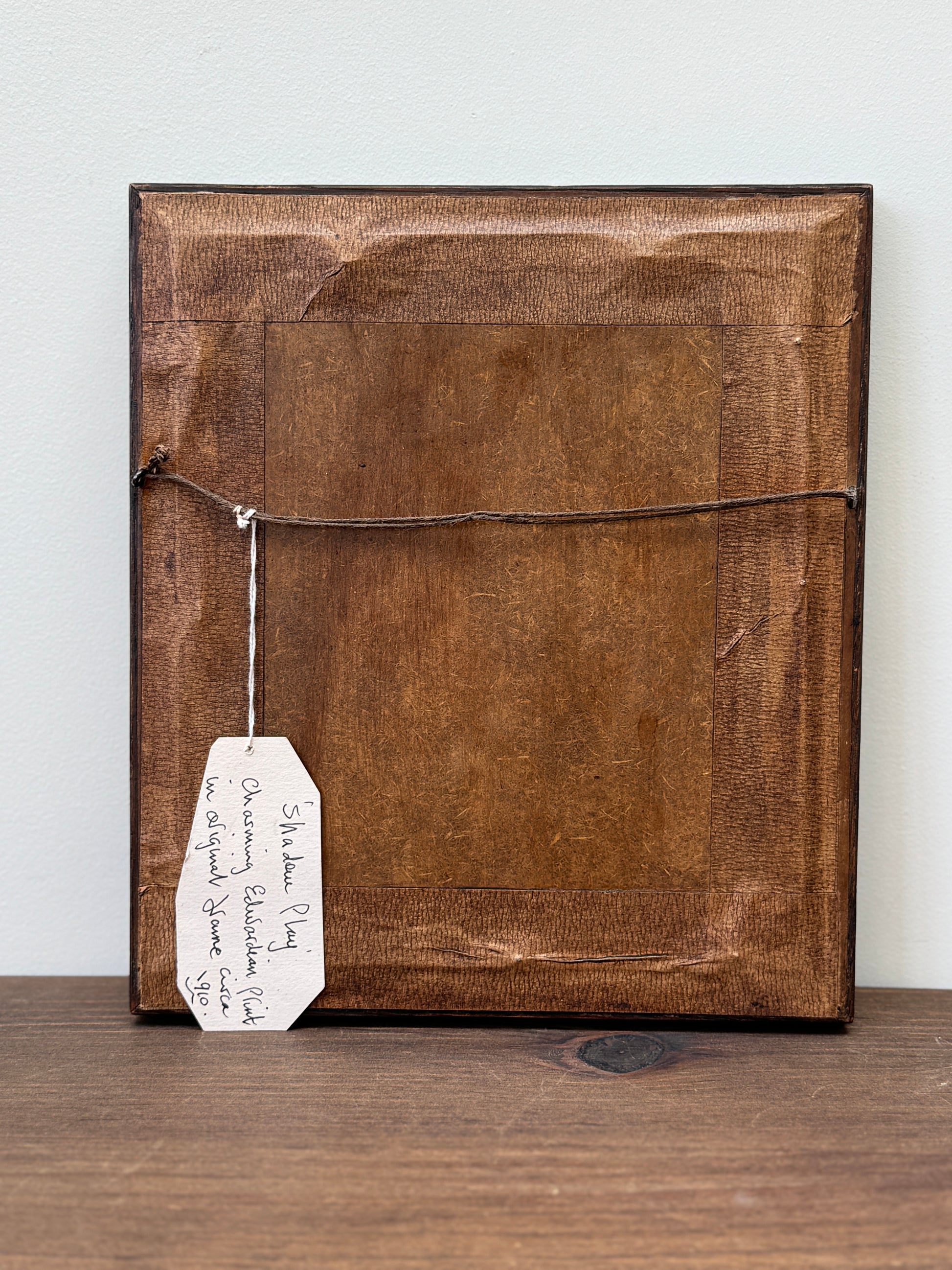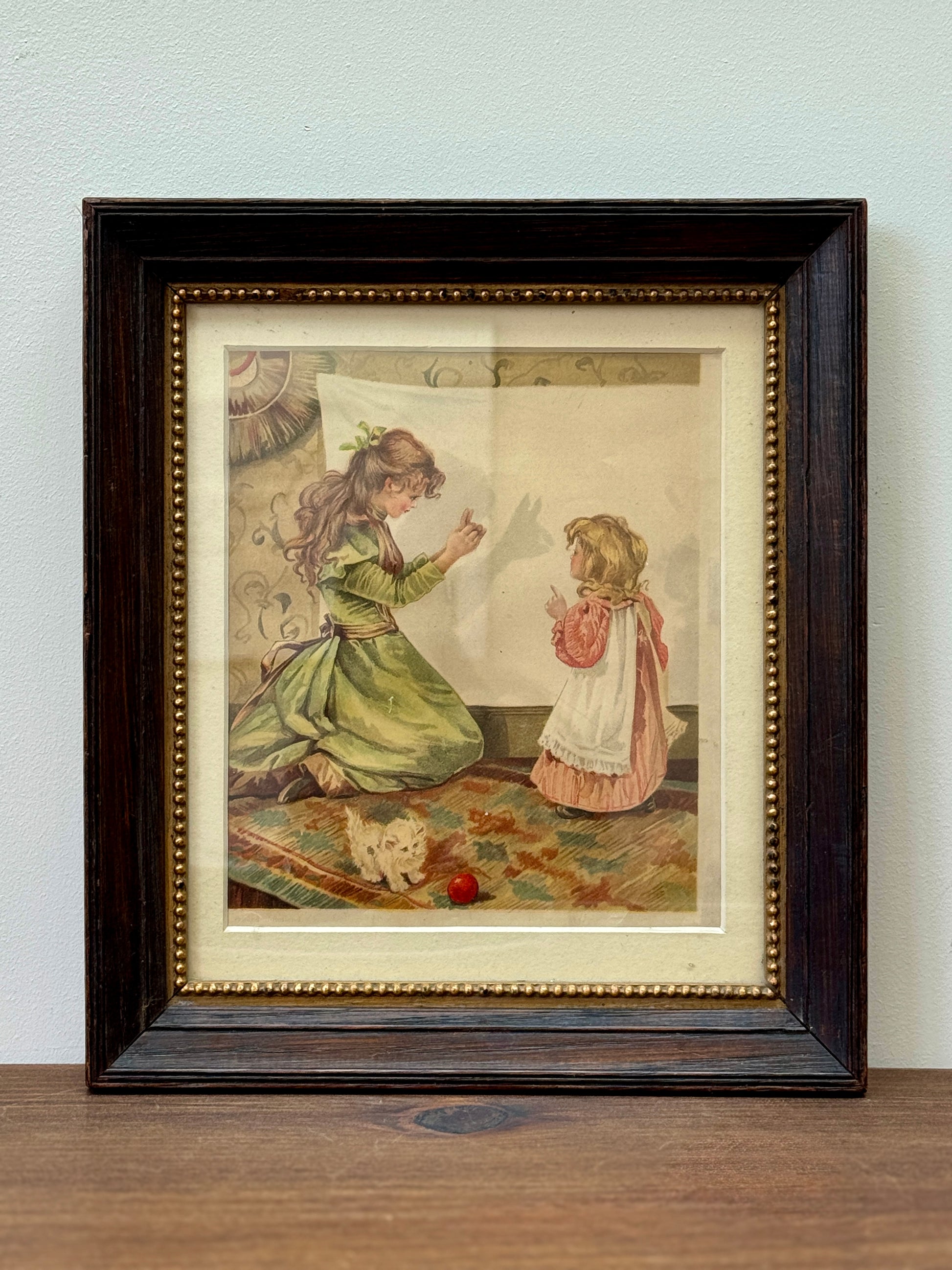 こちらは、エドワード朝時代(約1910年頃)に描かれた「シャドウ・プレイ」のプリント作品で、オリジナルの木製フレームに収められています。二人の少女が影絵遊びをしている様子が愛らしく描かれ、その足元には猫の姿も。物語を感じさせる温かなシーンが、英国らしい雰囲気を漂わせます。