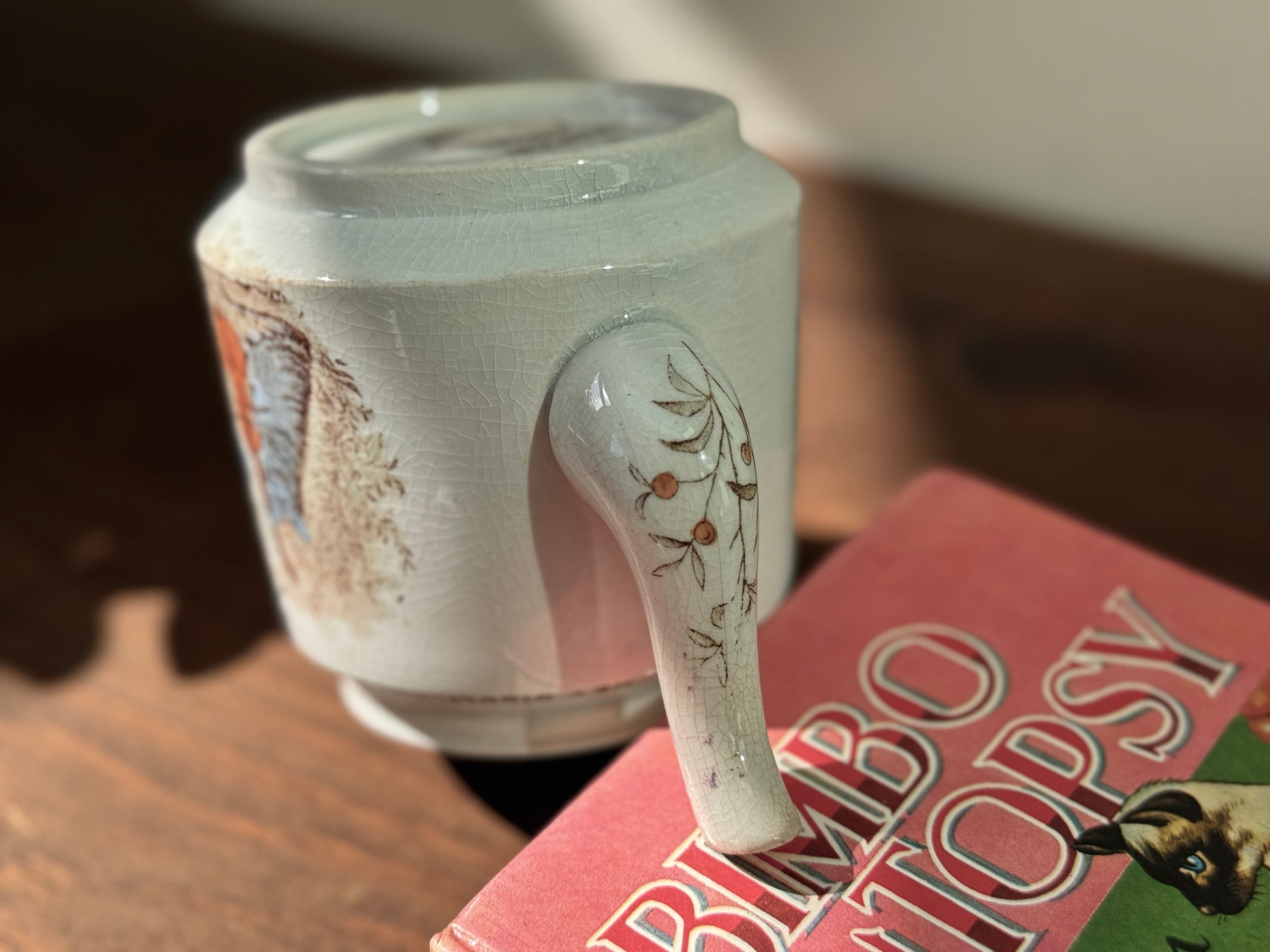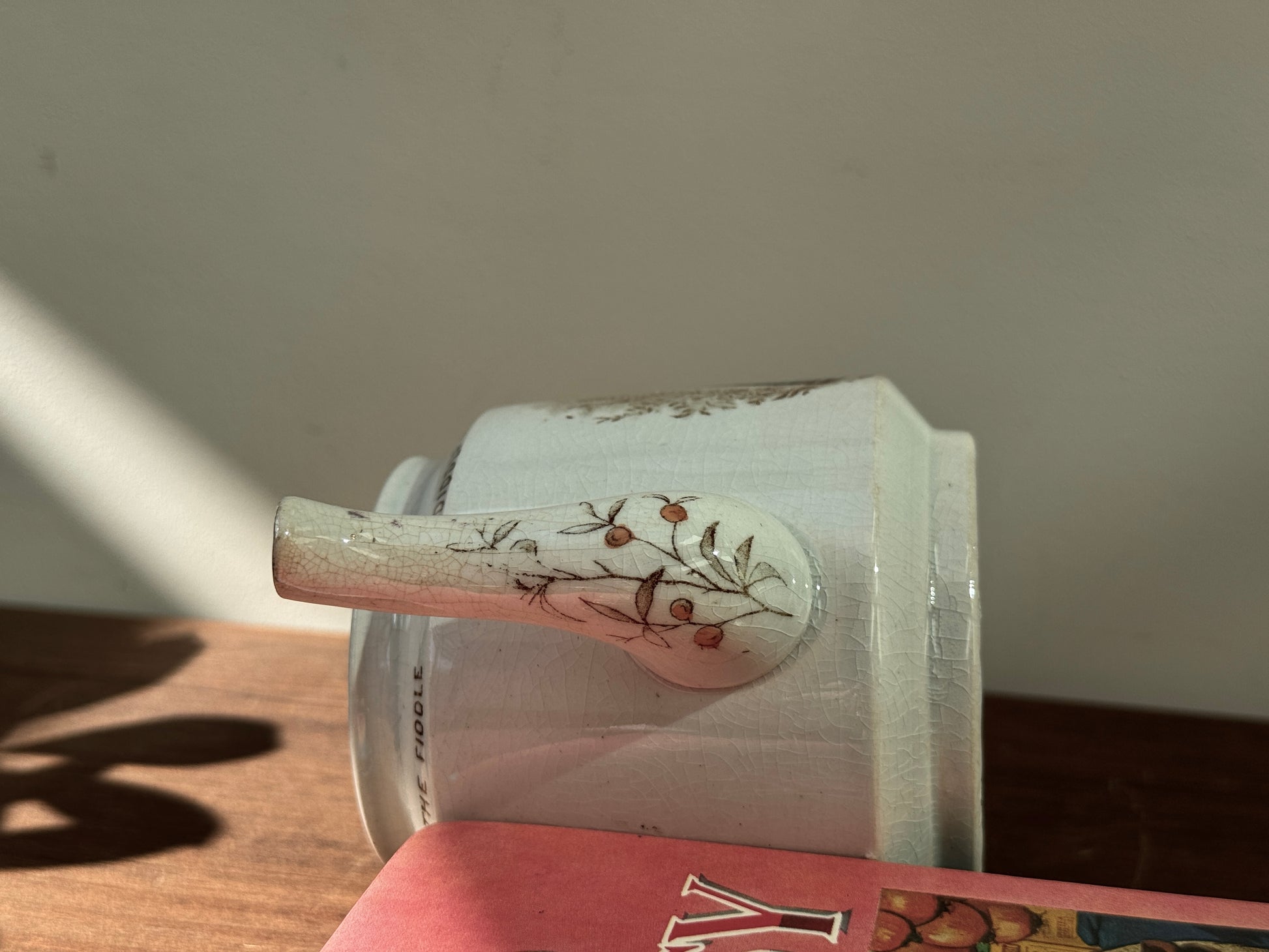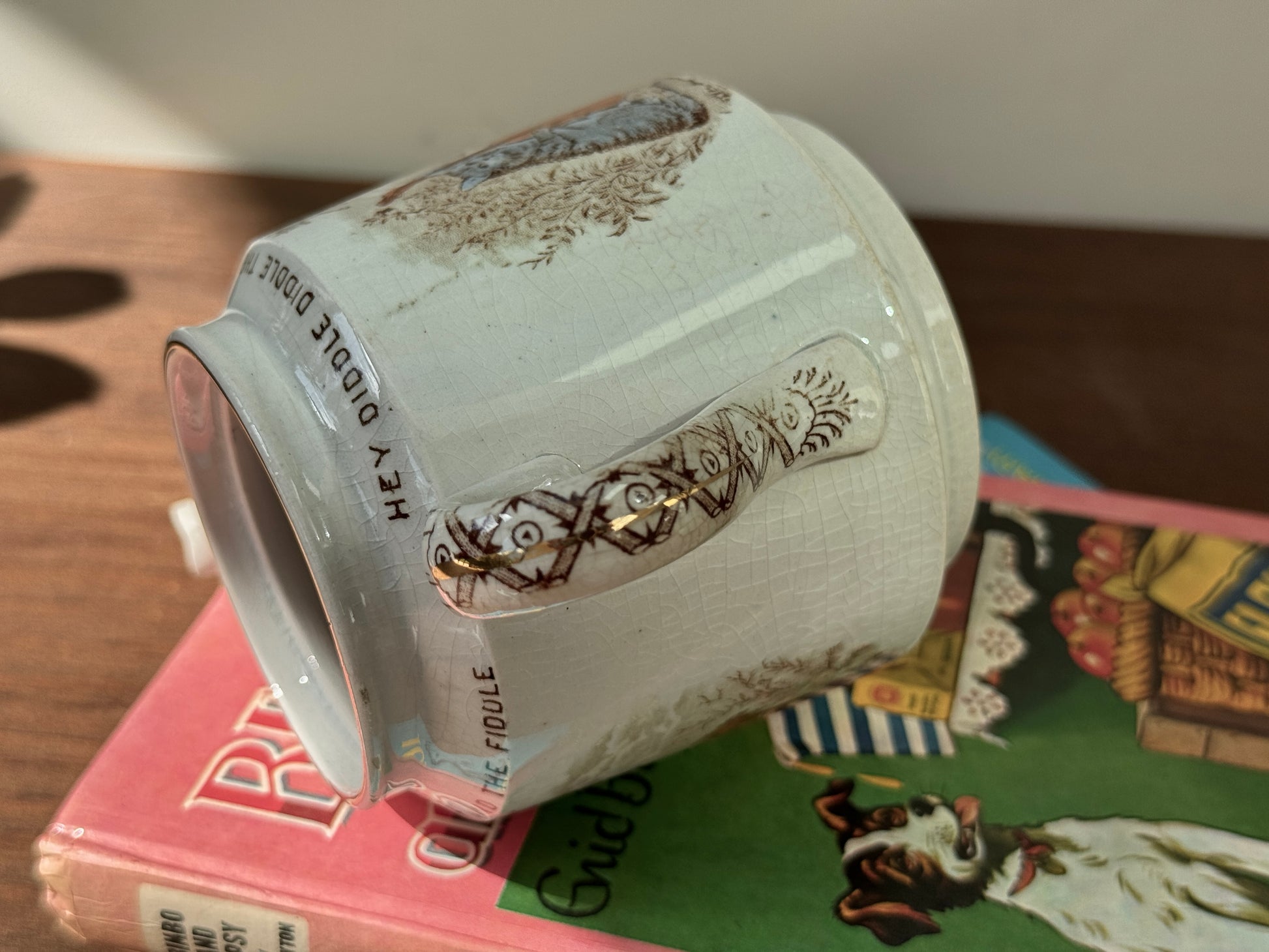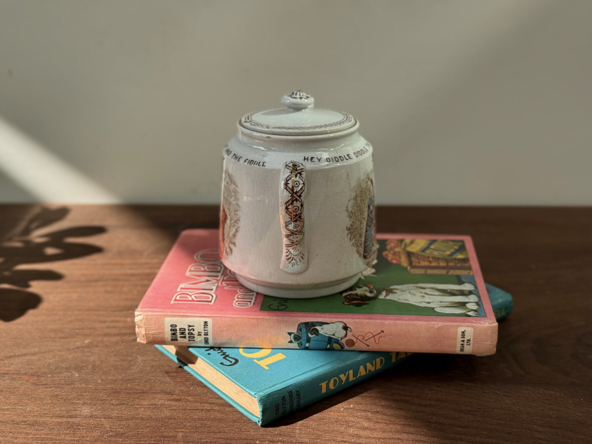 フィドルを弾く猫が主役の、なんとも愛らしいヴィクトリア時代の子供用ティーポットです。英国スタッフォードシャー州ハンリーのウィッタカー社(Whittaker & Co)が手がけたもので、当時人気だったナーサリーライム(童謡)シリーズから「Hey Diddle Diddle」の場面が描かれています。猫の表情や仕草のユーモラスさに、思わず笑みがこぼれそう。