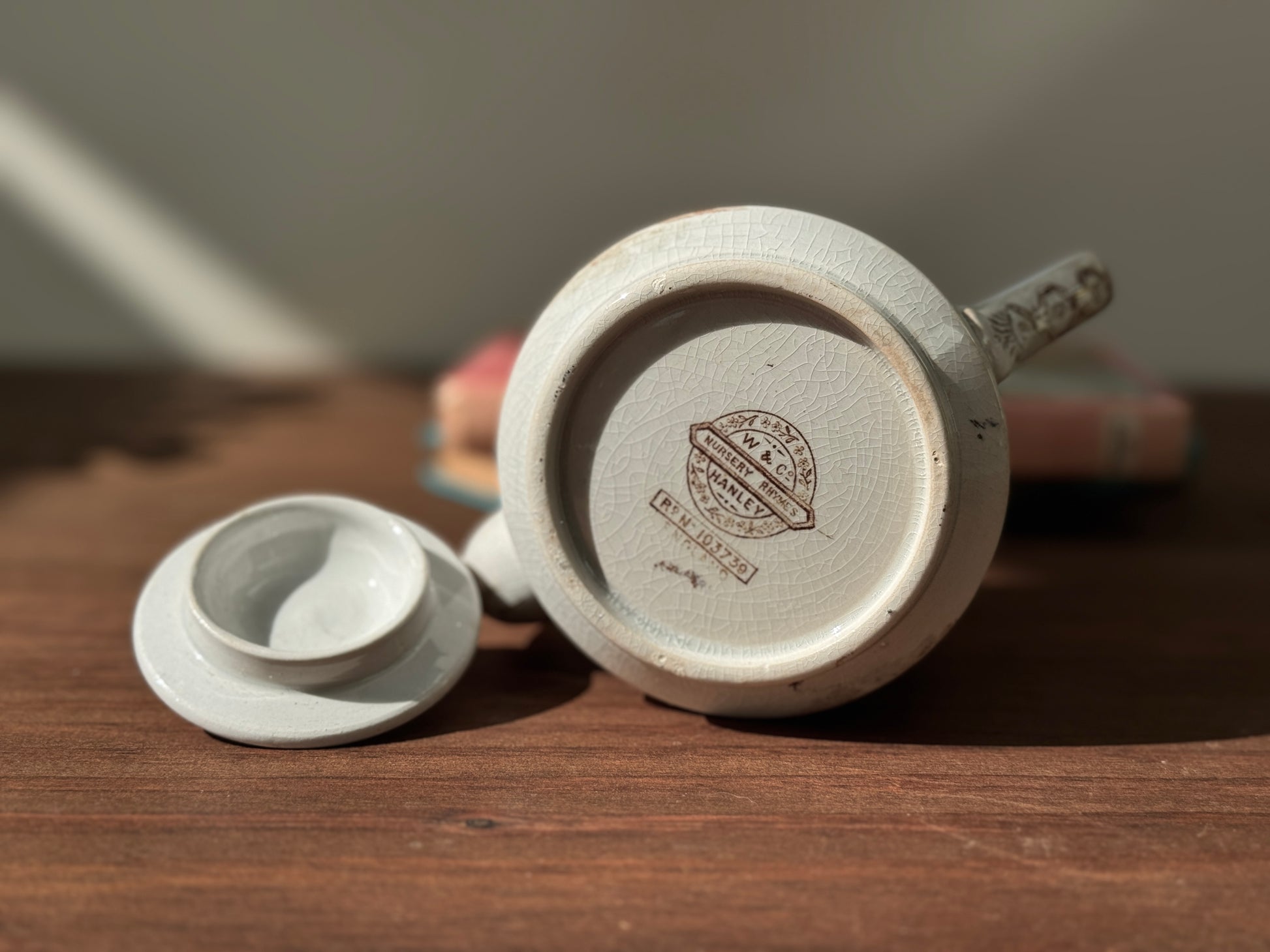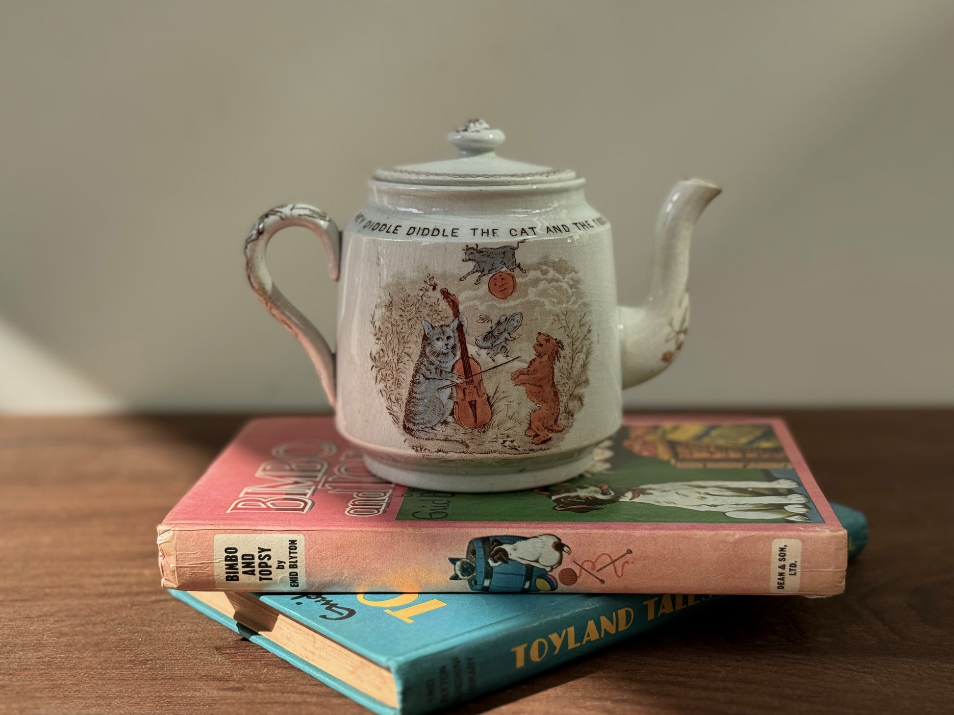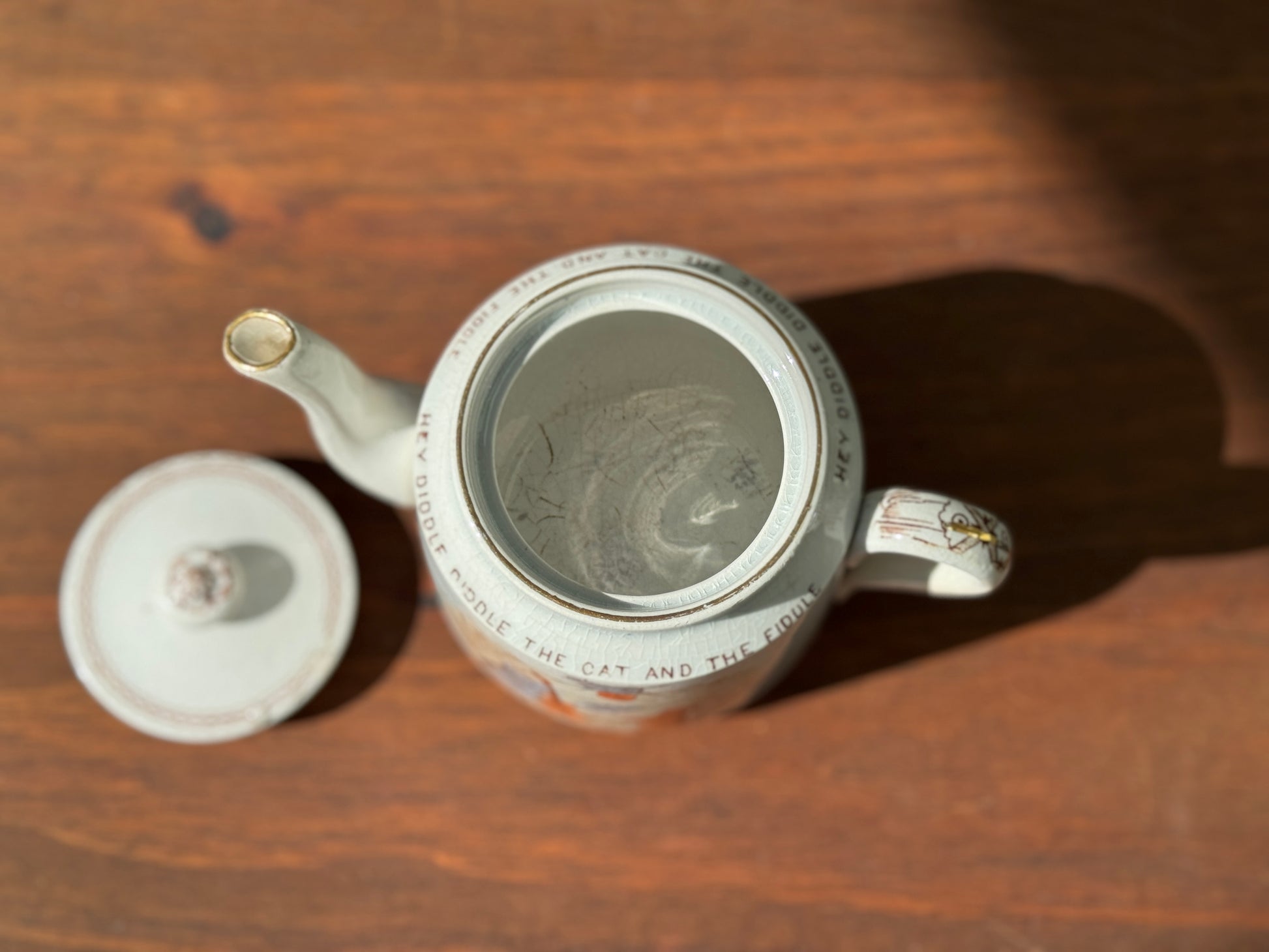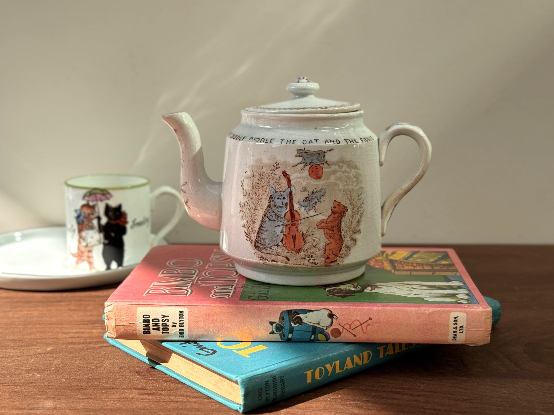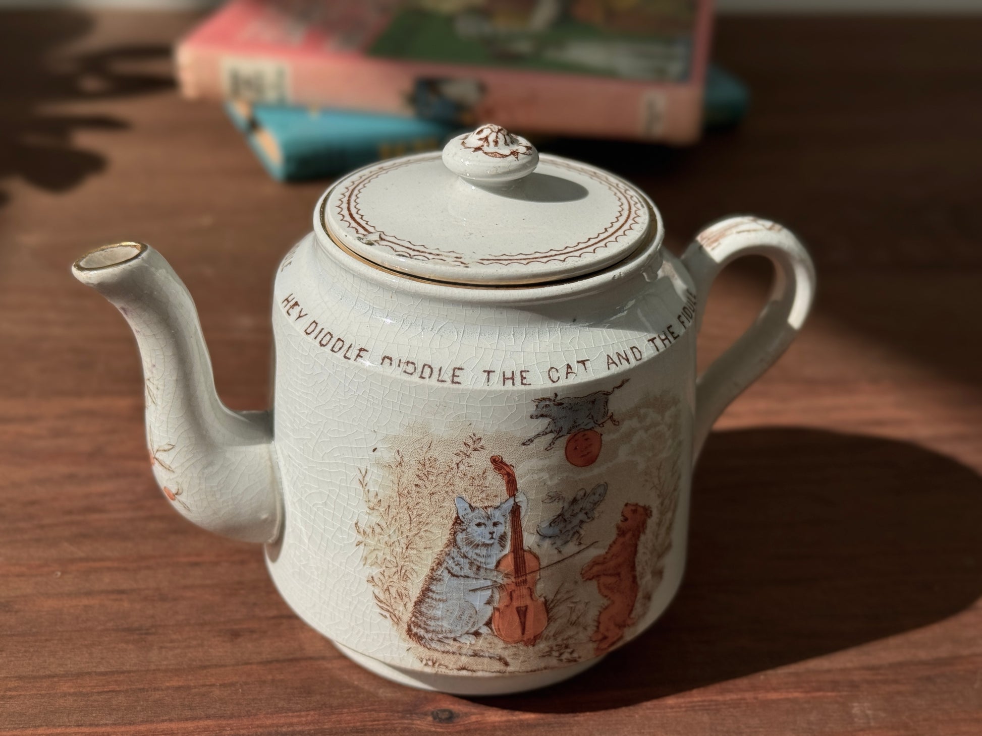 19世紀後期 ヴィクトリア時代の子供用ティーポット 「Hey Diddle Diddle」猫モチーフ|ウィッタカー社(Whittaker & Co)1888年登録デザイン
