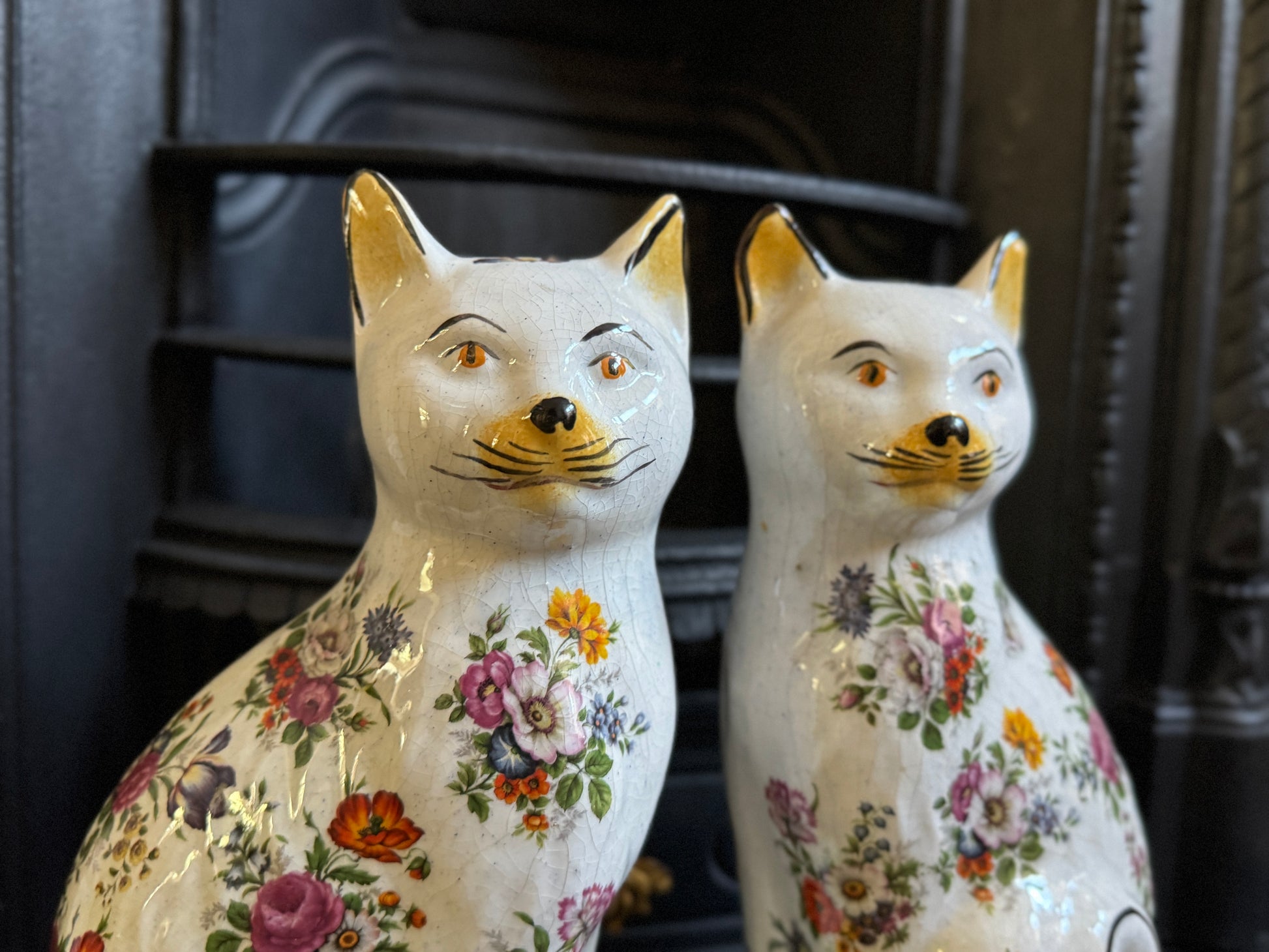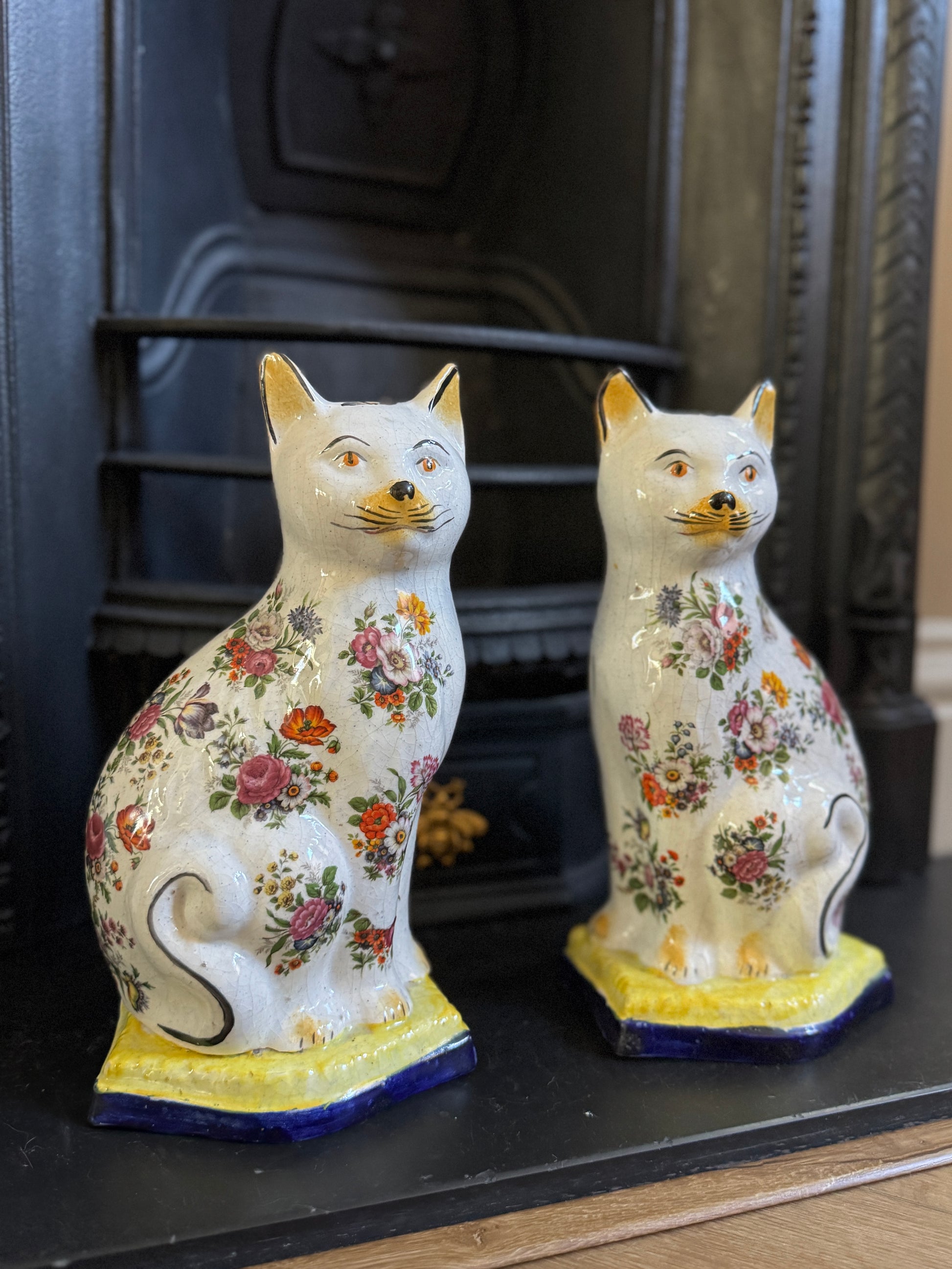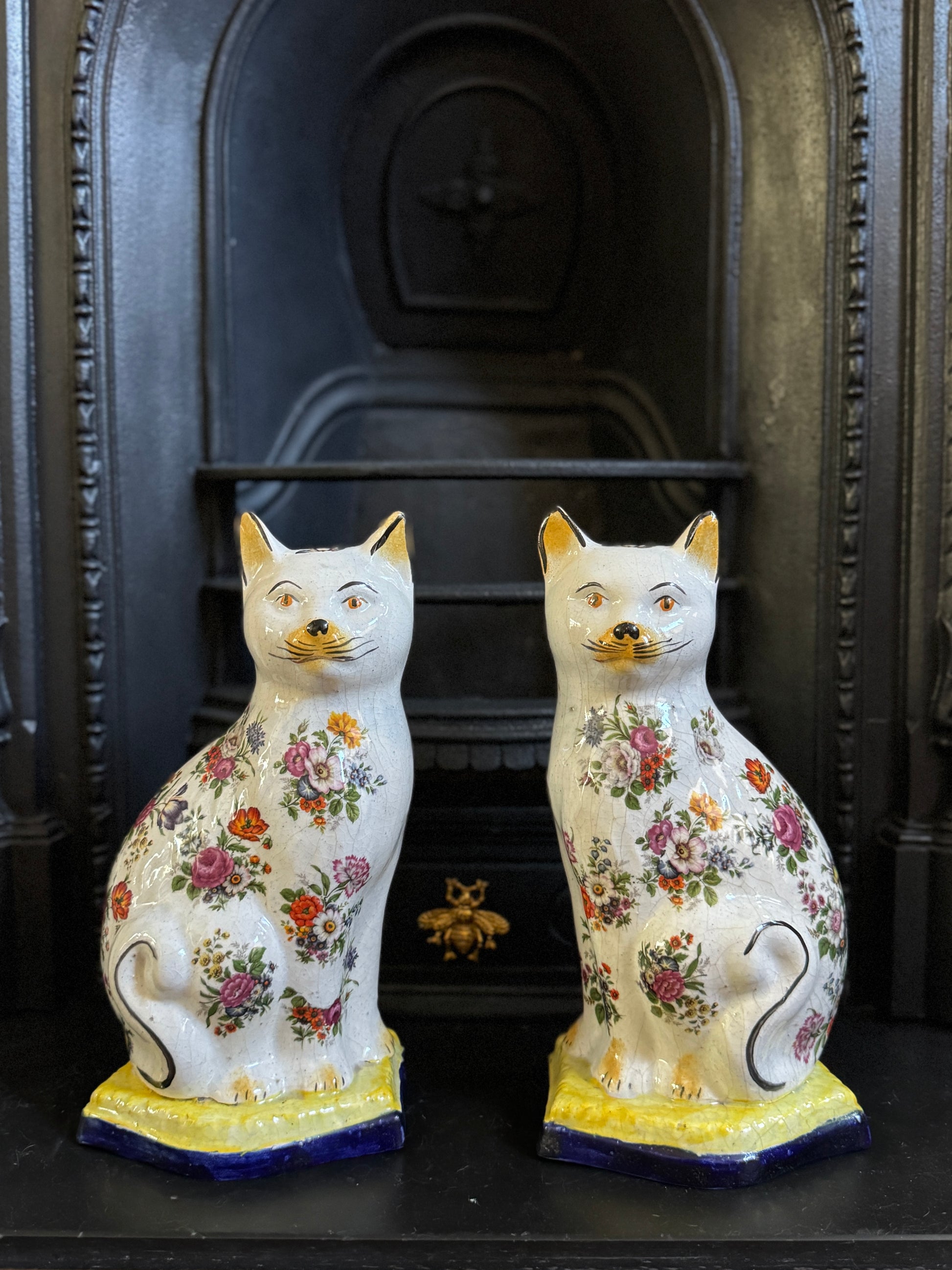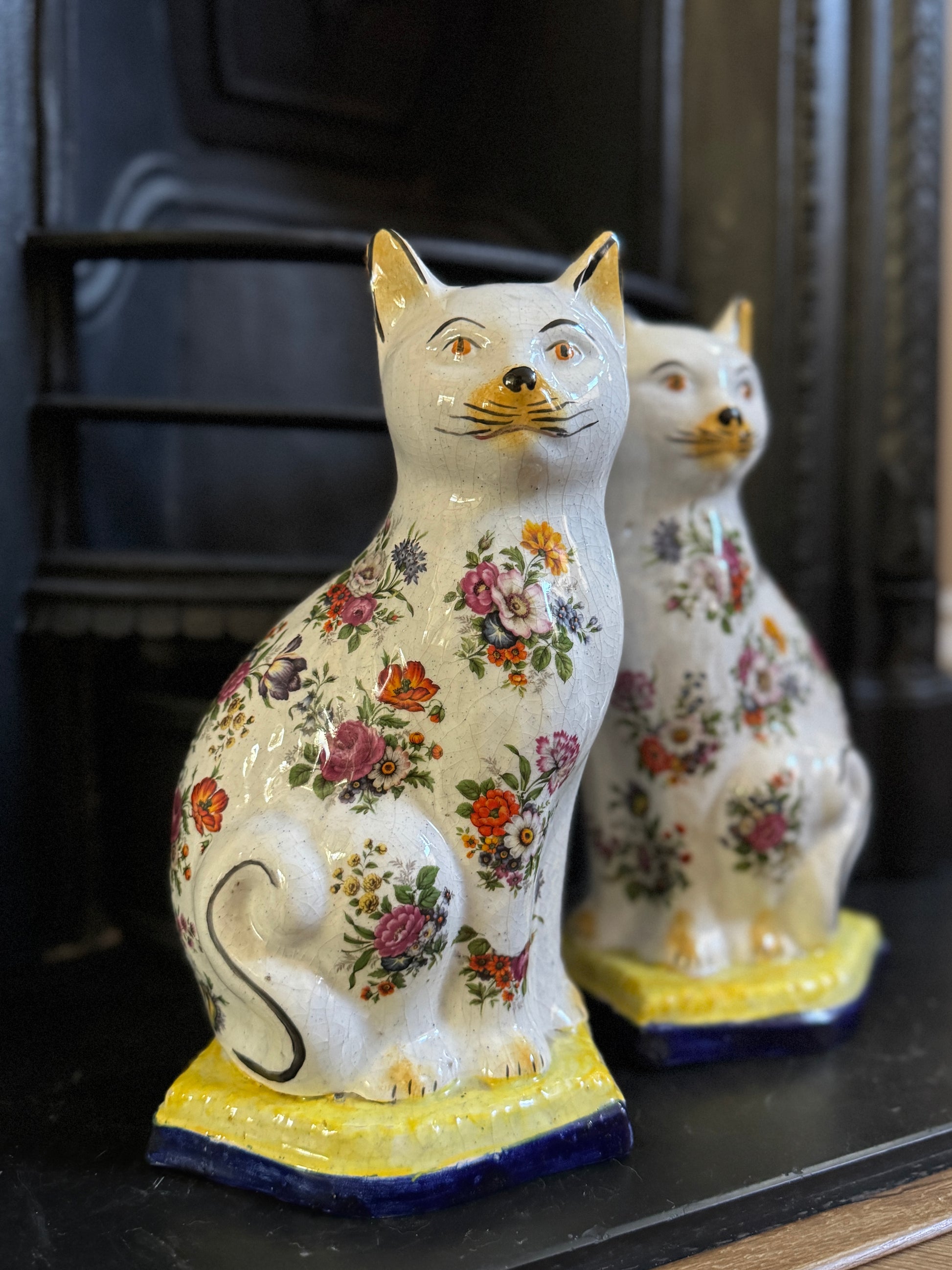 アンティーク、花柄スタッフォードシャーキャット(ペア)|19世紀後期〜20世紀初期頃