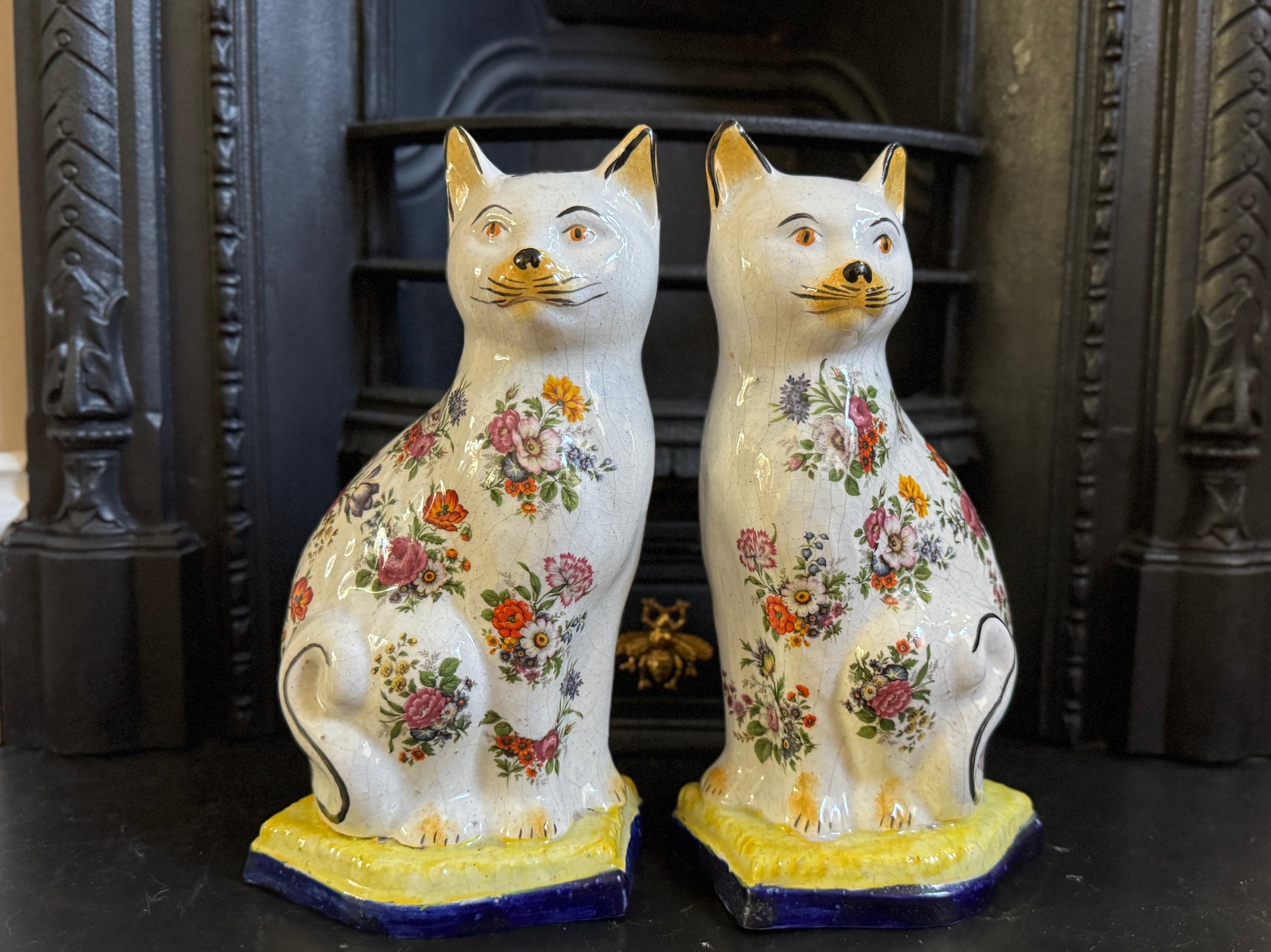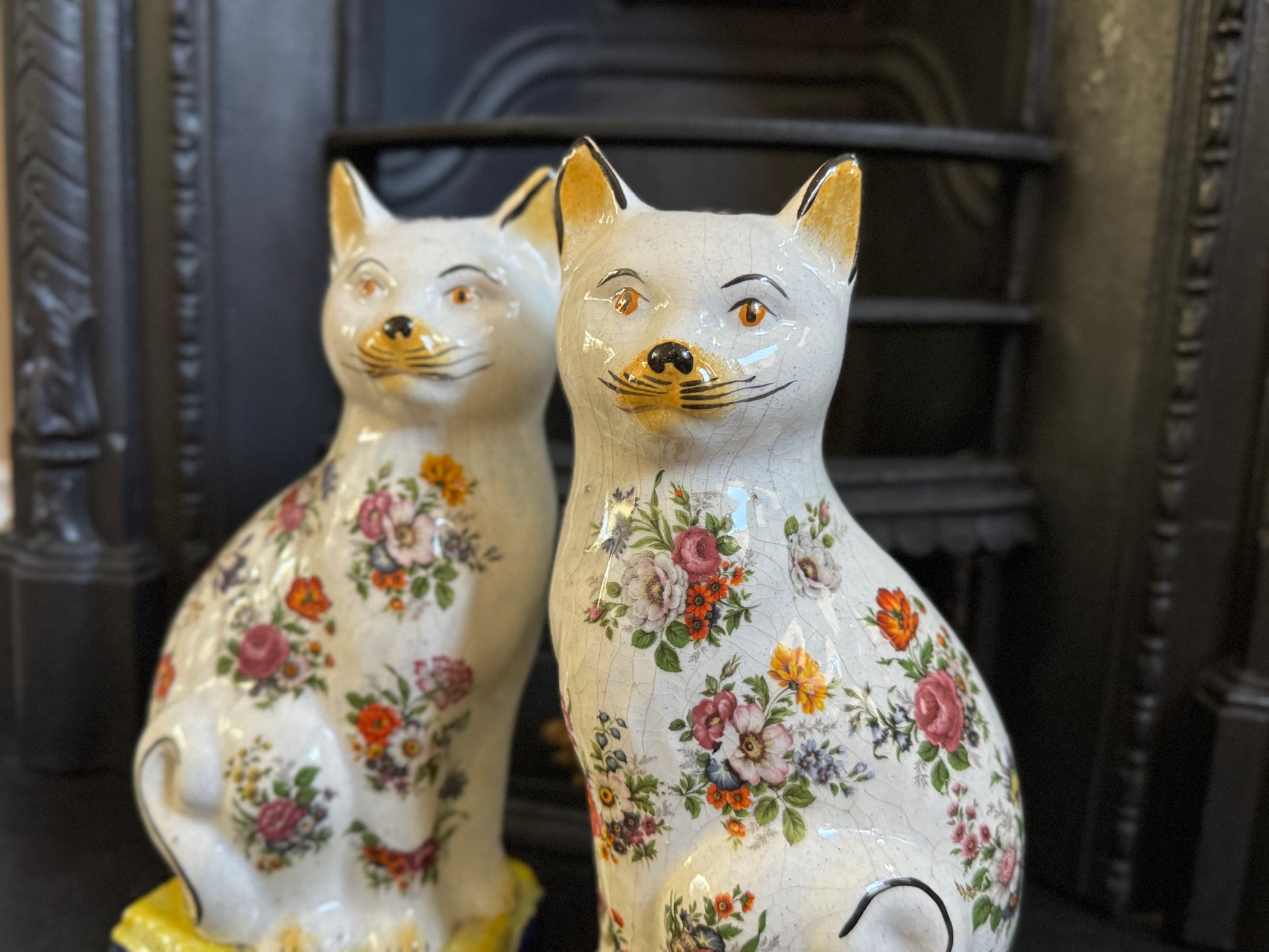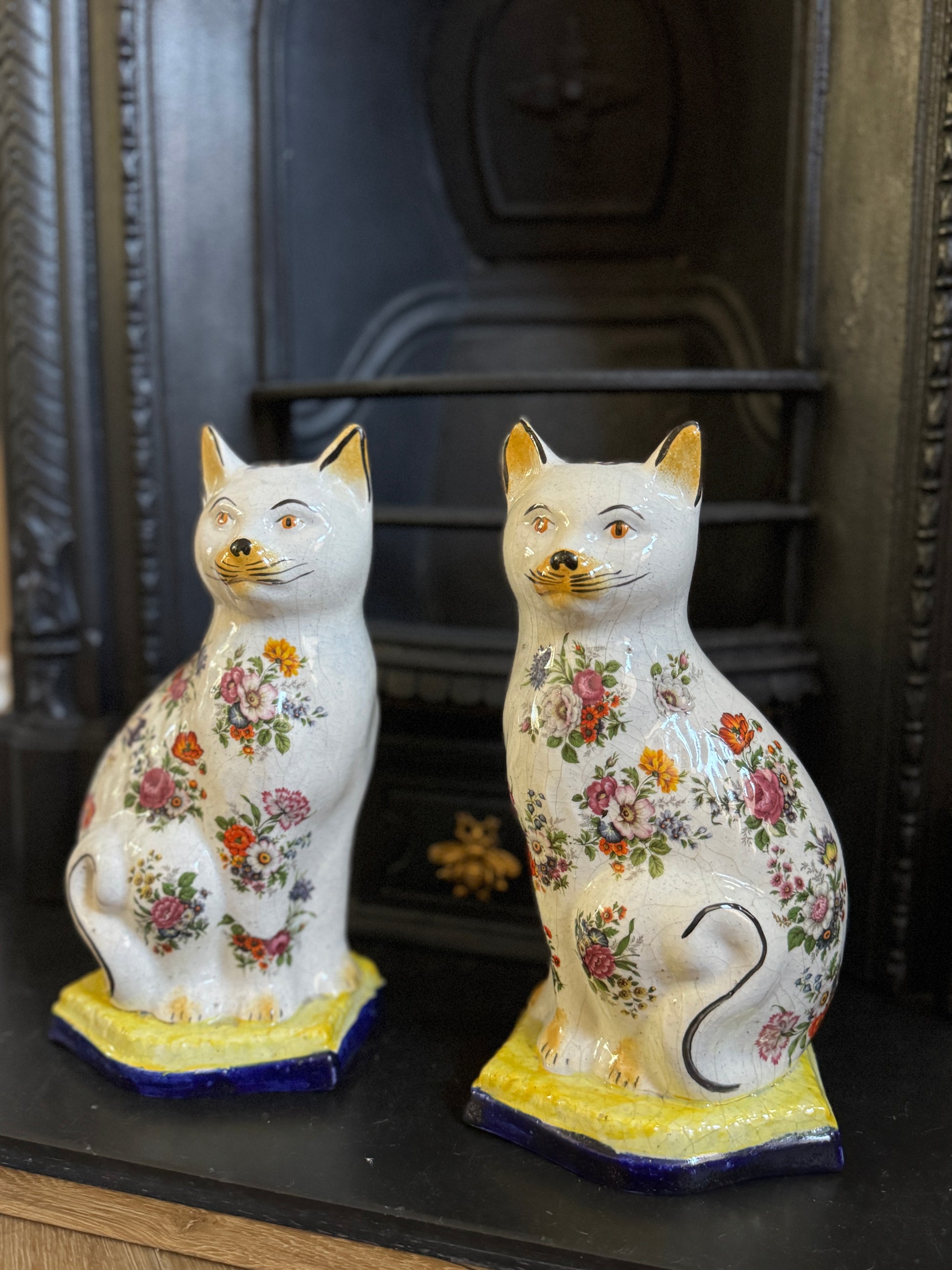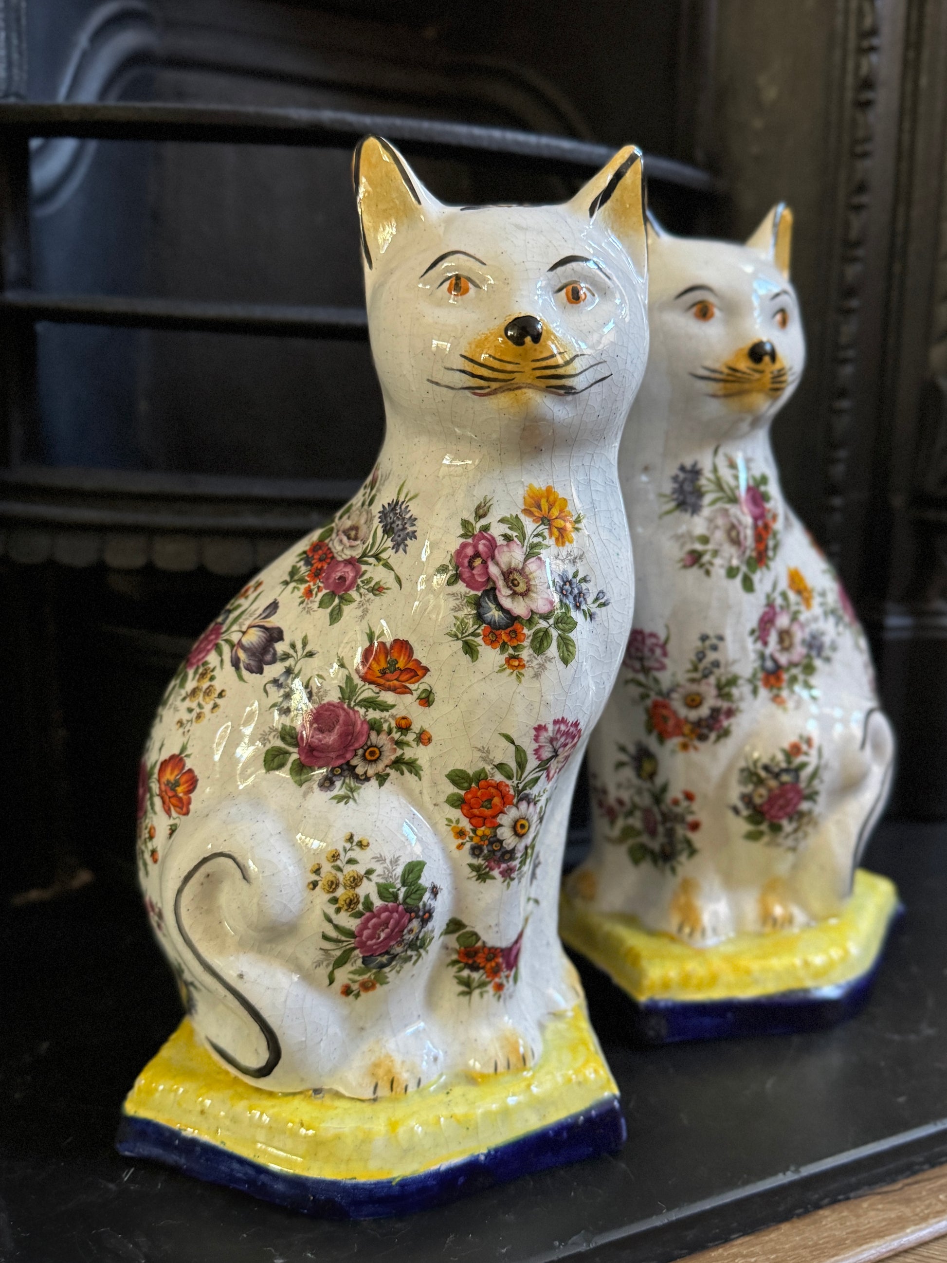 アンティーク、花柄スタッフォードシャーキャット(ペア)|19世紀後期〜20世紀初期頃