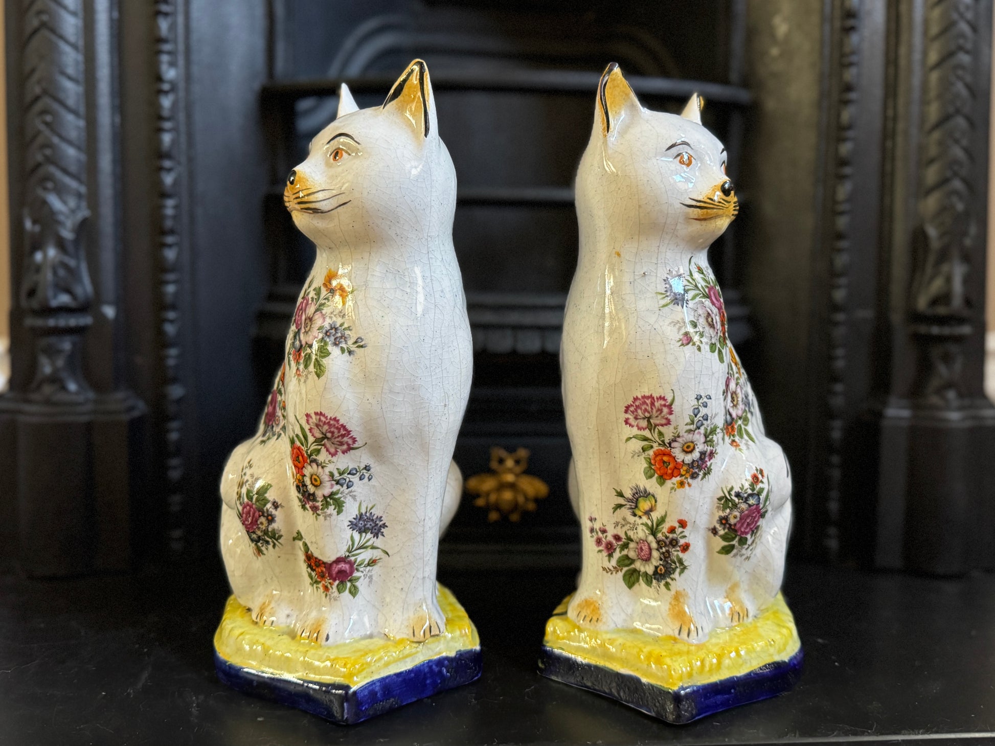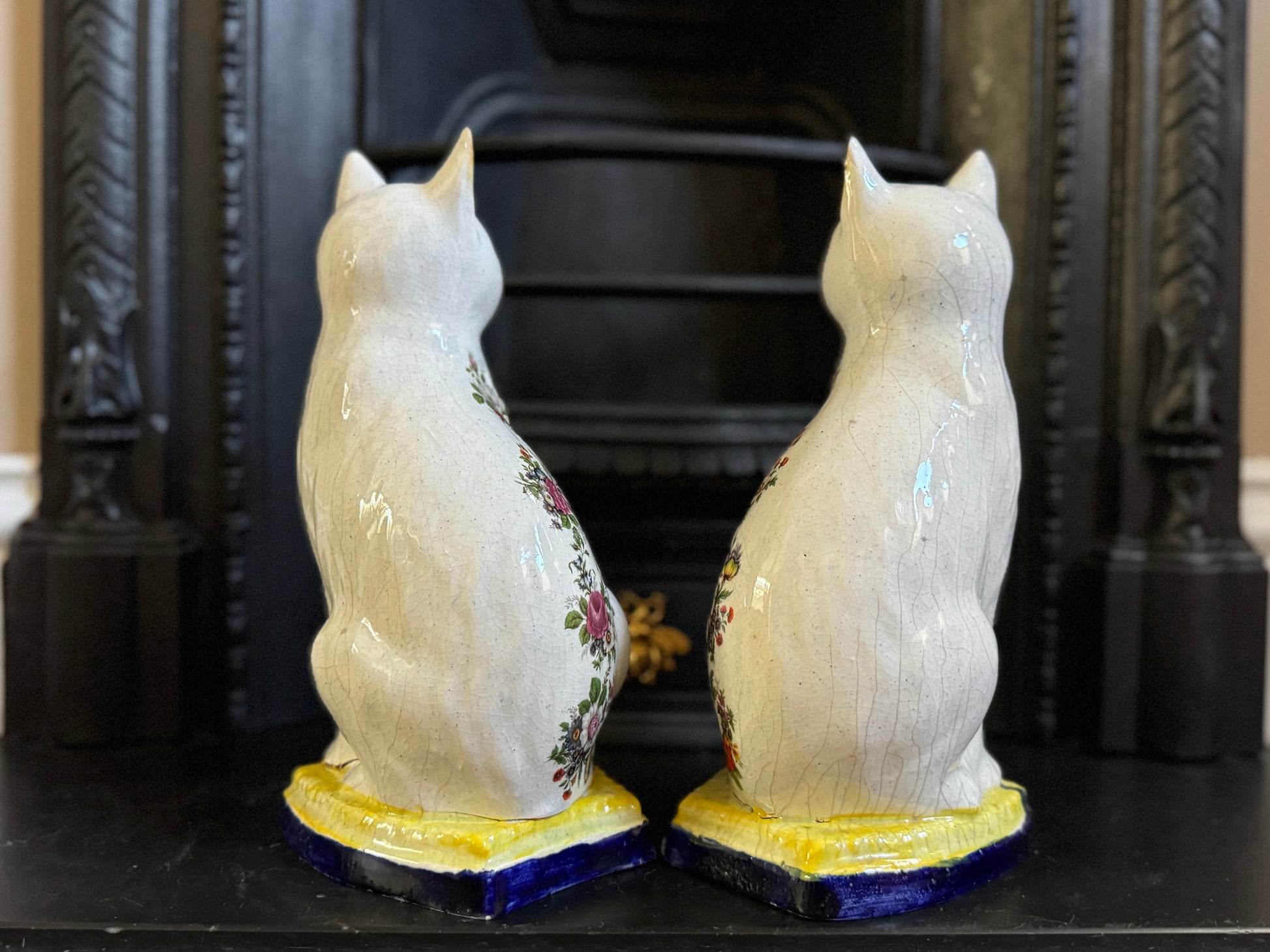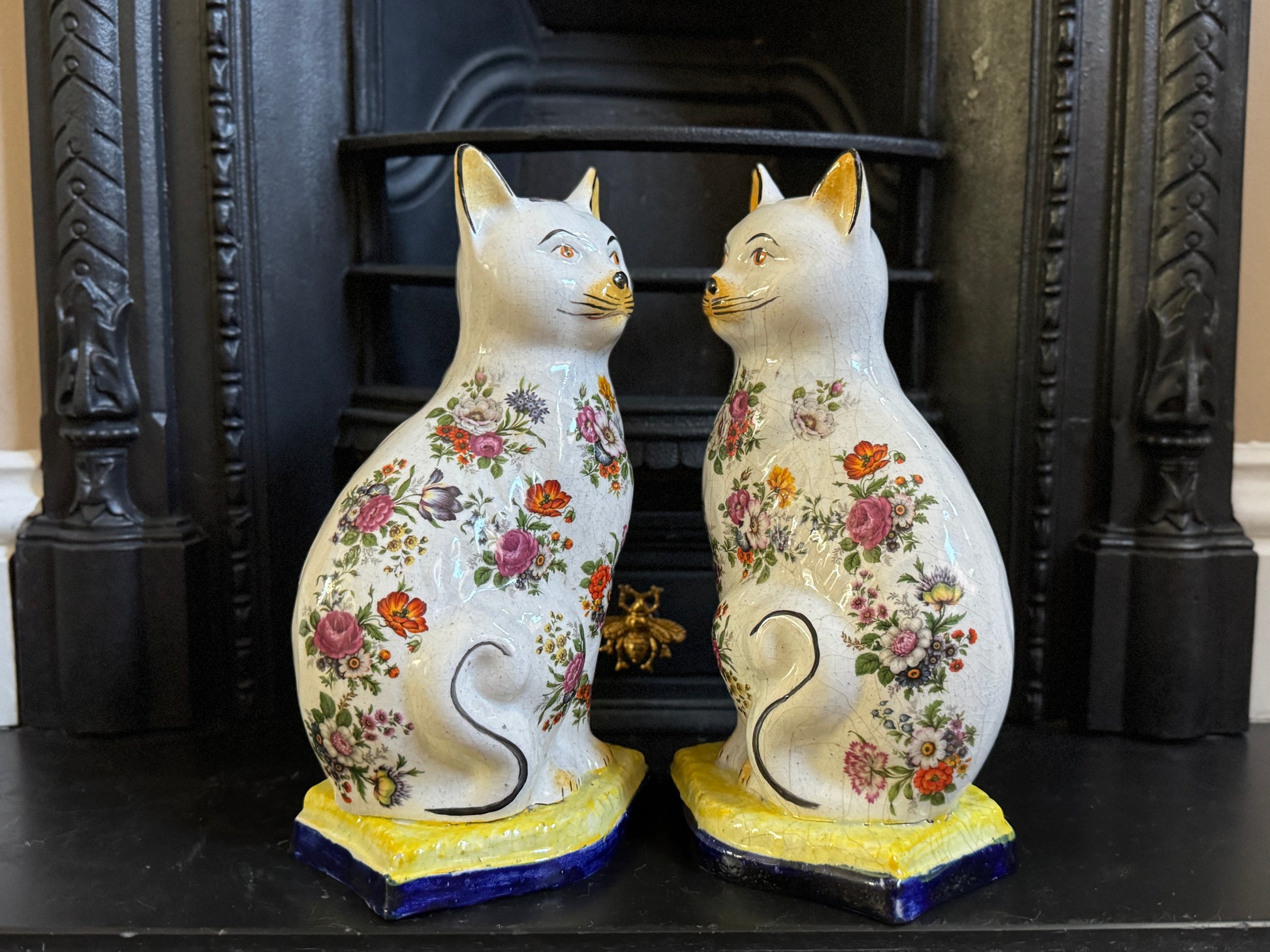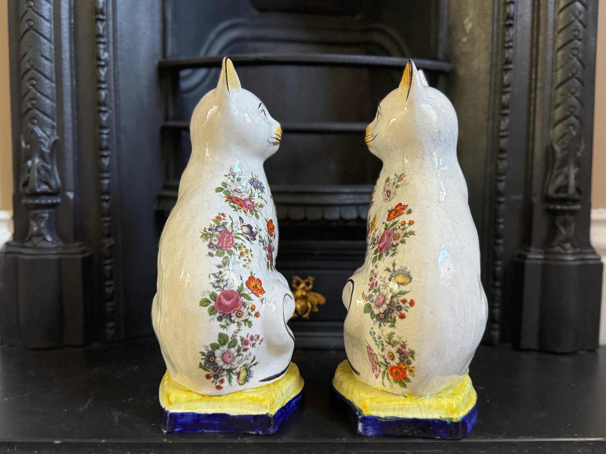 アンティーク、花柄スタッフォードシャーキャット(ペア)|19世紀後期〜20世紀初期頃