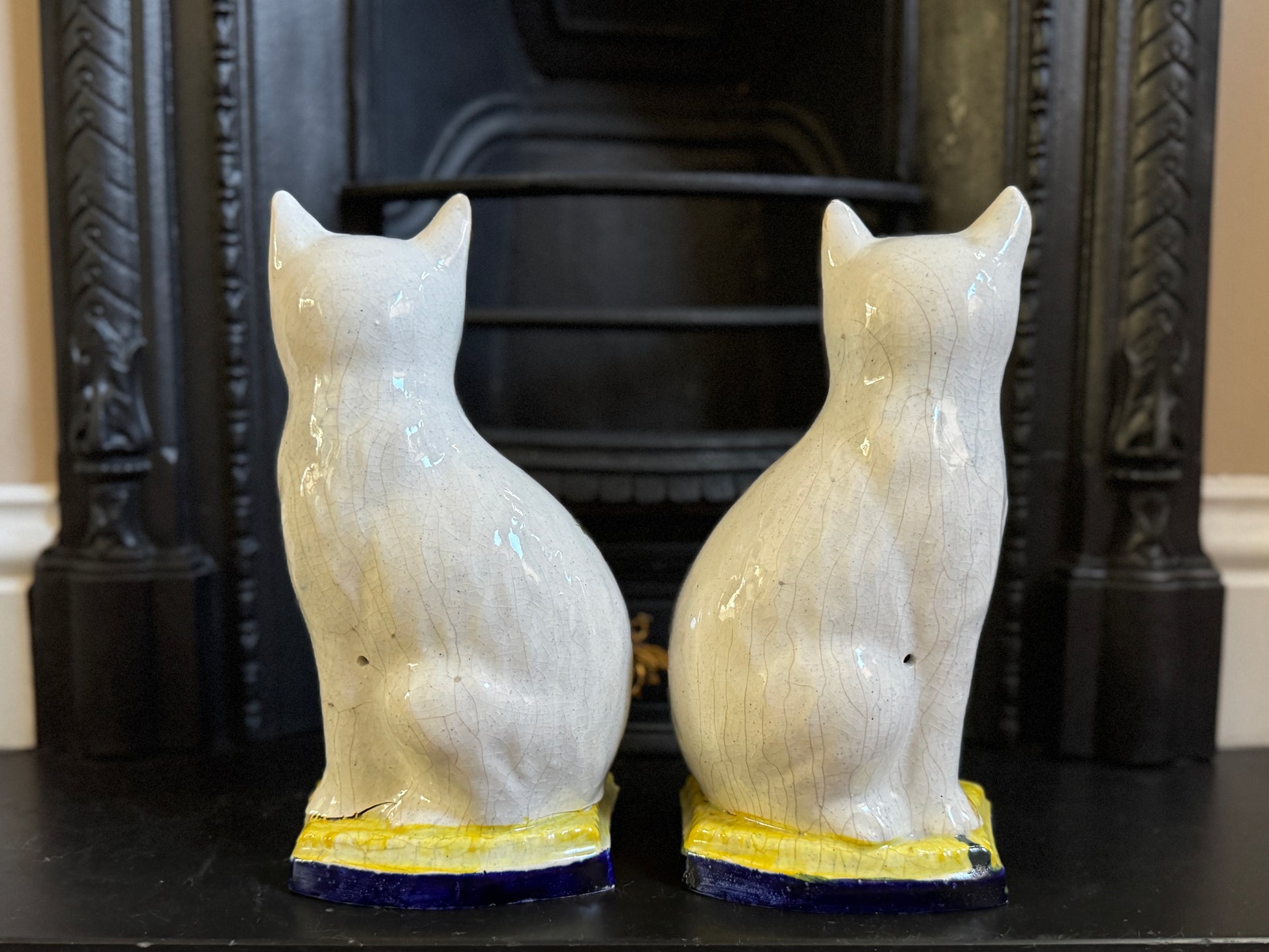 上品な立ち姿が印象的な、希少なスタッフォードシャーキャットのペアです。19世紀後期〜20世紀初期頃(約1890〜1930年)の英国製と考えられ、素朴なフォークアート調が多いヴィクトリア時代の猫とは異なる、より洗練されたフォルムが魅力。後年のミッドセンチュリー時代のリプロダクション(復刻スタイル)とも異なり、佇まいに気品が漂います。