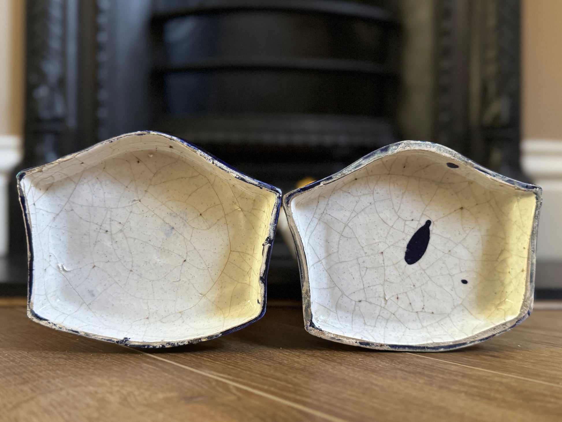 アンティーク品としてとても良好な状態です。全体に細かな貫入が見られ、時を経た味わいが感じられます。背面には当時の製造工程による通気孔(ベンチレーションホール)があり、焼成時の作りの特徴です。また、脚と台座の接合部に、ごく繊細な窯傷(焼成時に生じたライン)が見られ、当時の制作過程にみられるオリジナルの特徴です。