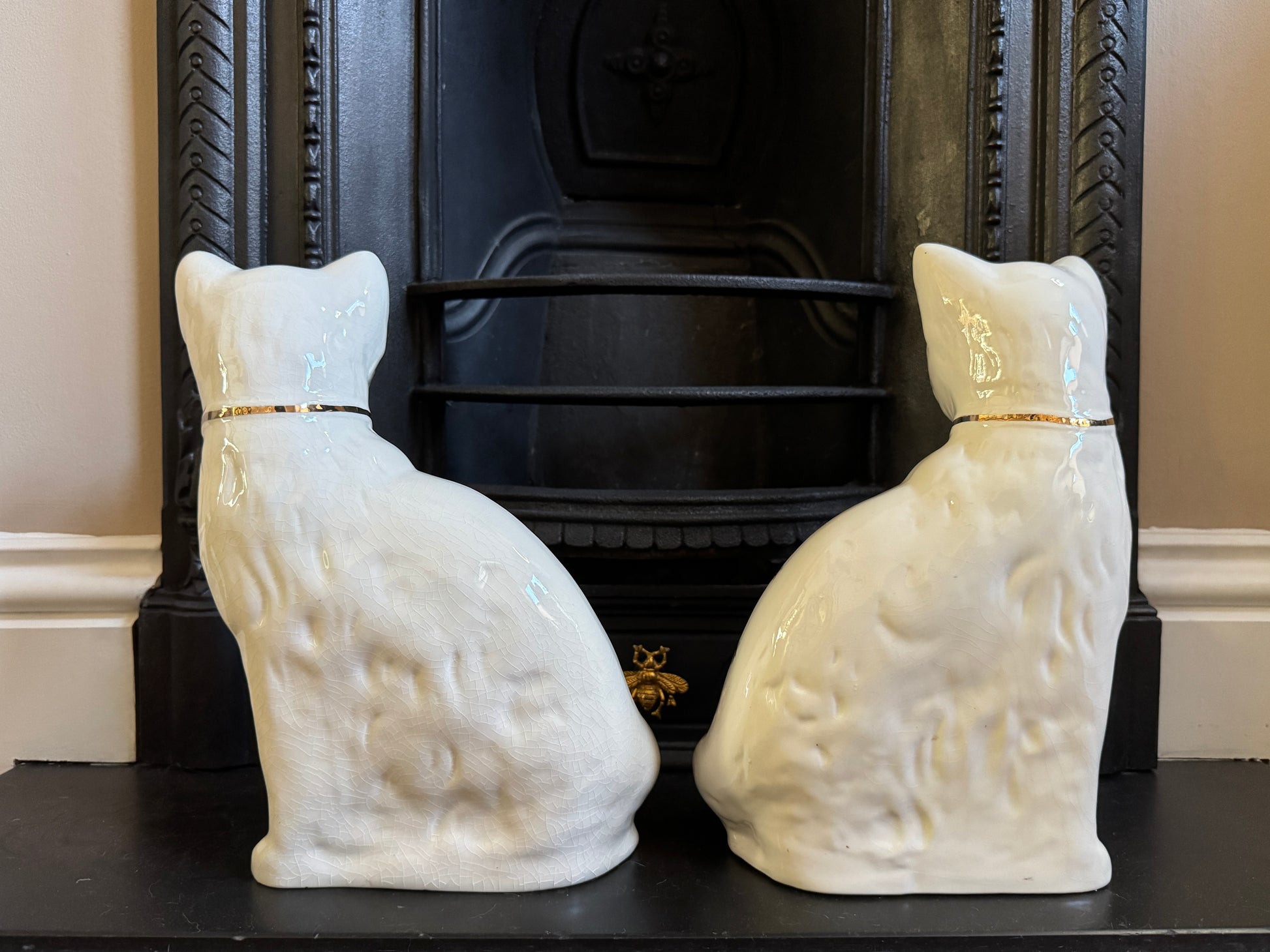スタッフォードシャーといえばドッグが代表的ですが、キャットは流通数が少なく希少です。さらに、このように高さ約29cmの存在感のあるフォルムのデザインは、イギリス国内でもあまり見かけません。ゴールドの首元ディテールや穏やかな表情が、インテリア空間に華やかさを添えてくれます。