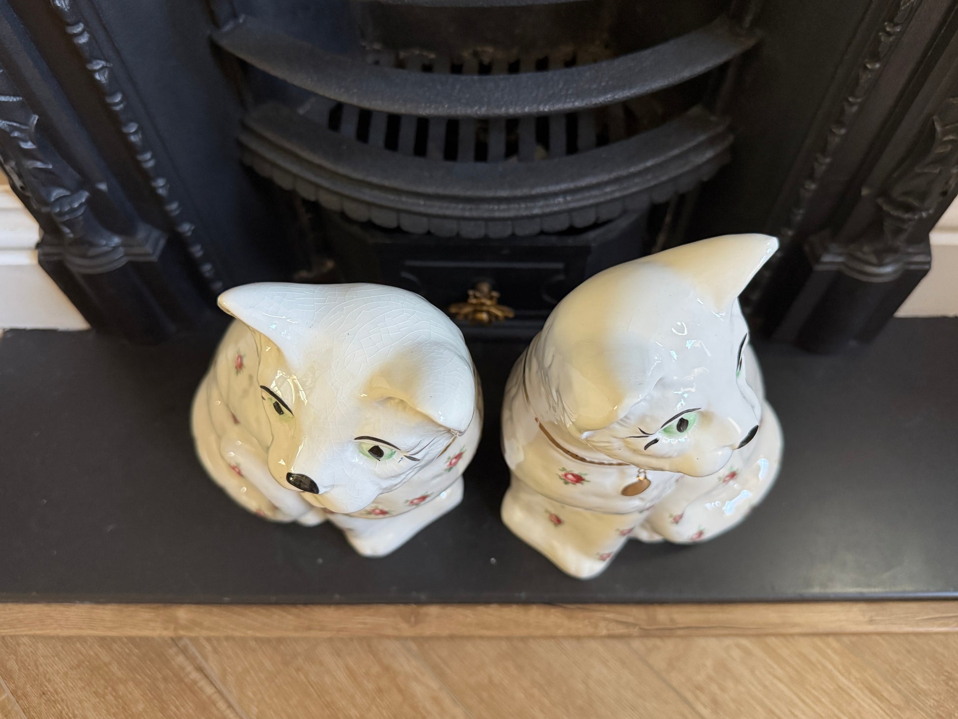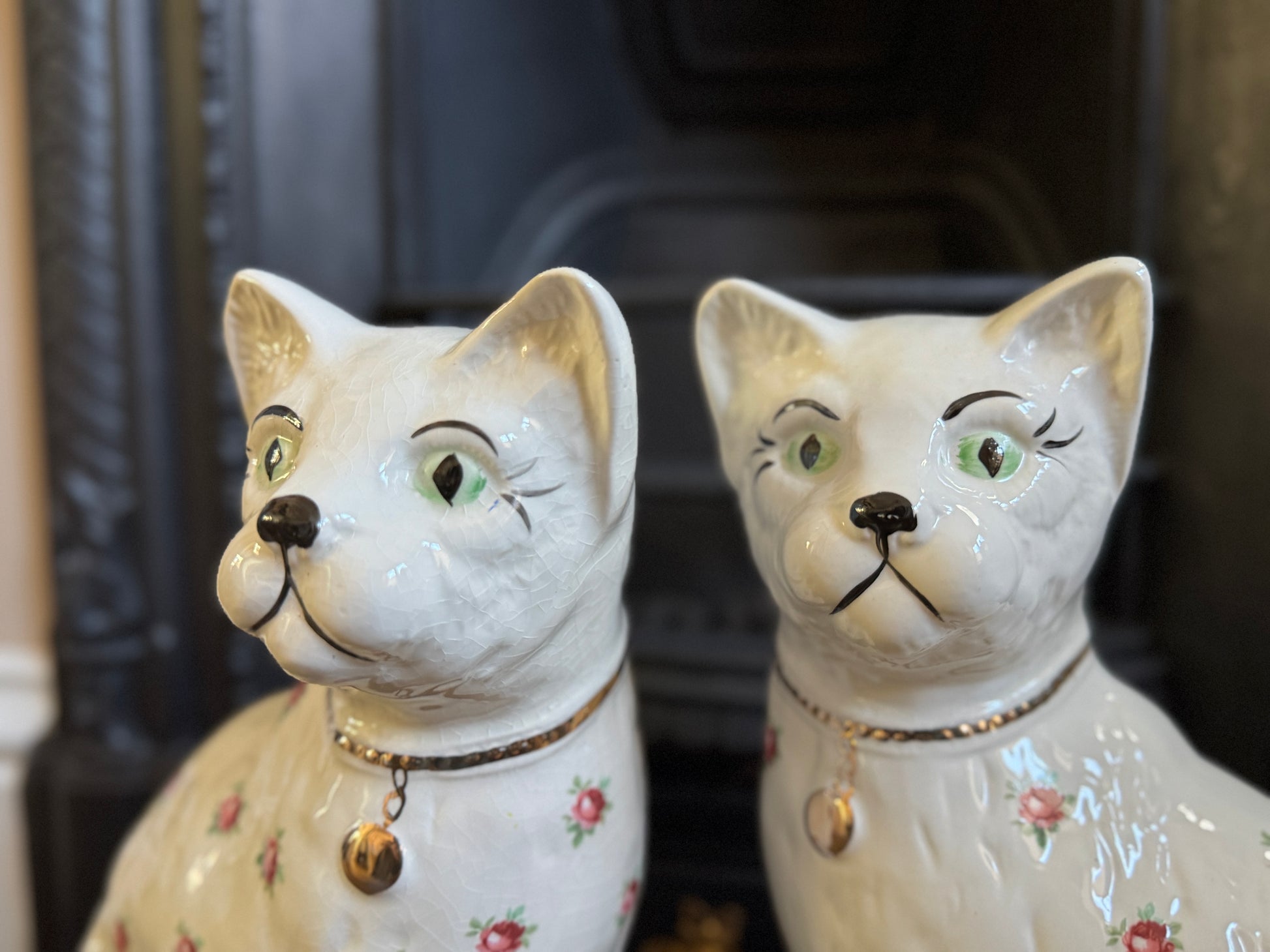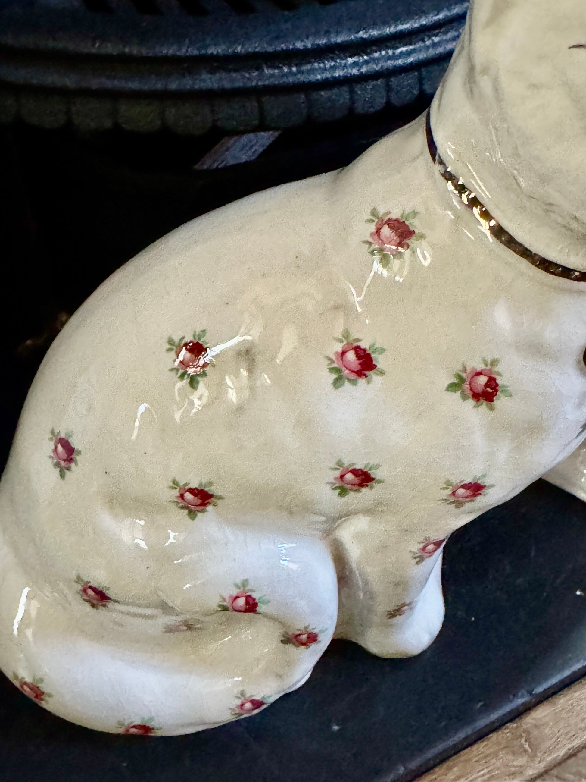 良好なヴィンテージコンディションです。全体に自然な貫入がみられ、ヴィンテージらしい表情を楽しめます。ローズ柄と金彩もきれいな状態です。片方の猫のボディに小さな窯点が見られますが、製造時に生じたもので後年のダメージではないと思われます(最後の写真をご参照ください)。