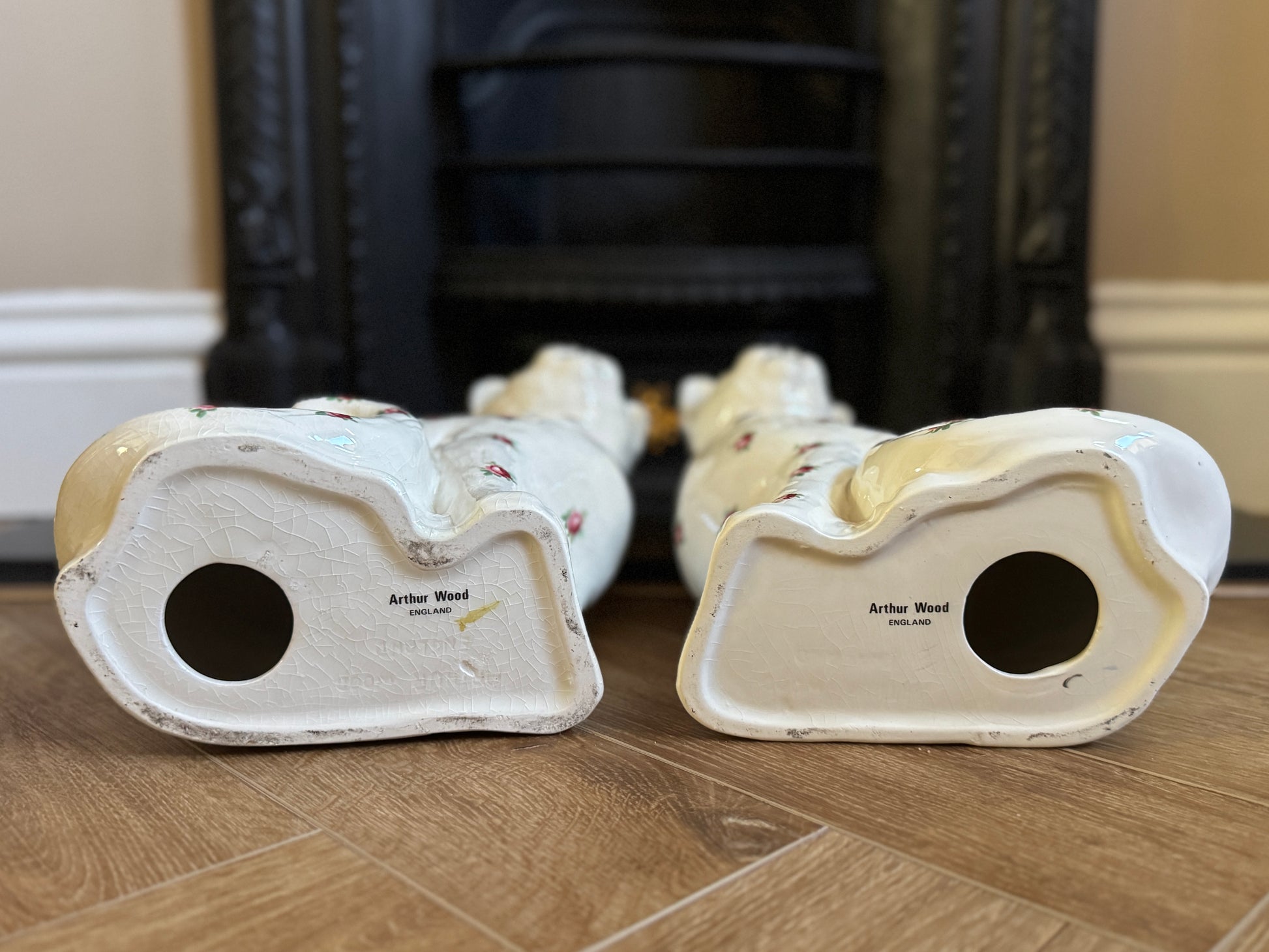 1884年創業の英国メーカー Arthur Wood(アーサー・ウッド)社 による、ミッドセンチュリー期のスタッフォードシャーキャットです。白磁に散りばめられた小さなローズ柄と、すらりとした立ち姿が印象的なペア。クラシックなモチーフを軽やかに仕上げた、上品でモダンな雰囲気が魅力です。