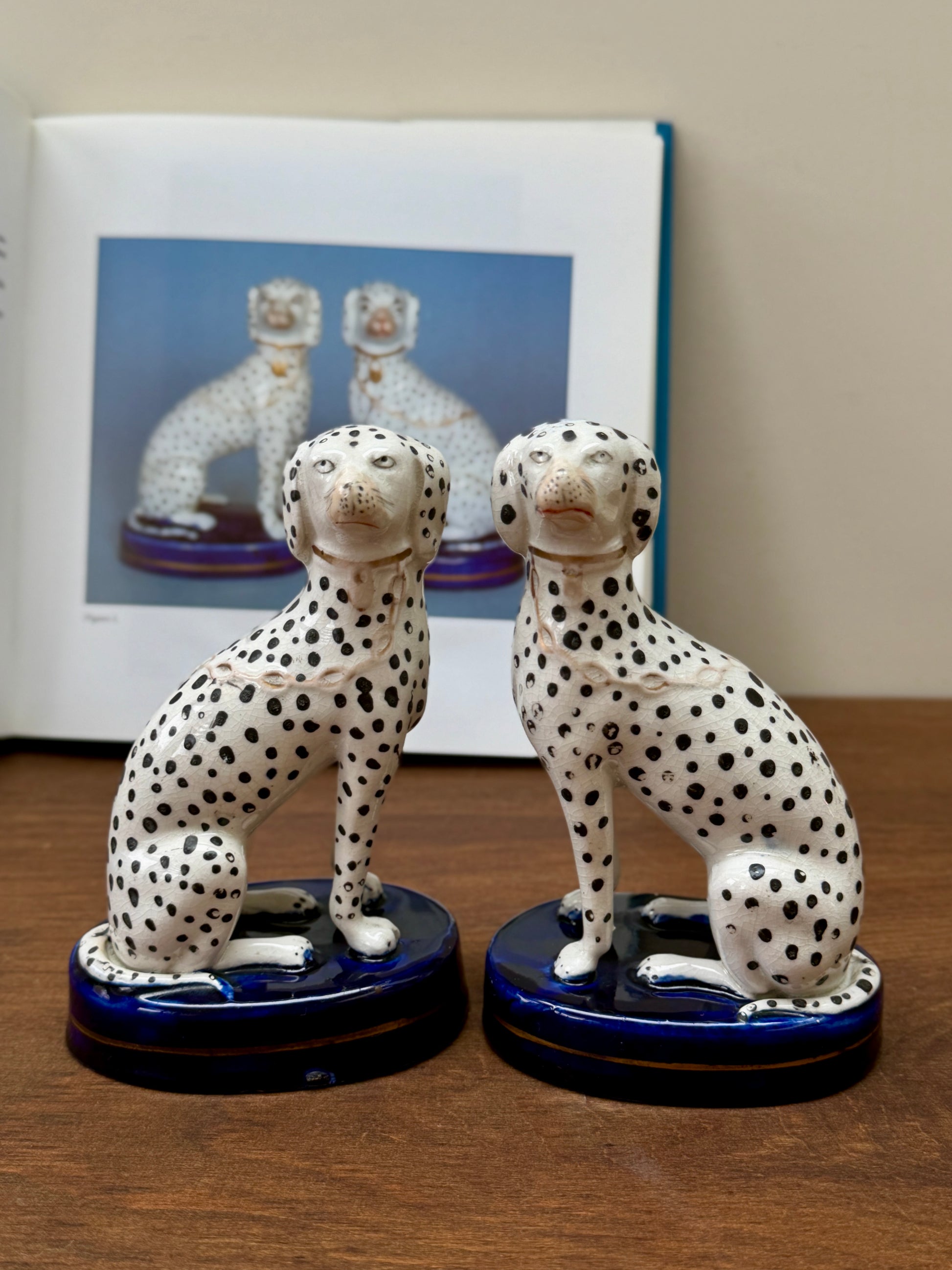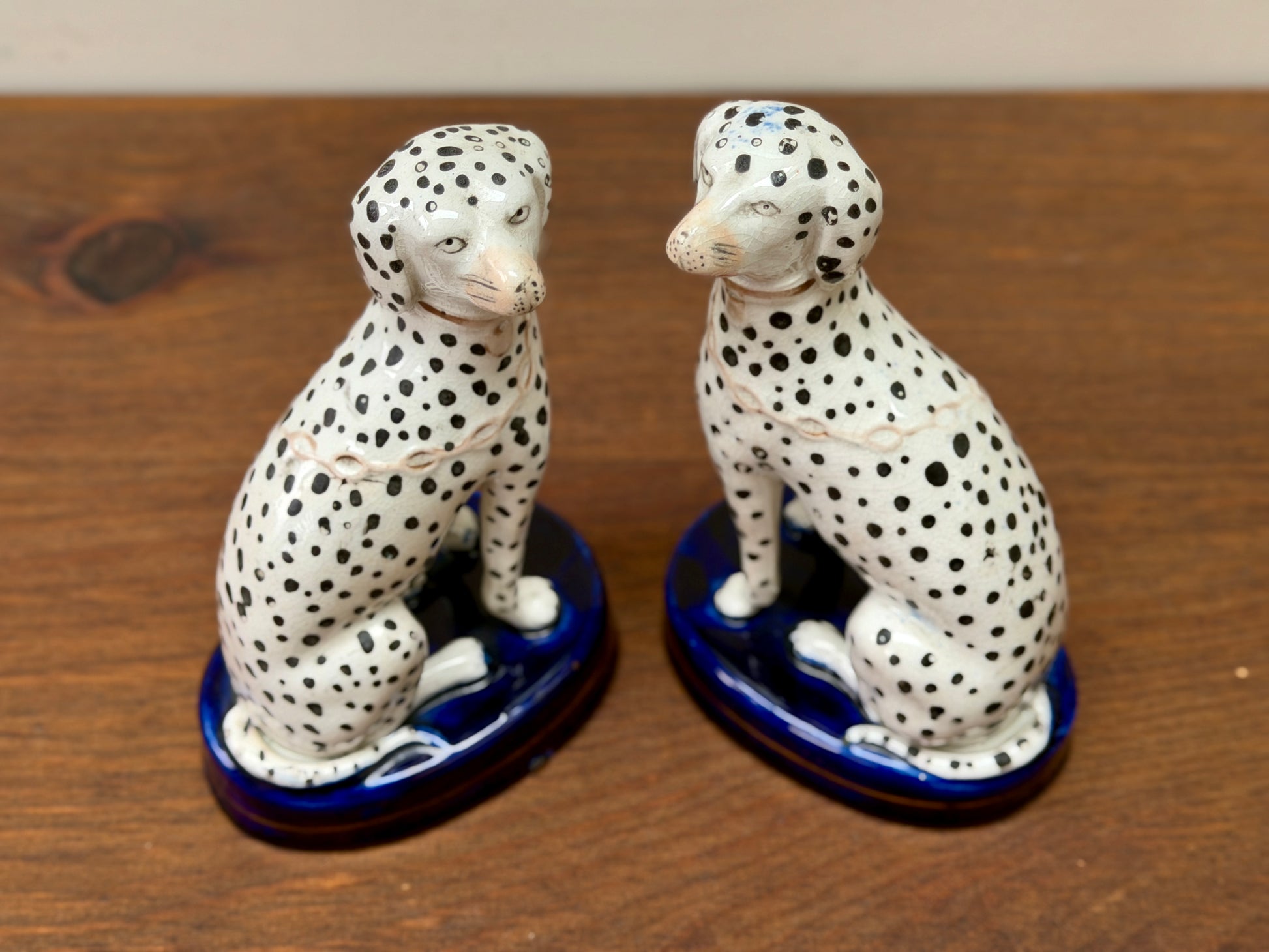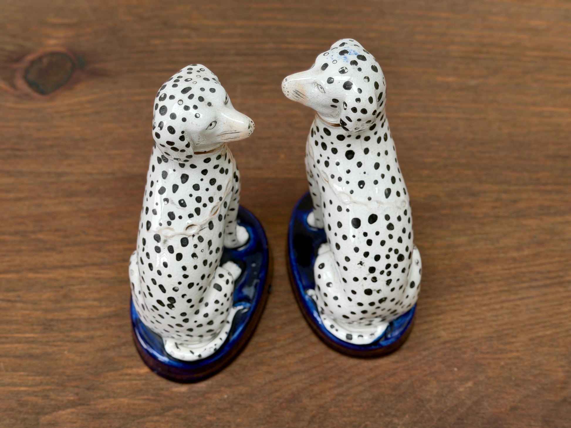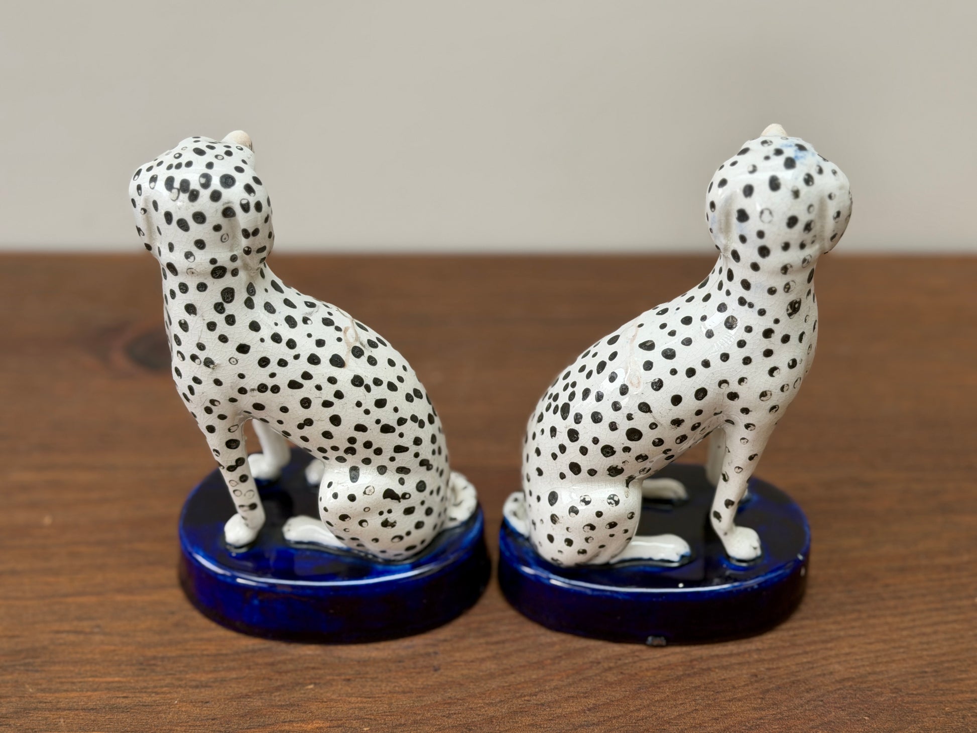 1850年代頃に作られた、ヴィクトリア時代のスタッフォードシャードッグ、ダルメシアン犬のペアです。深みのあるコバルトブルーの台座に堂々と座り、赤く彩色された口元と大小の斑点が入り混じったハンドペイントの模様が、ひとつひとつ異なる個性と味わいを生み出しています。