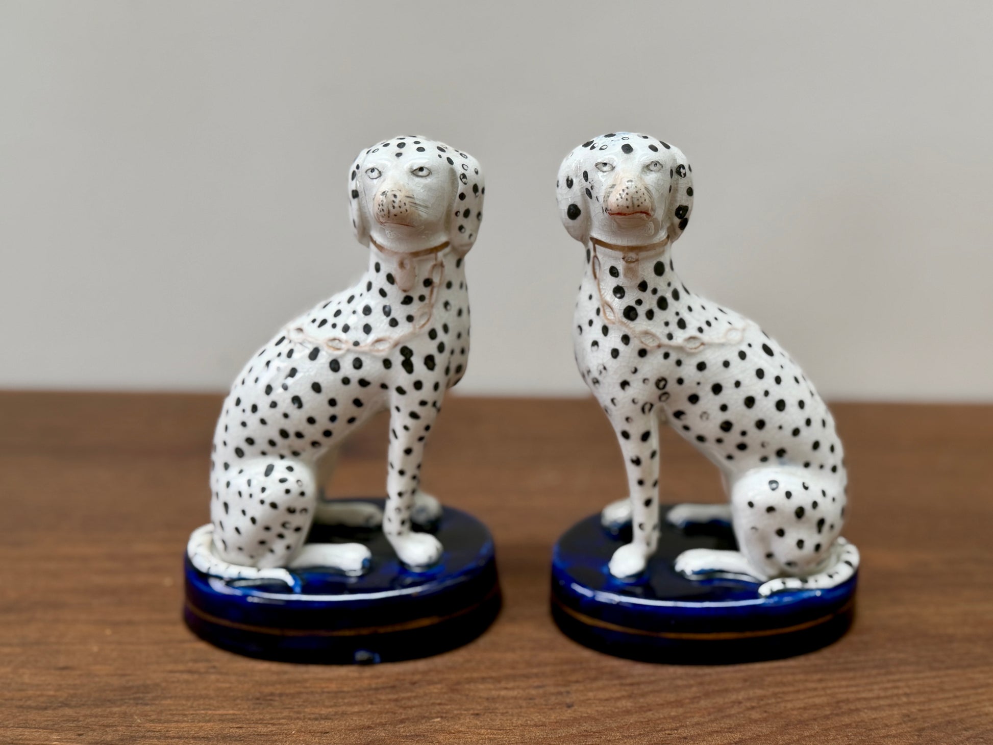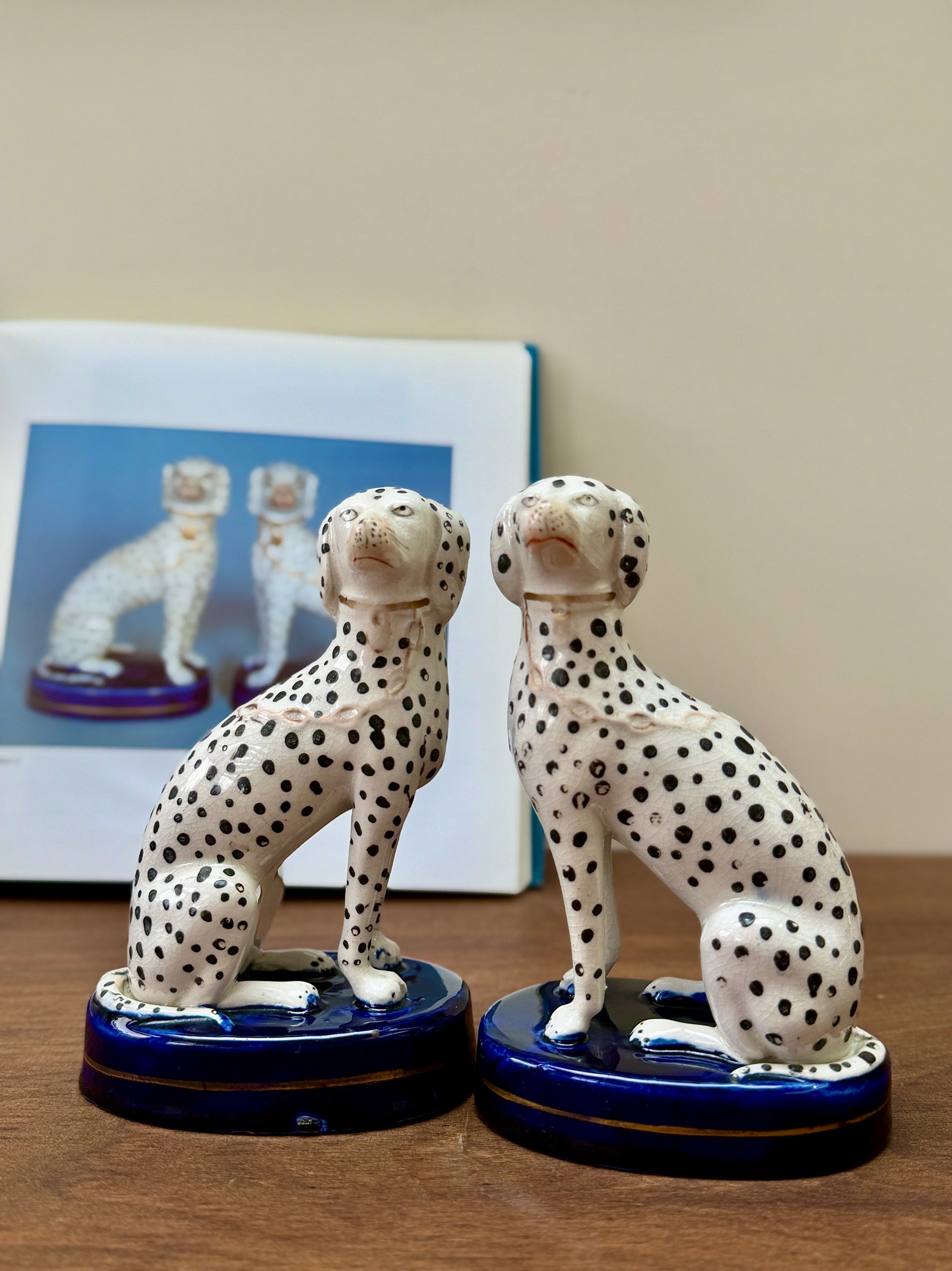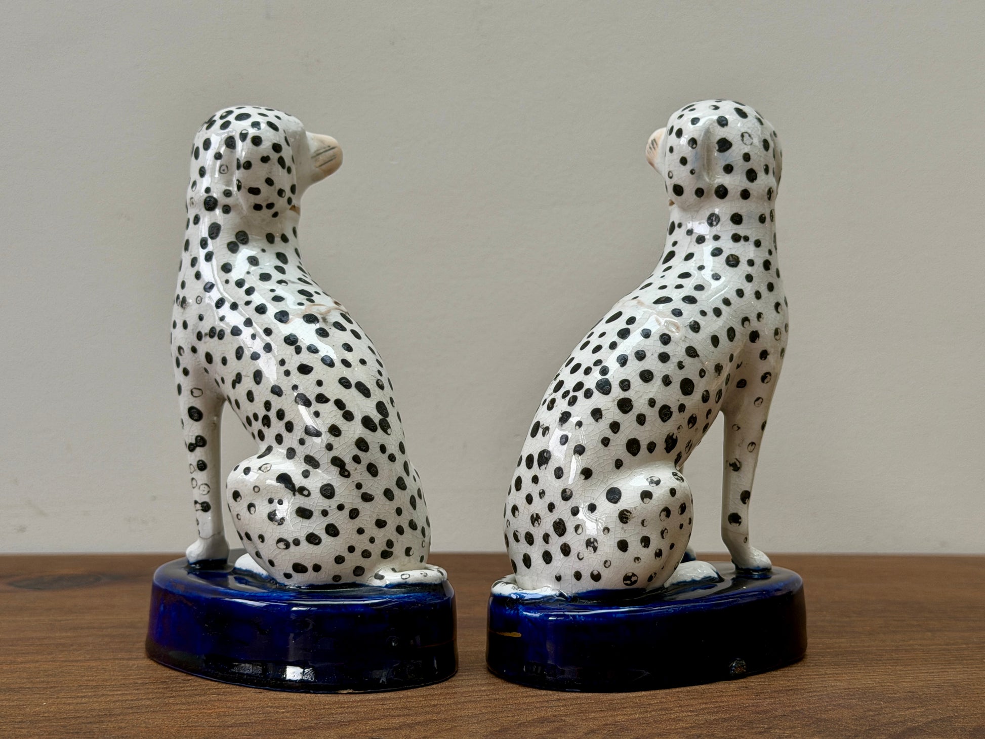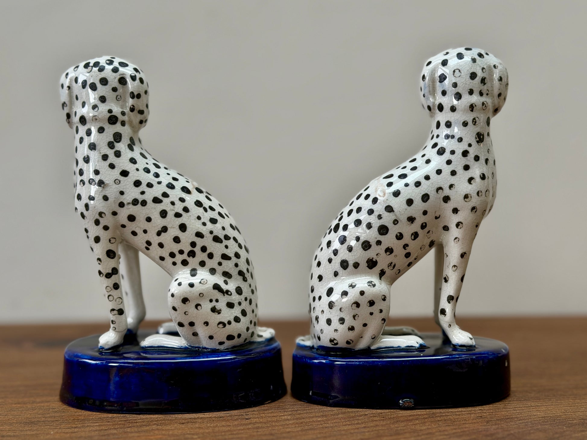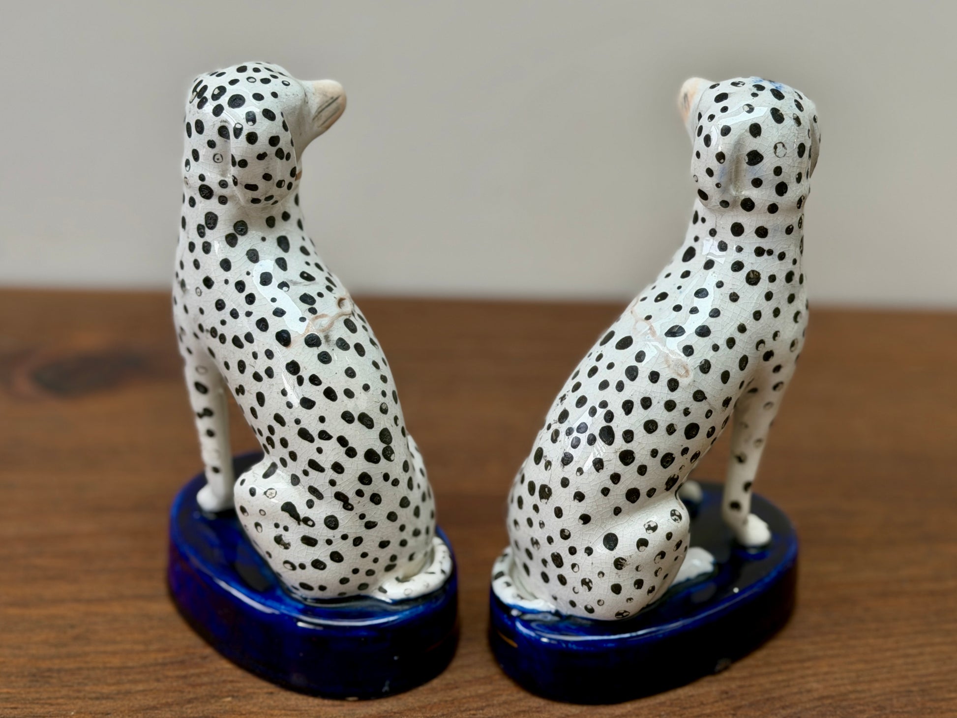 1850年代頃に作られた、ヴィクトリア時代のスタッフォードシャードッグ、ダルメシアン犬のペアです。深みのあるコバルトブルーの台座に堂々と座り、赤く彩色された口元と大小の斑点が入り混じったハンドペイントの模様が、ひとつひとつ異なる個性と味わいを生み出しています。