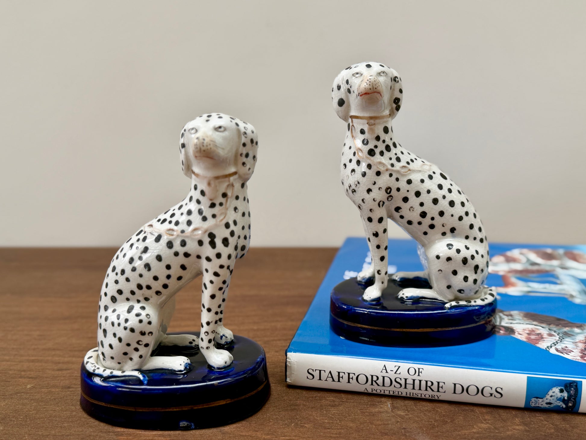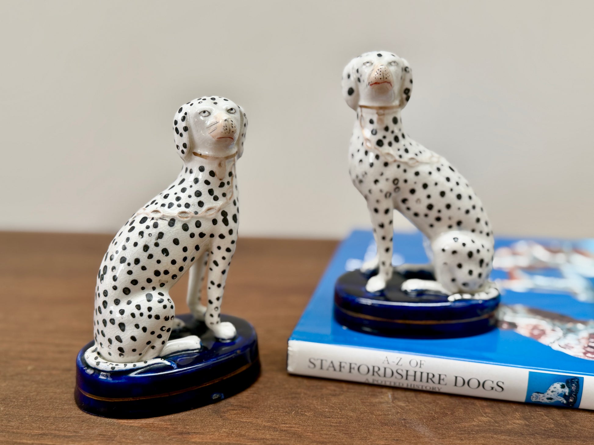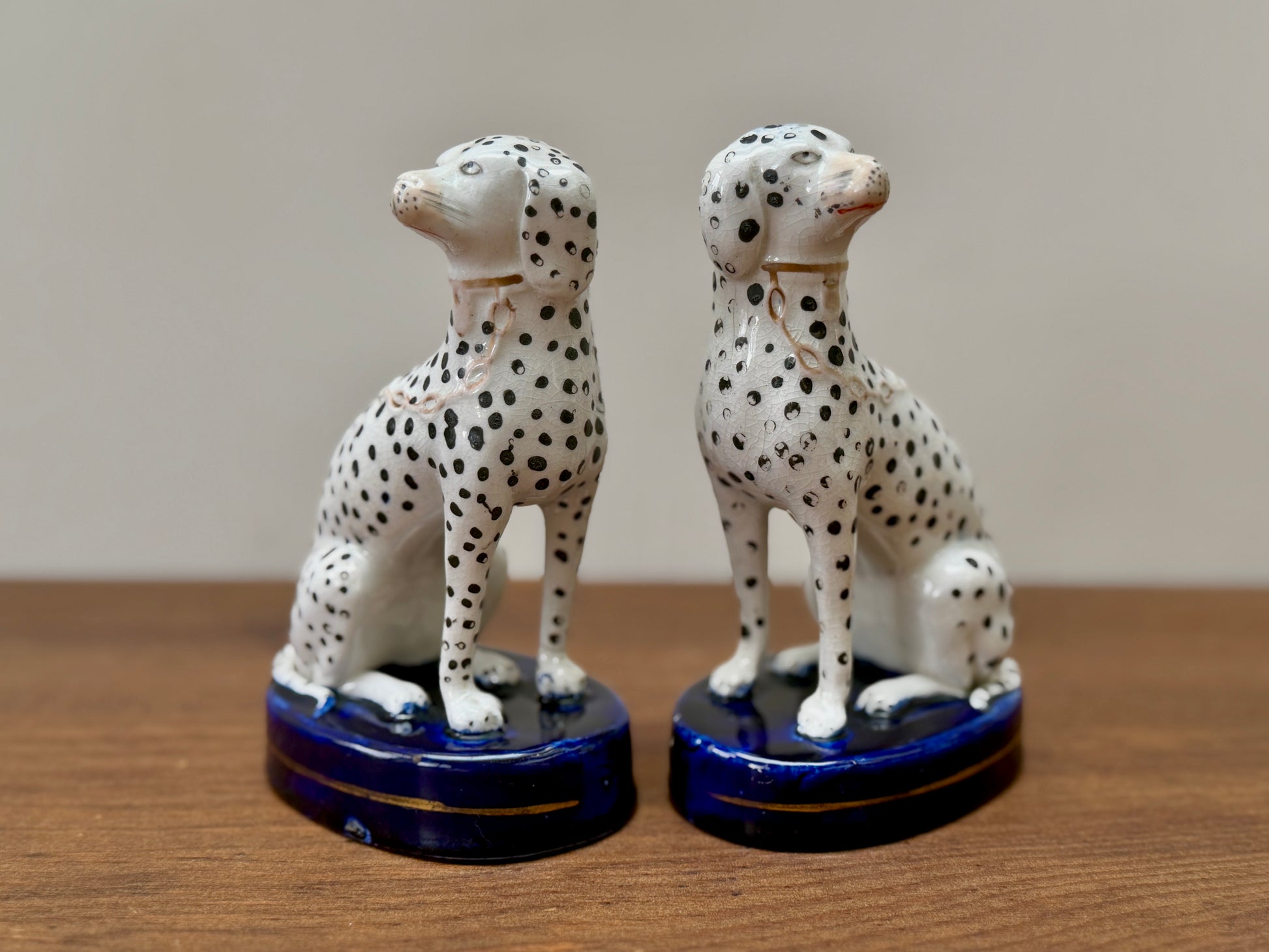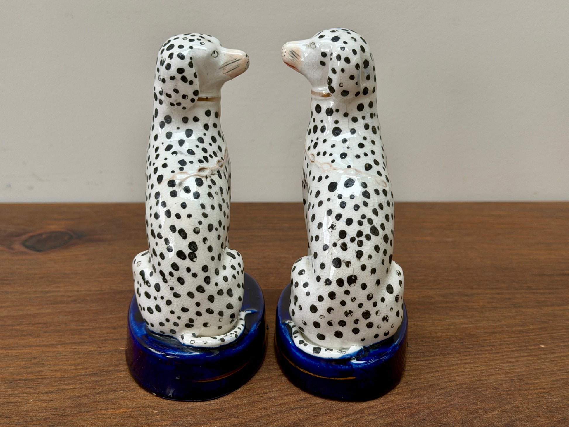 1850年代頃に作られた、ヴィクトリア時代のスタッフォードシャードッグ、ダルメシアン犬のペアです。深みのあるコバルトブルーの台座に堂々と座り、赤く彩色された口元と大小の斑点が入り混じったハンドペイントの模様が、ひとつひとつ異なる個性と味わいを生み出しています。