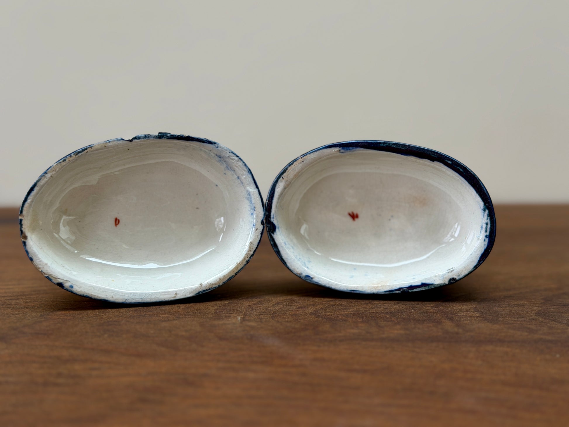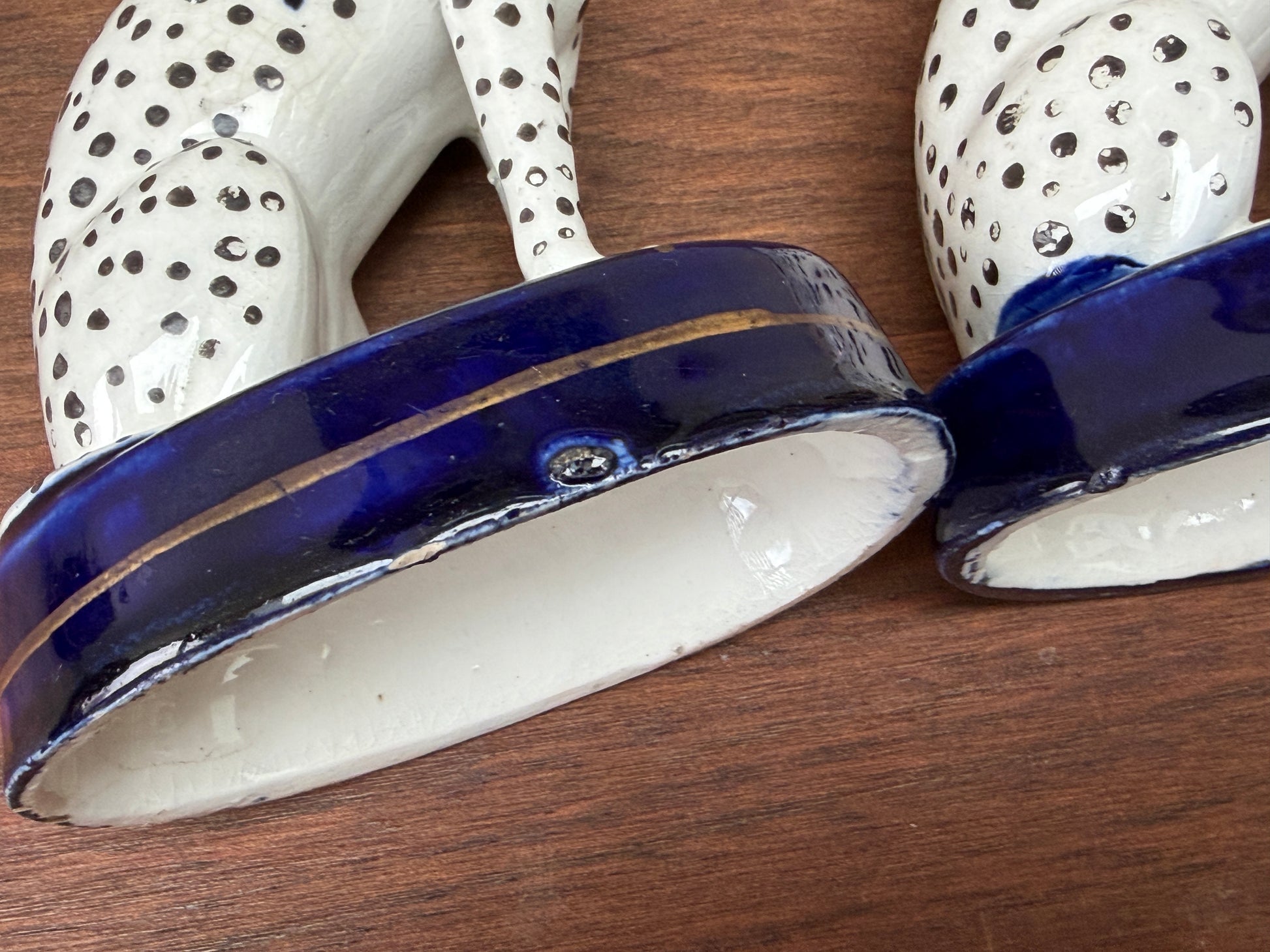 台座の縁に、当時の窯焼き時に生じた釉薬の抜け(グレーズスキップ / 釉薬ムラ)が見られます。アンティークらしい風合いとしてお楽しみいただけます。