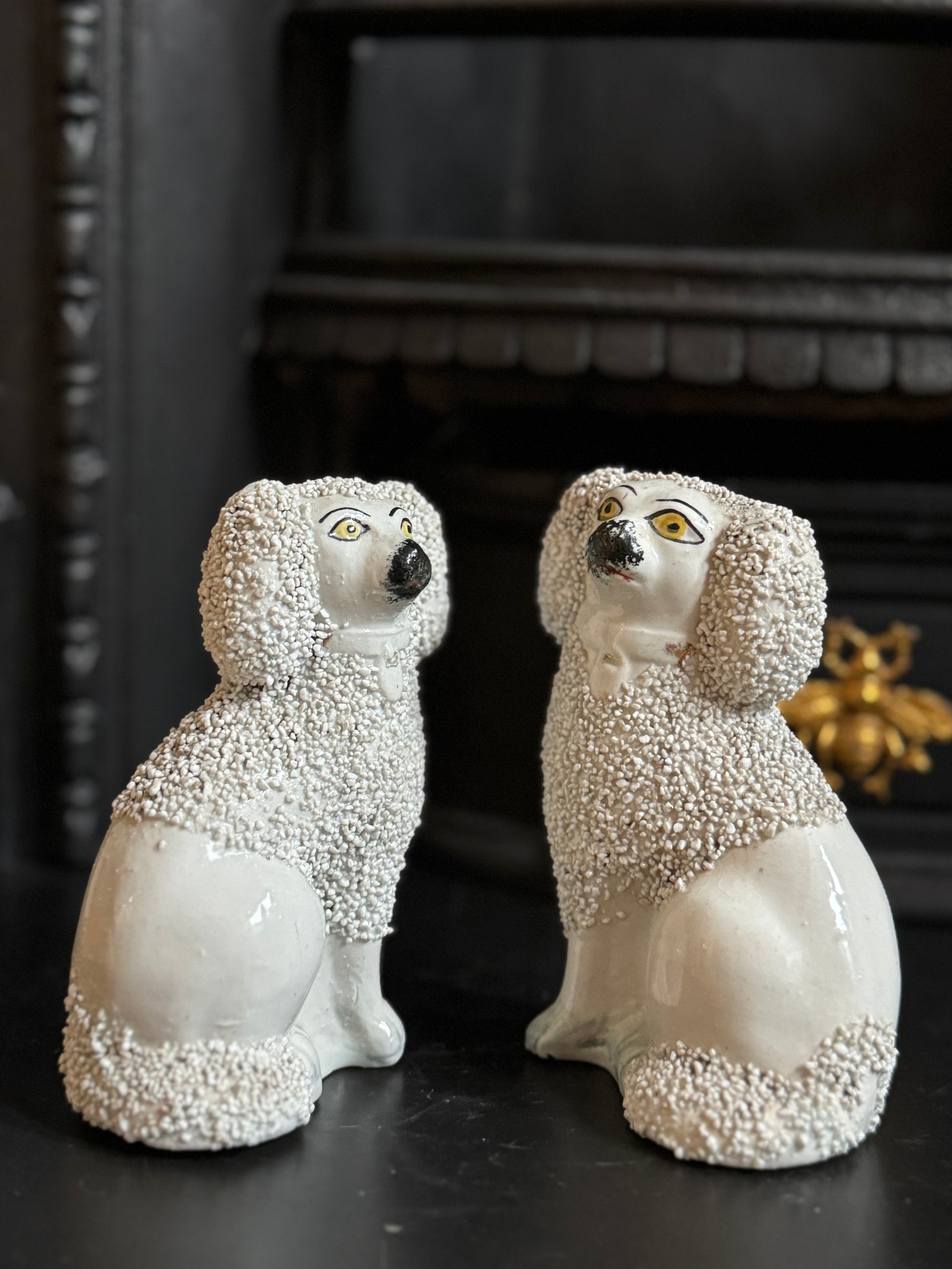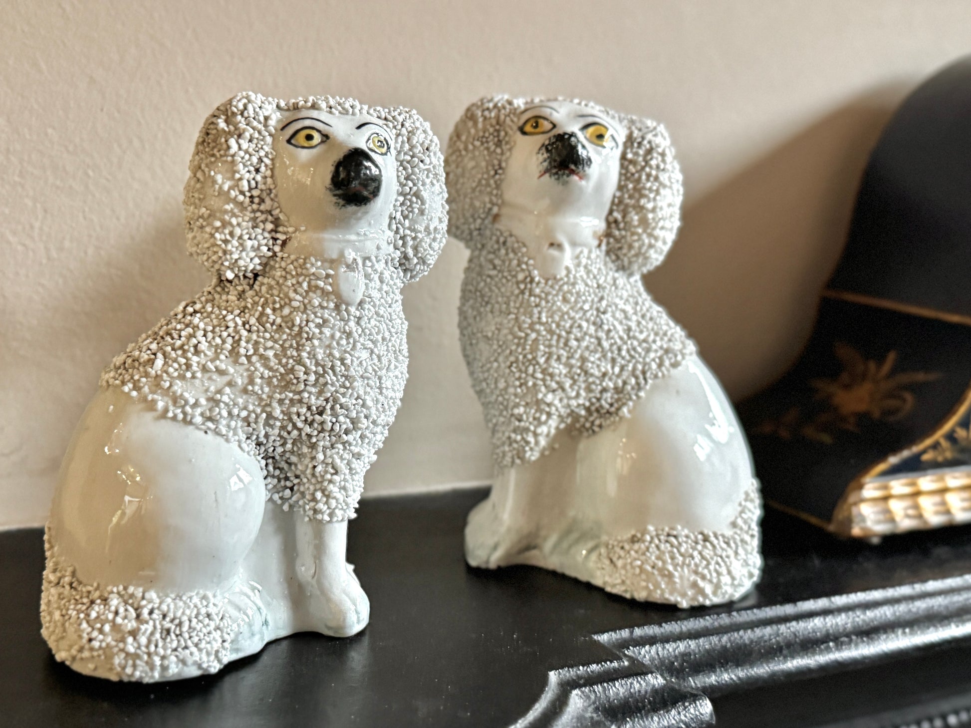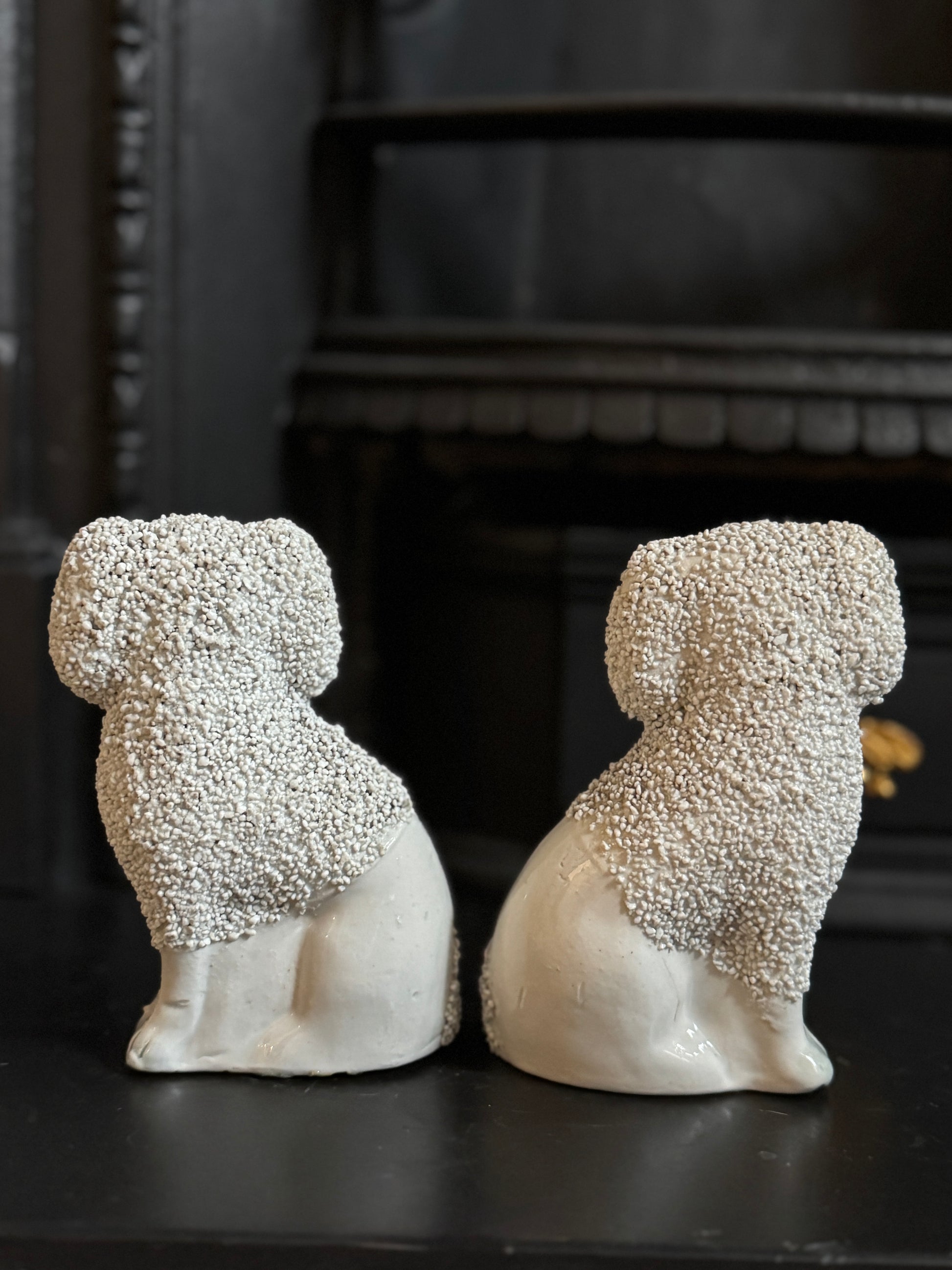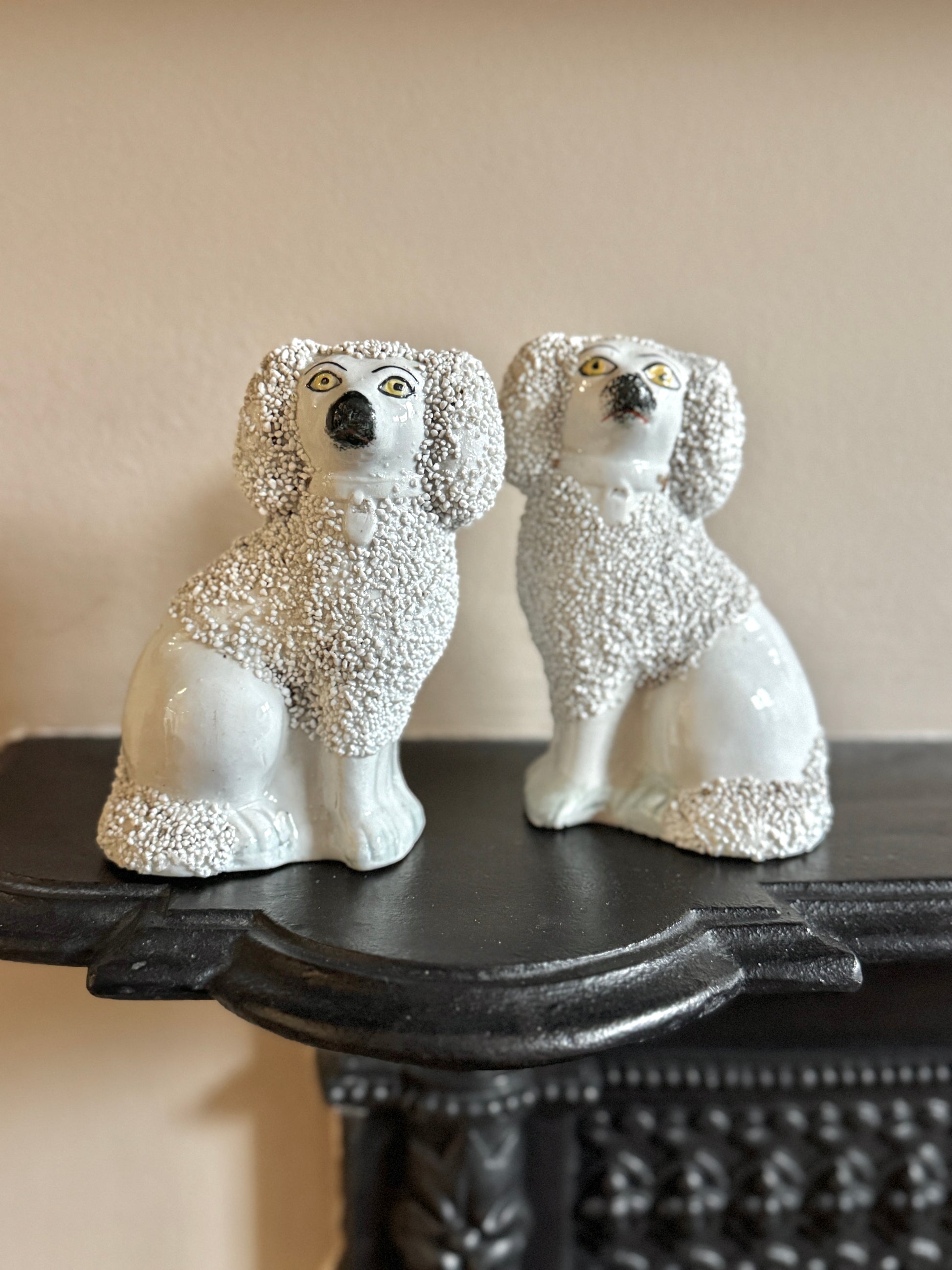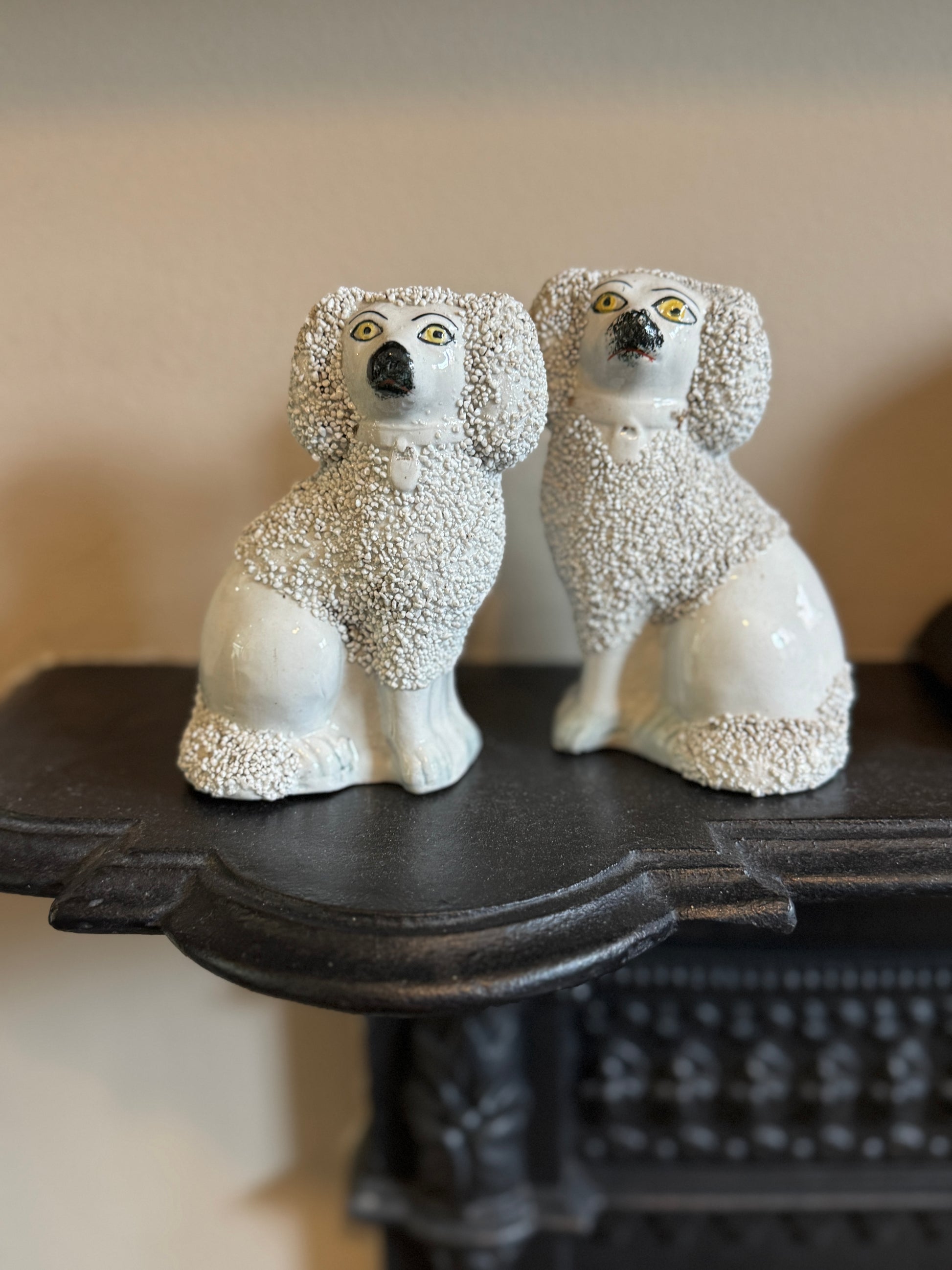 小ぶりながら存在感のある、スタッフォードシャー・プードルのペアです。優しい表情とふっくらとしたシルエットがどこか愛らしく、飾ると空間に英国らしい温かみと品のある雰囲気が広がります。