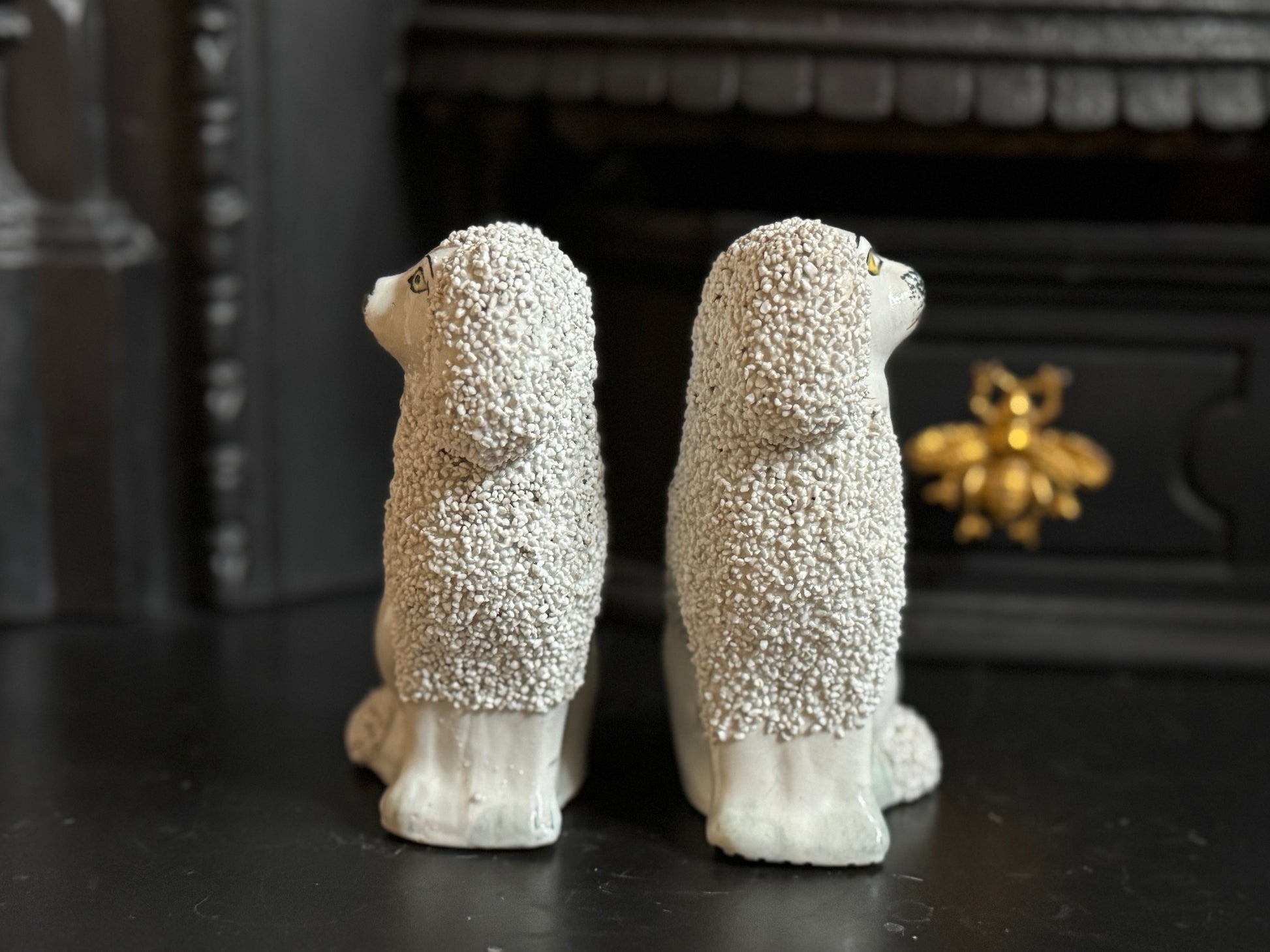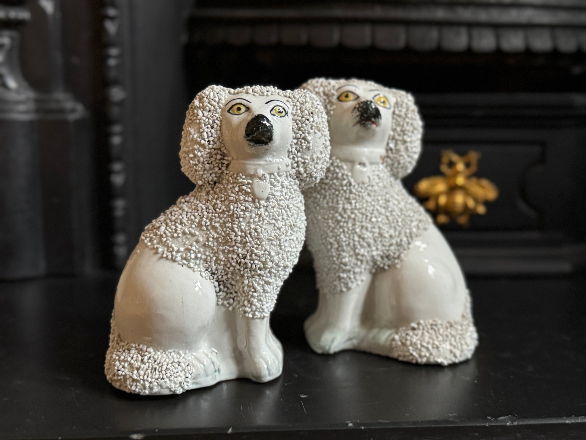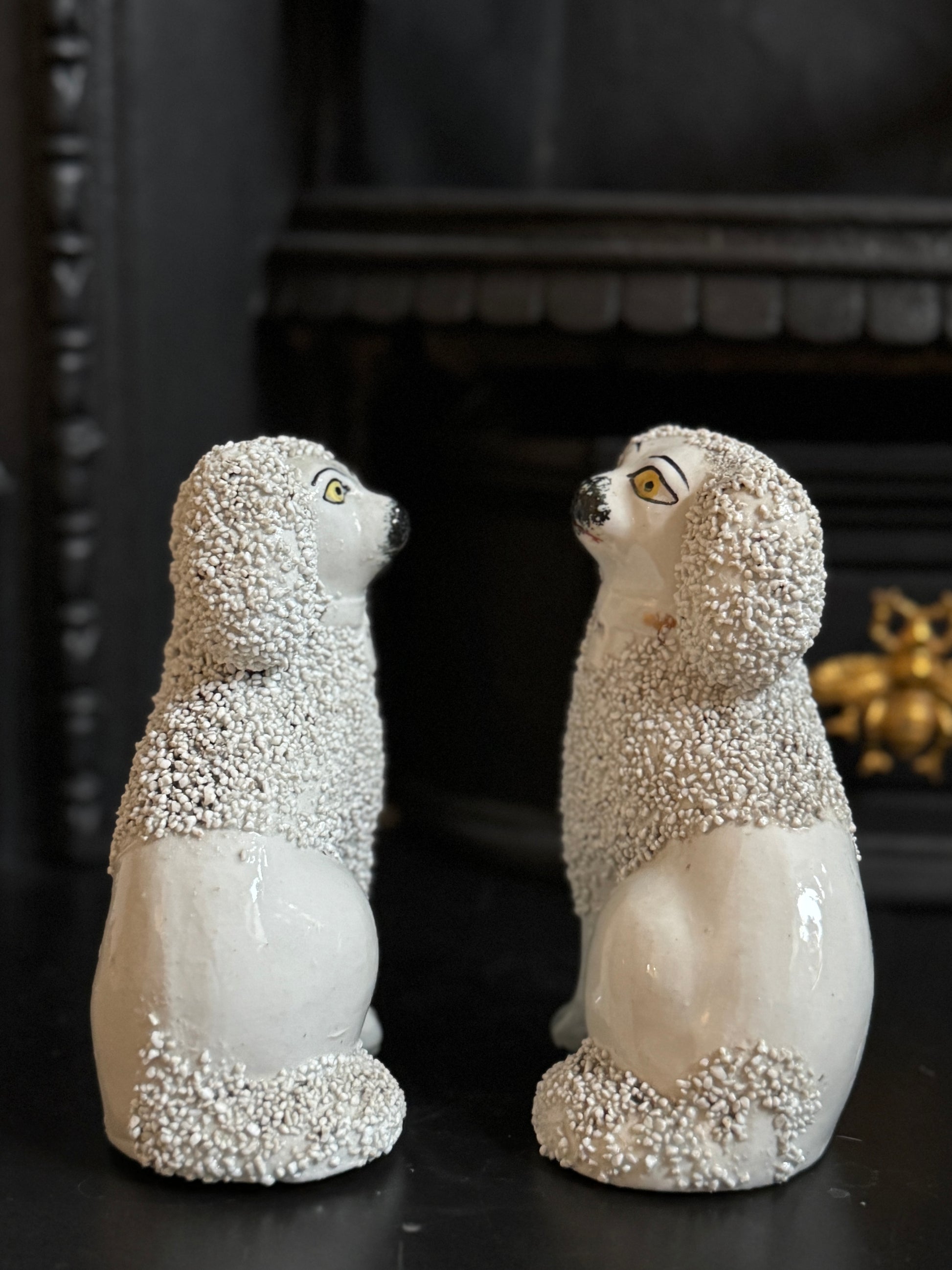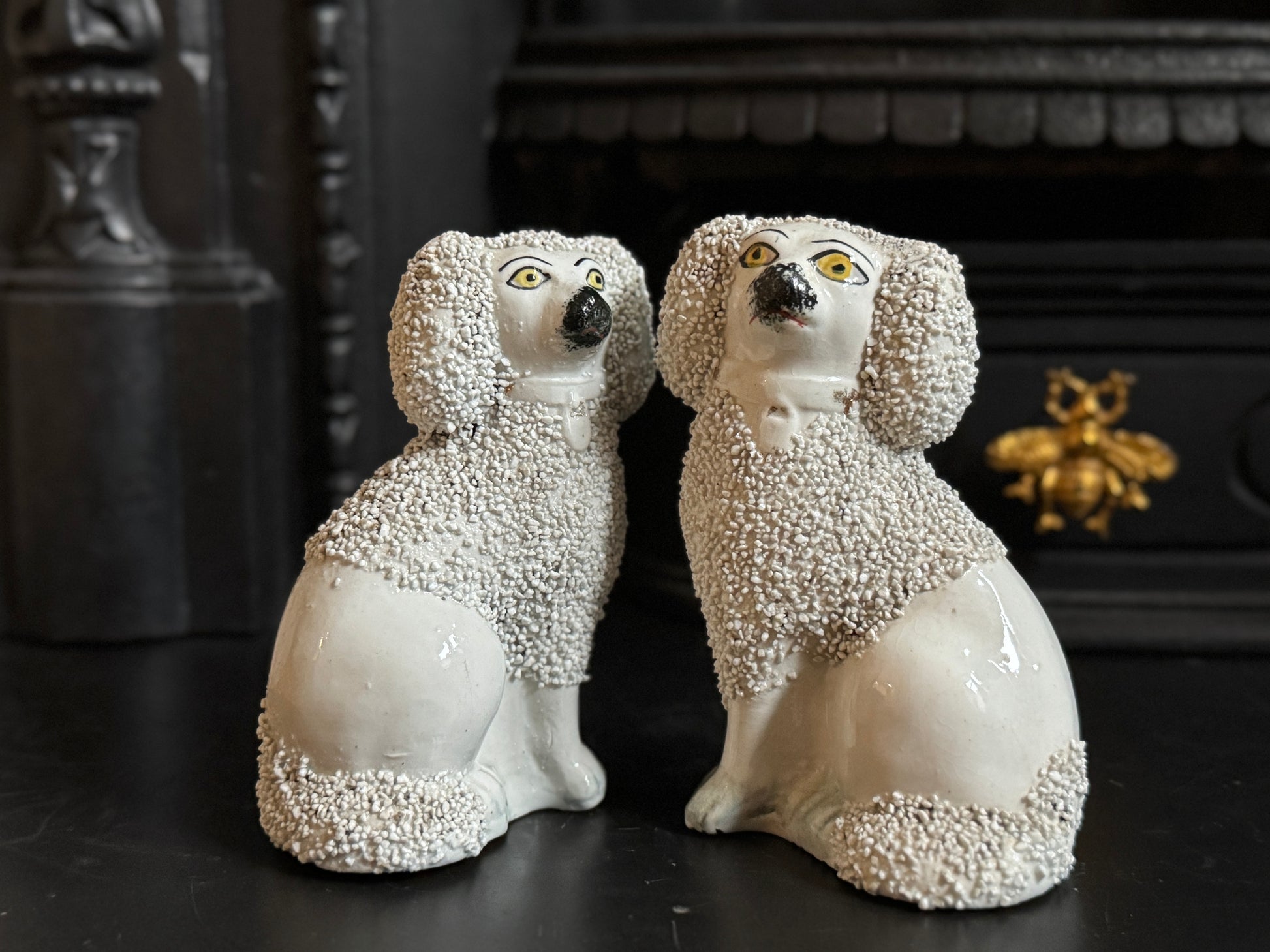 小ぶりながら存在感のある、スタッフォードシャー・プードルのペアです。優しい表情とふっくらとしたシルエットがどこか愛らしく、飾ると空間に英国らしい温かみと品のある雰囲気が広がります。
