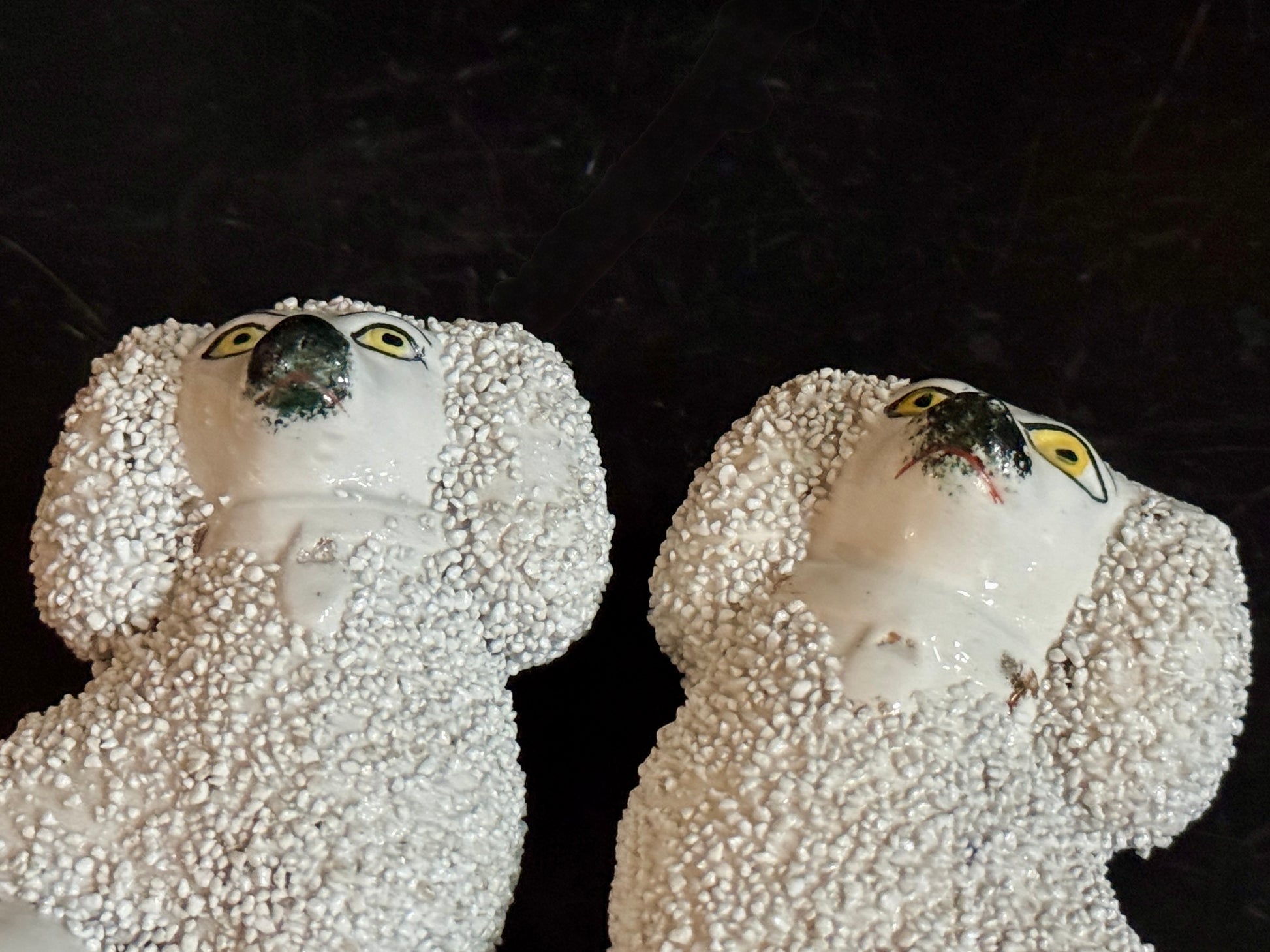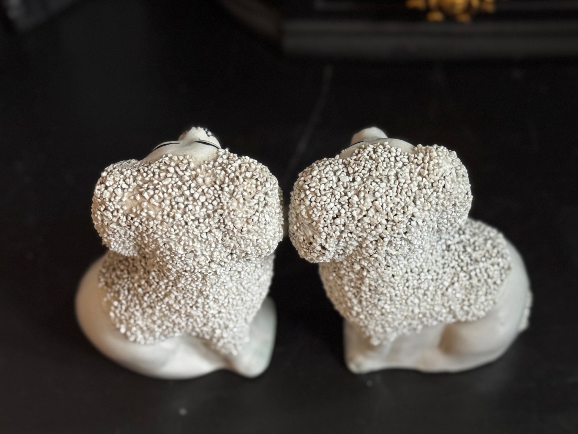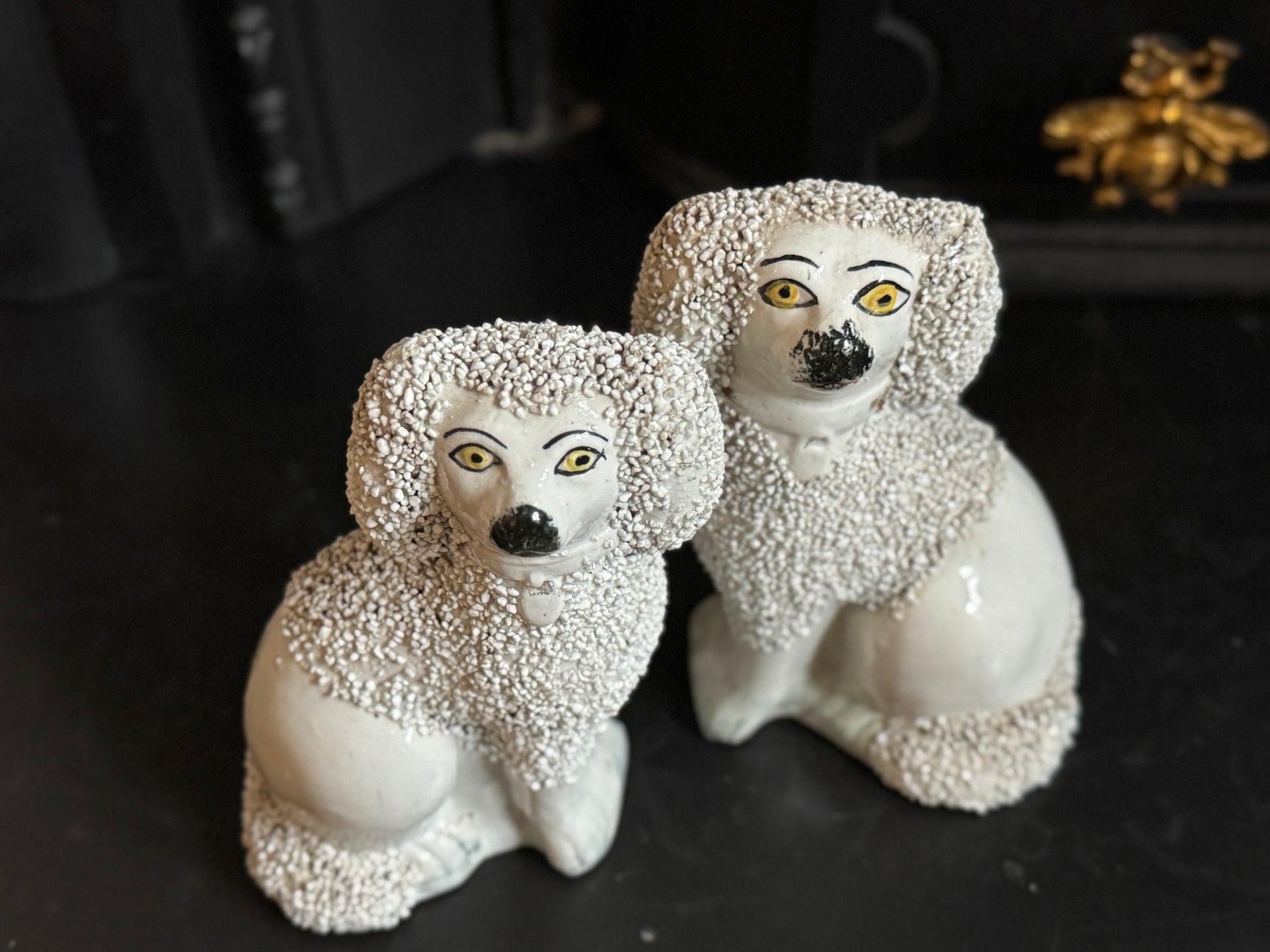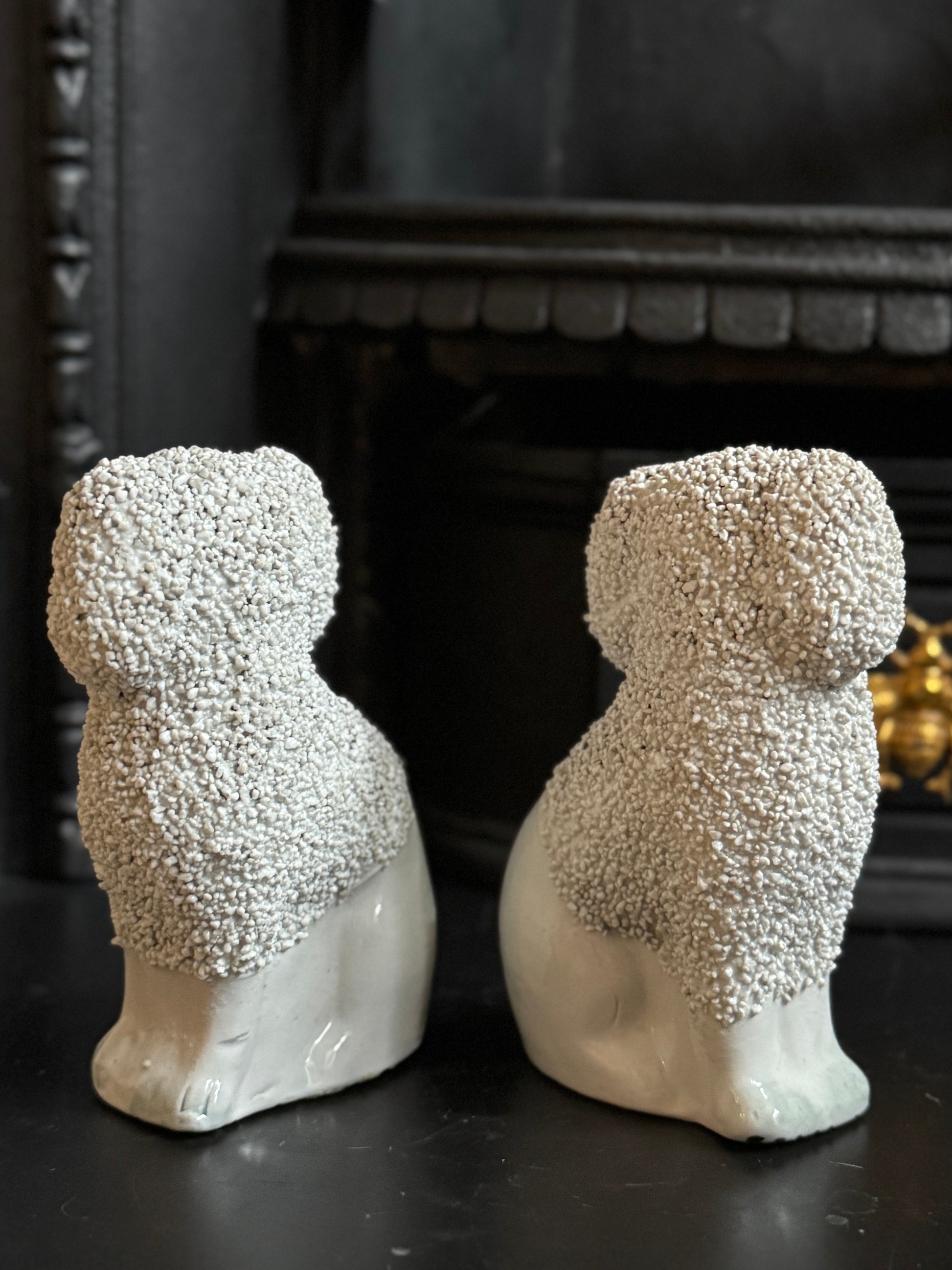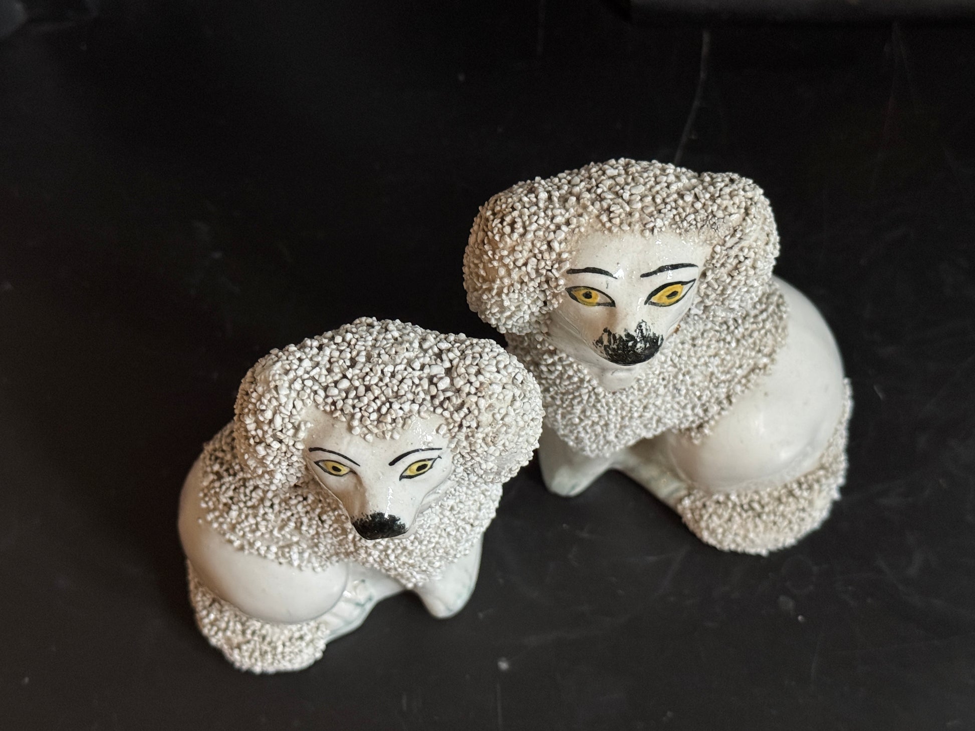 小ぶりながら存在感のある、スタッフォードシャー・プードルのペアです。優しい表情とふっくらとしたシルエットがどこか愛らしく、飾ると空間に英国らしい温かみと品のある雰囲気が広がります。