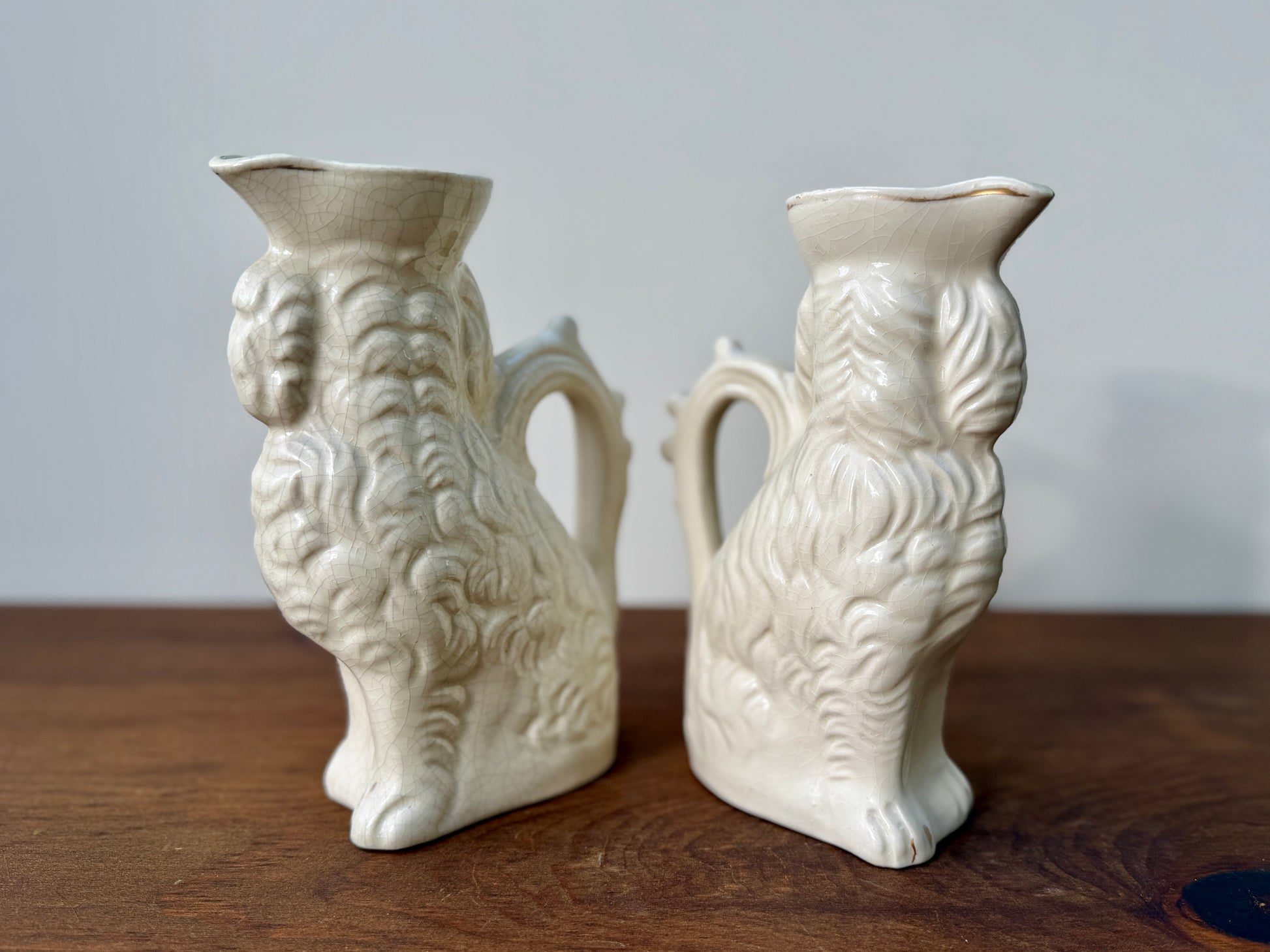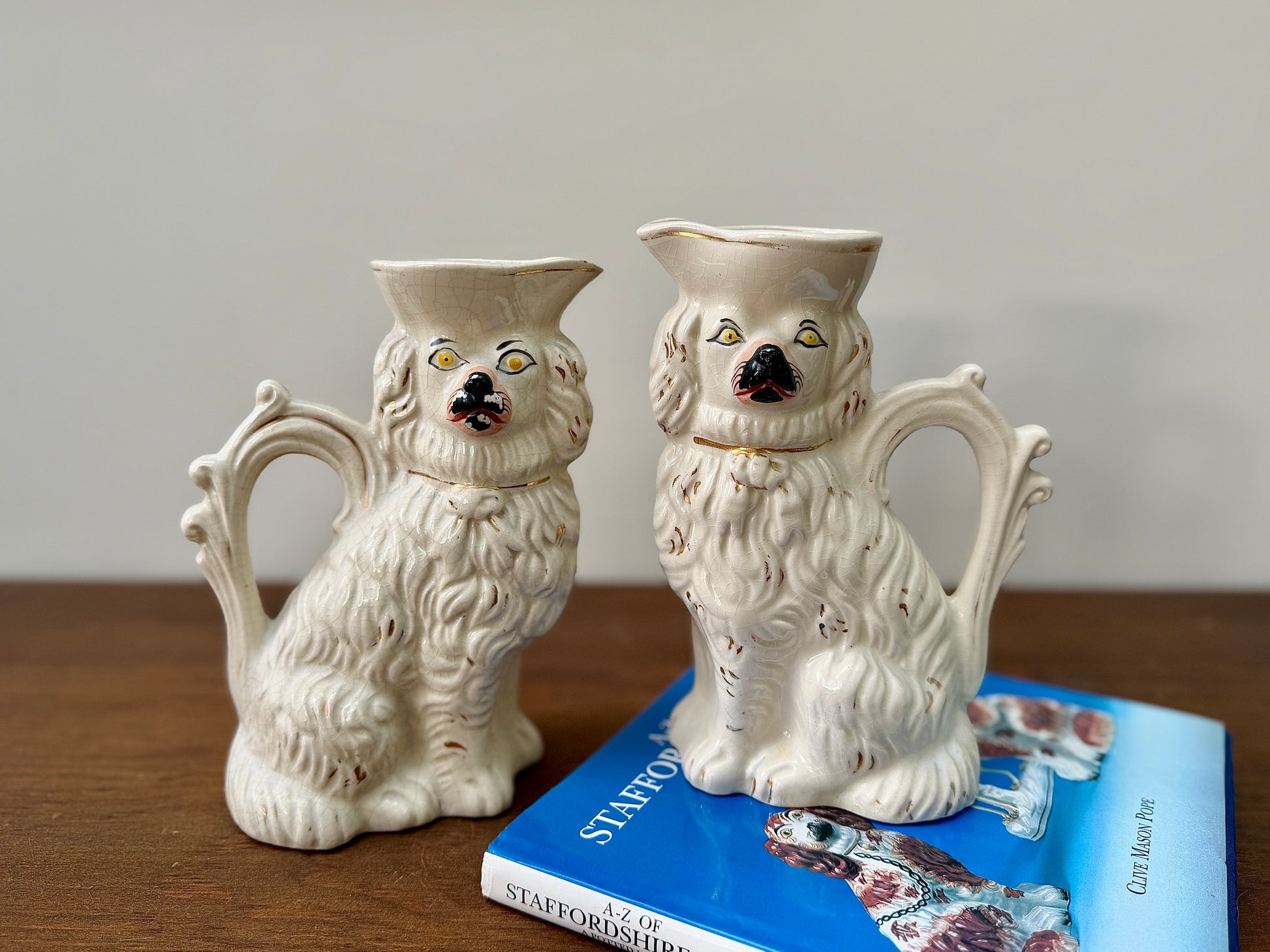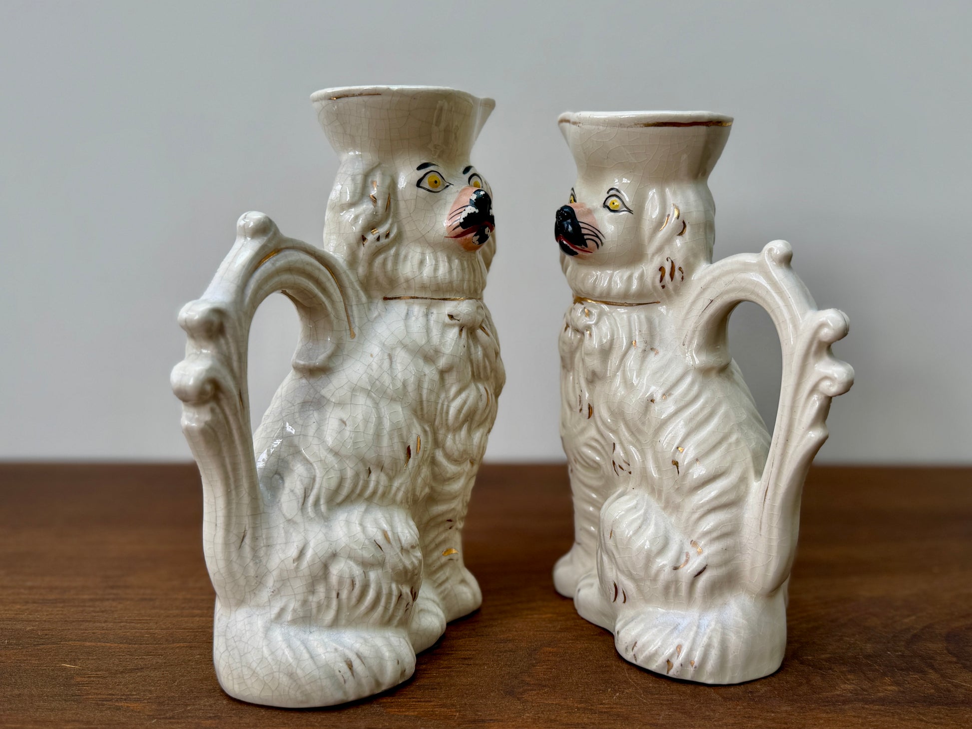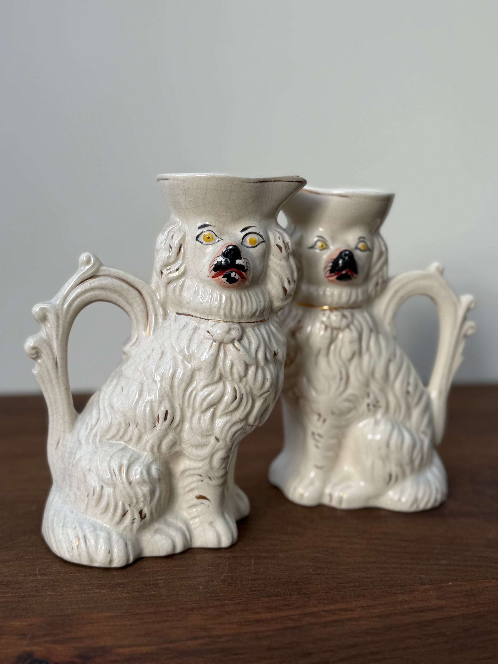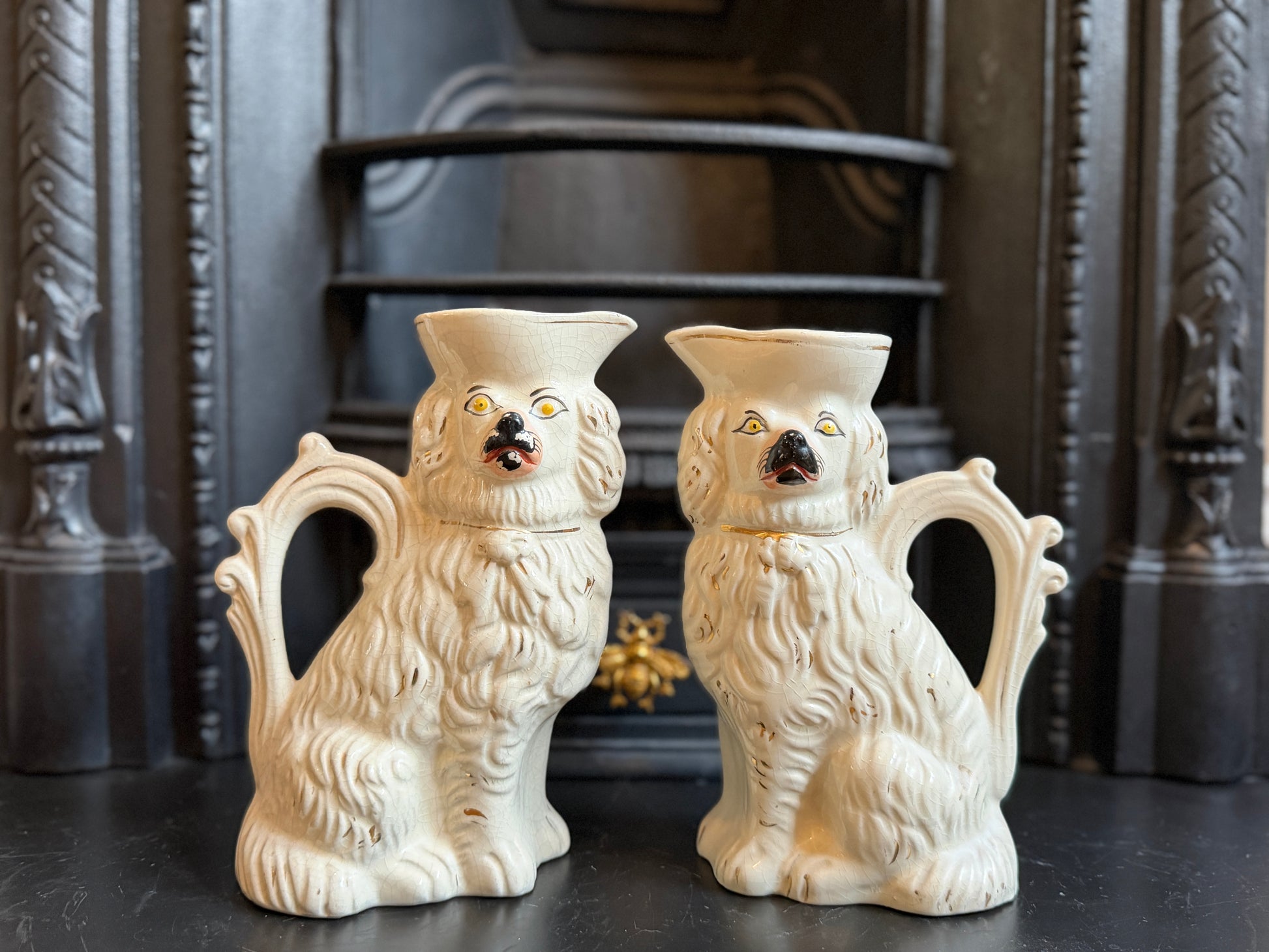 1850年頃に作られたと考えられる、大変レアなヴィクトリア時代のスタッフォードシャードッグ、スパニエルのジャグのペアです。おねだりポーズのデザインはよく見かけますが、こちらは静かに座るスパニエルをかたどったデザインで、落ち着いた佇まいが印象的です。