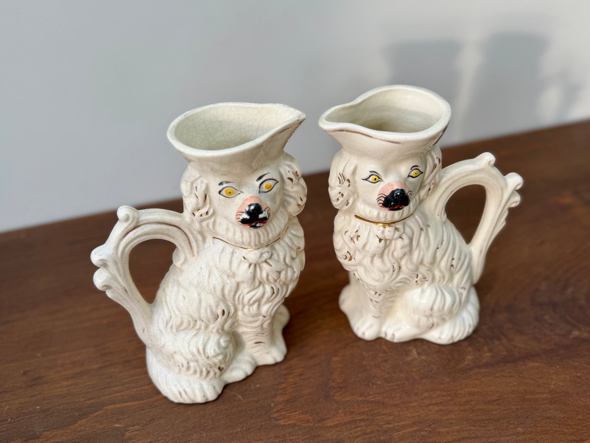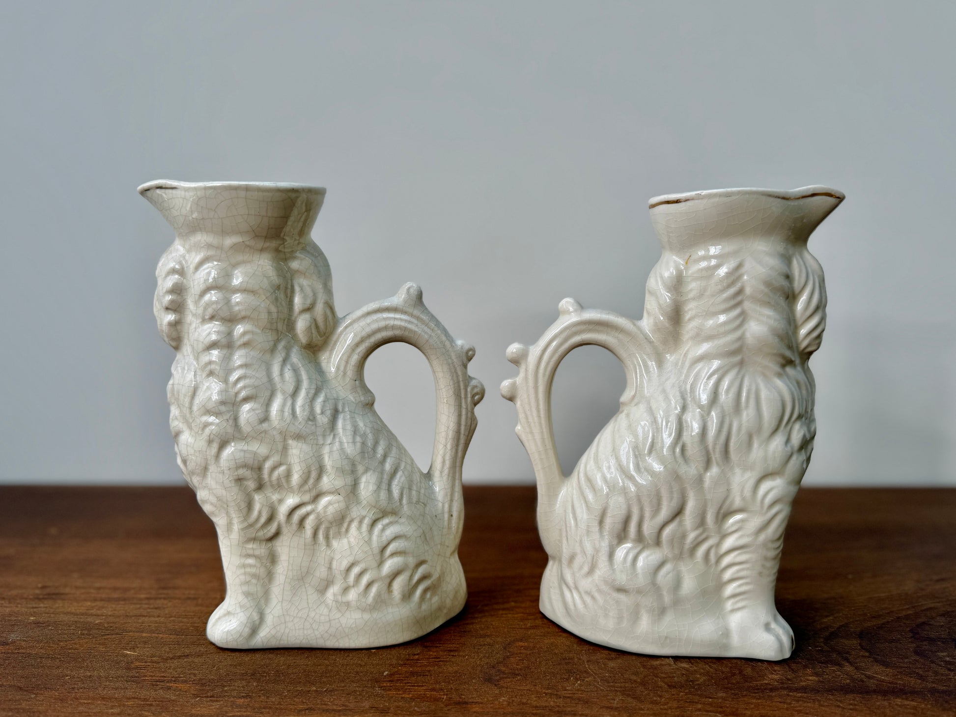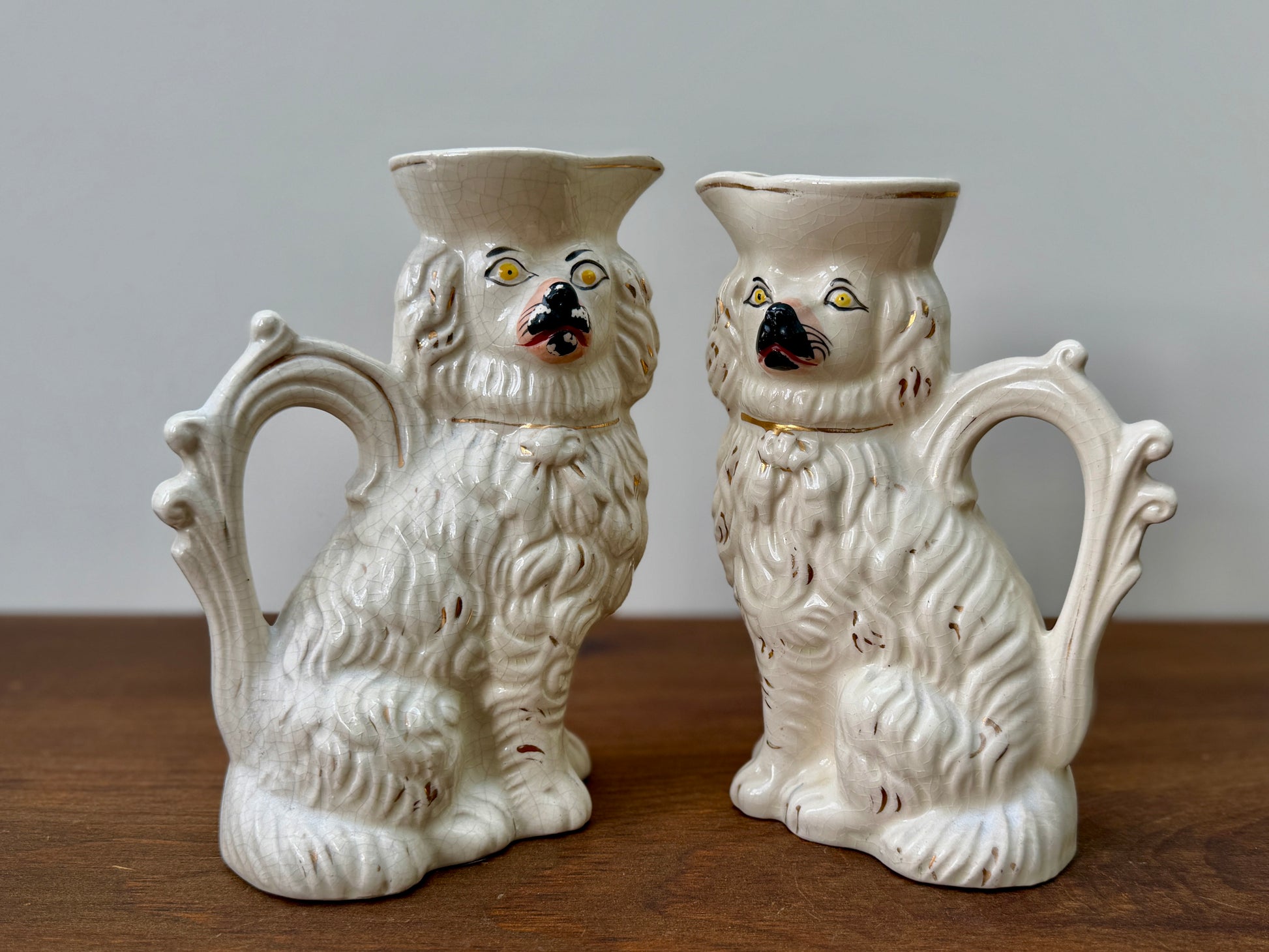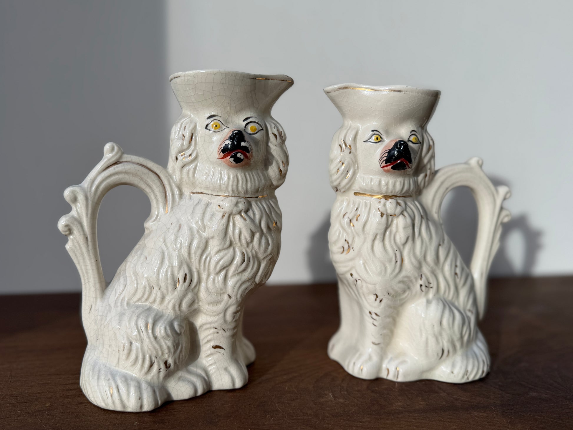 1850年頃に作られたと考えられる、大変レアなヴィクトリア時代のスタッフォードシャードッグ、スパニエルのジャグのペアです。おねだりポーズのデザインはよく見かけますが、こちらは静かに座るスパニエルをかたどったデザインで、落ち着いた佇まいが印象的です。