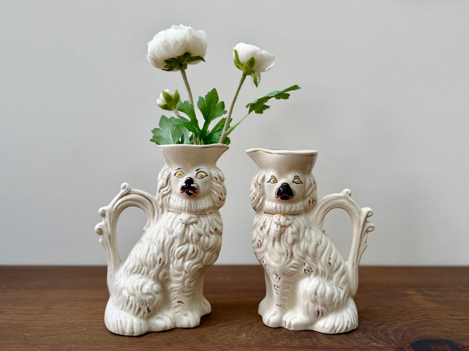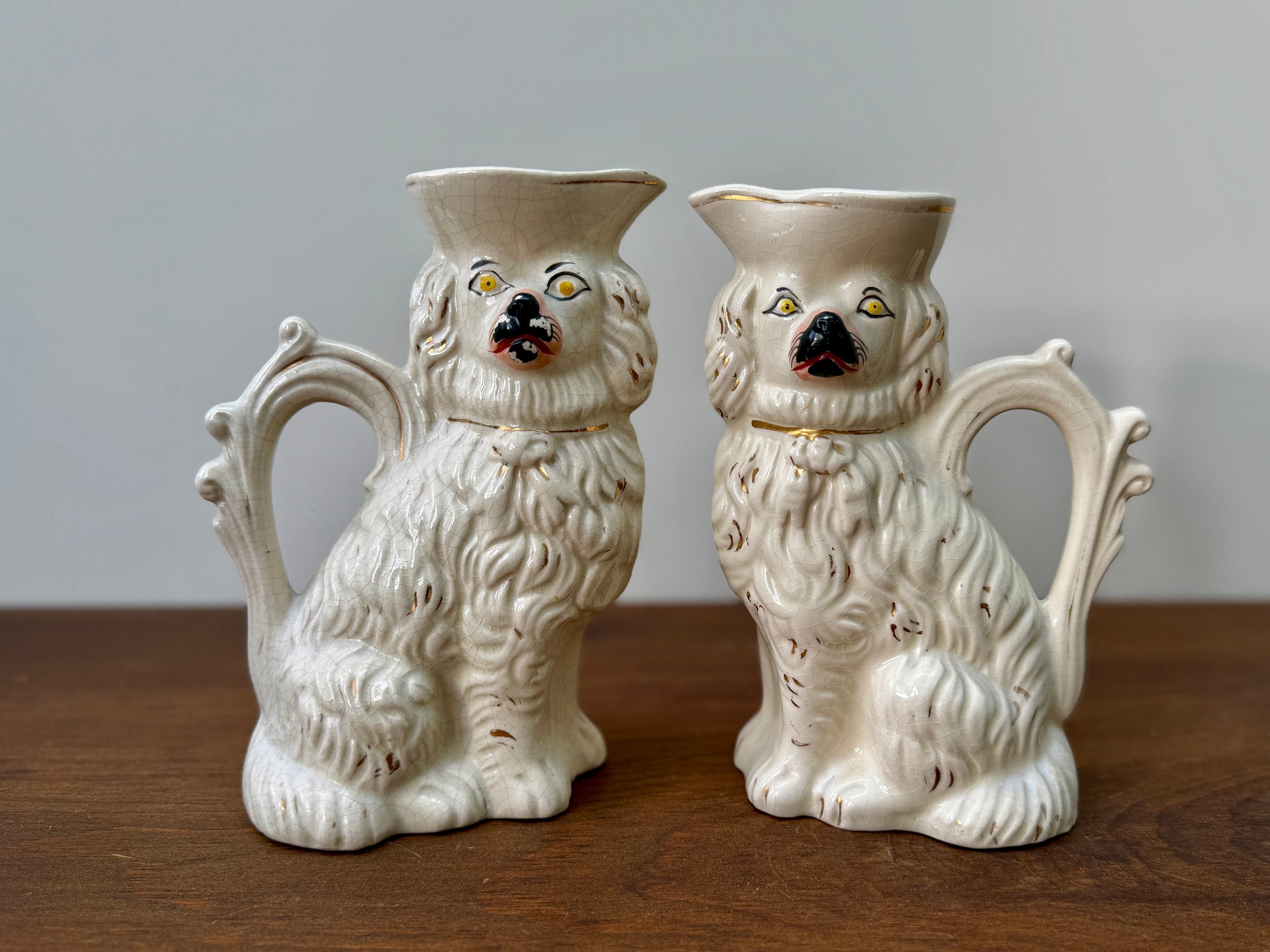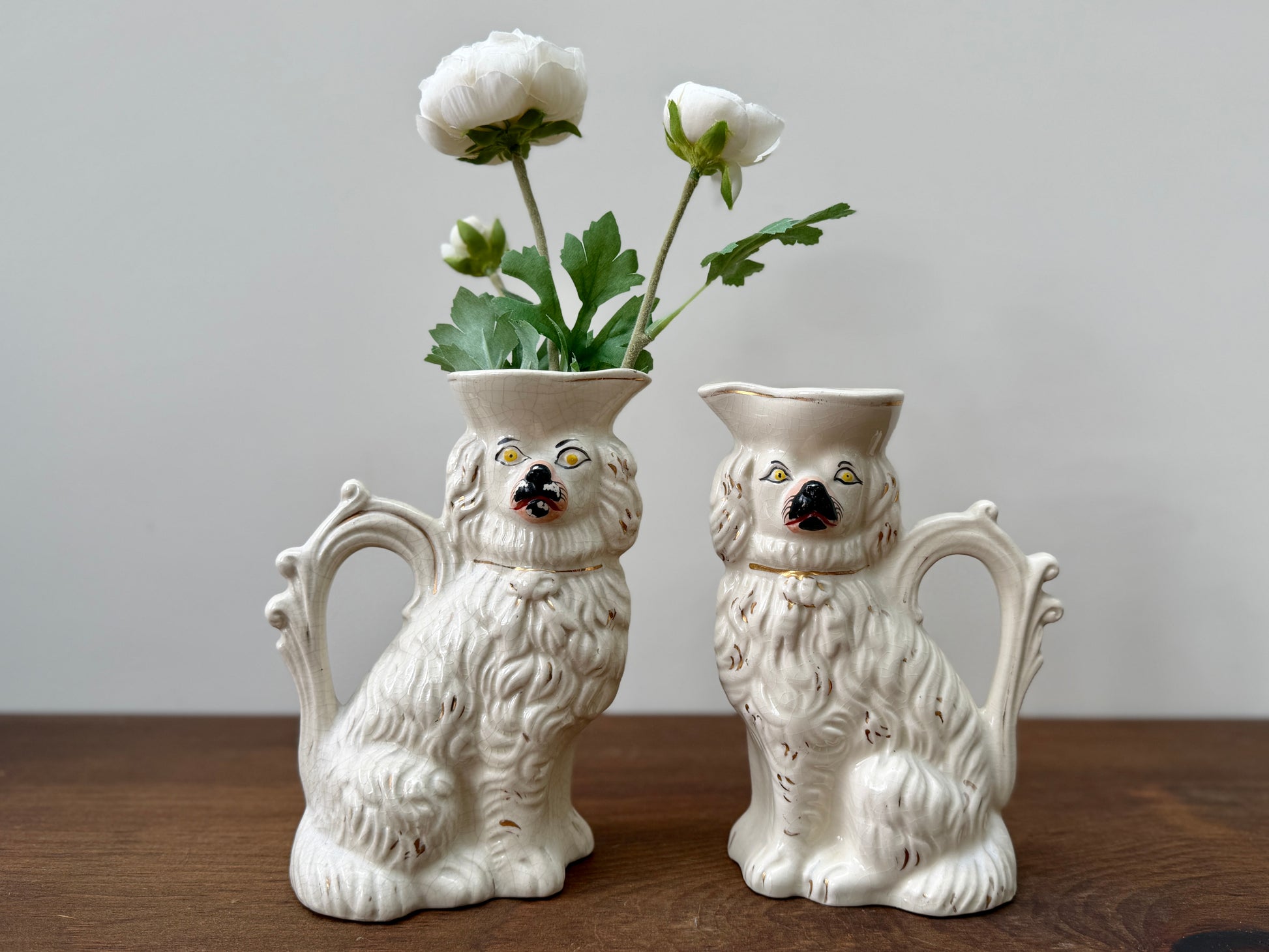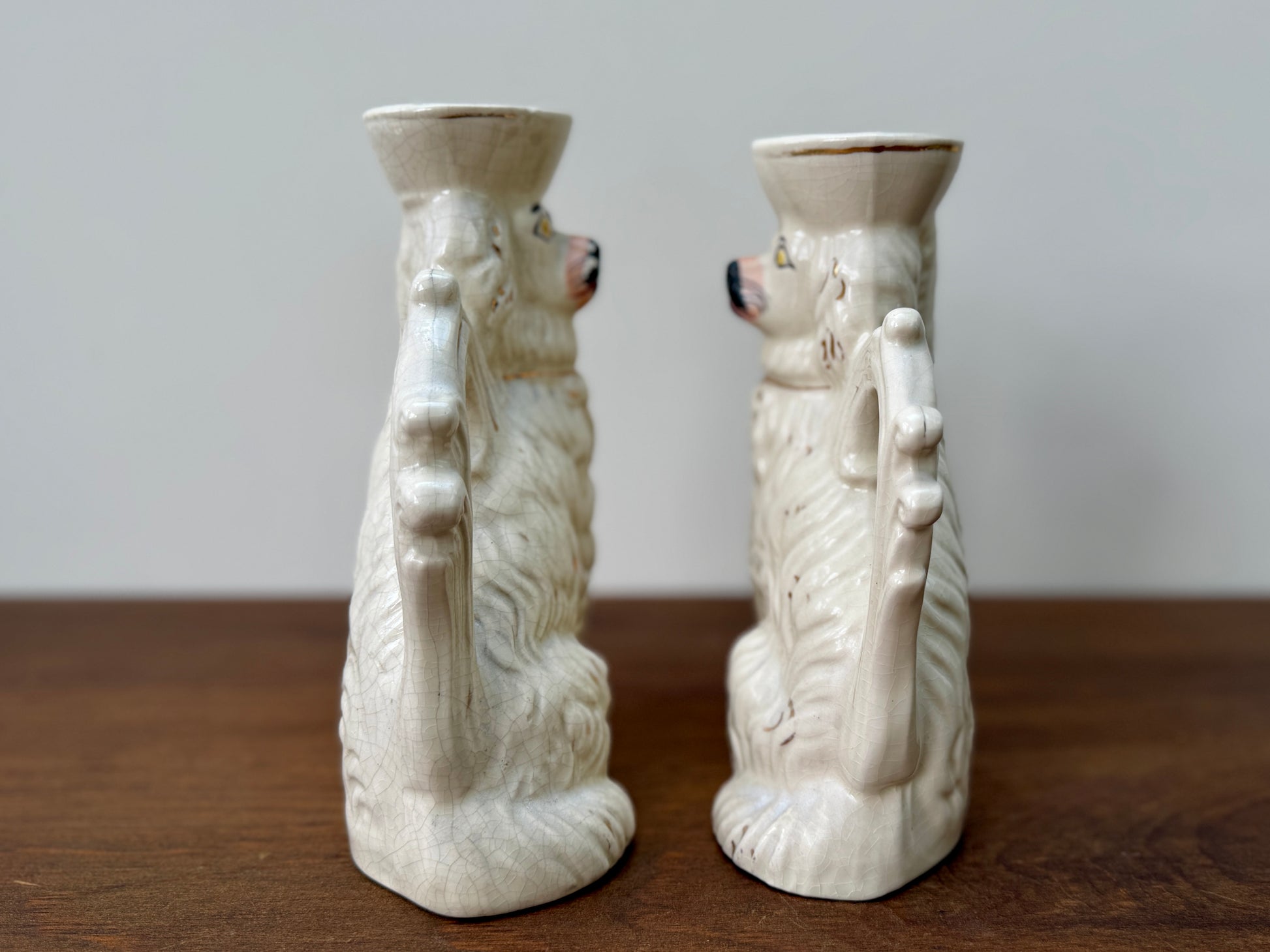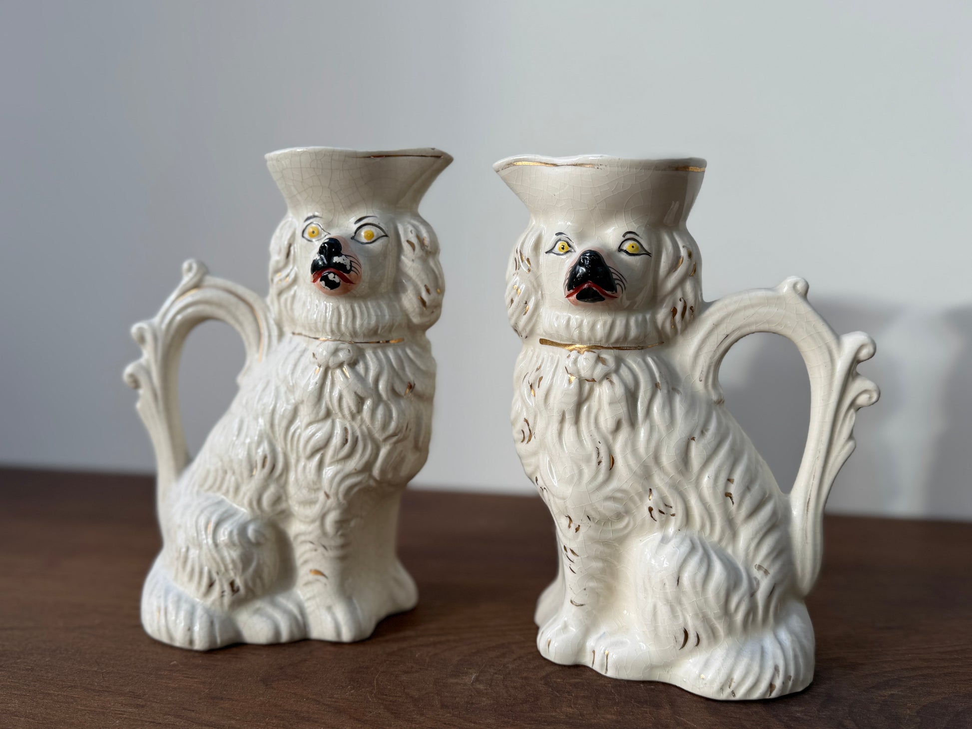 1850年頃に作られたと考えられる、大変レアなヴィクトリア時代のスタッフォードシャードッグ、スパニエルのジャグのペアです。おねだりポーズのデザインはよく見かけますが、こちらは静かに座るスパニエルをかたどったデザインで、落ち着いた佇まいが印象的です。
