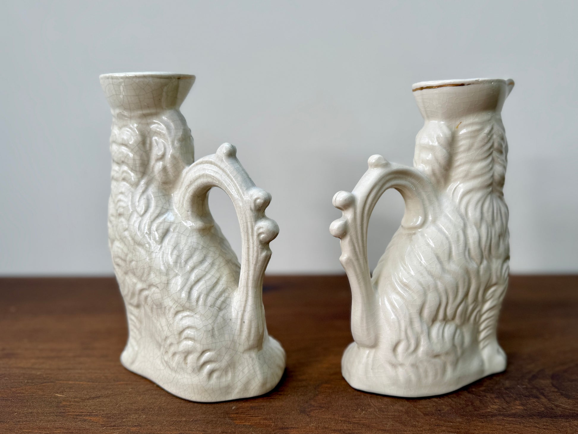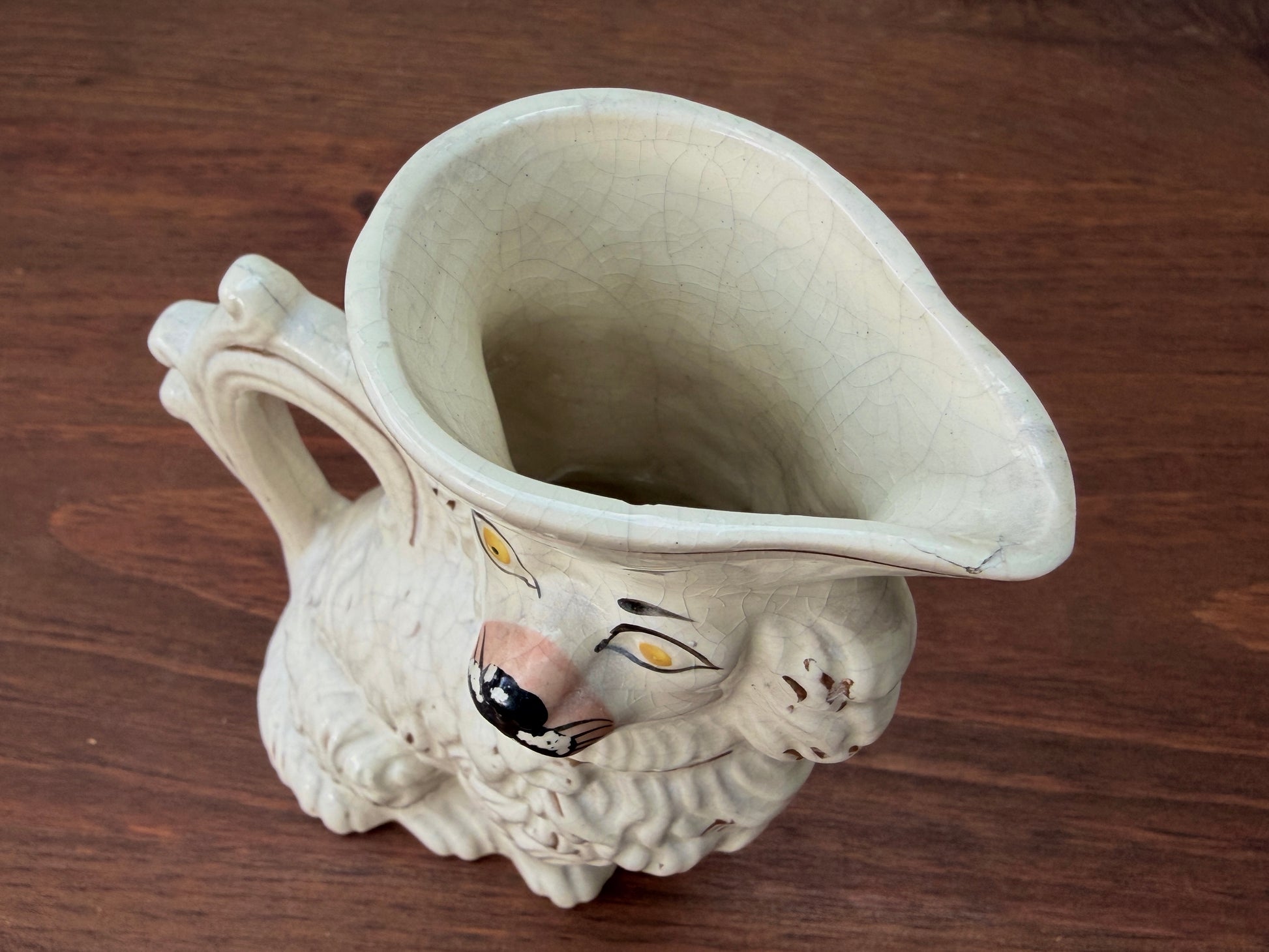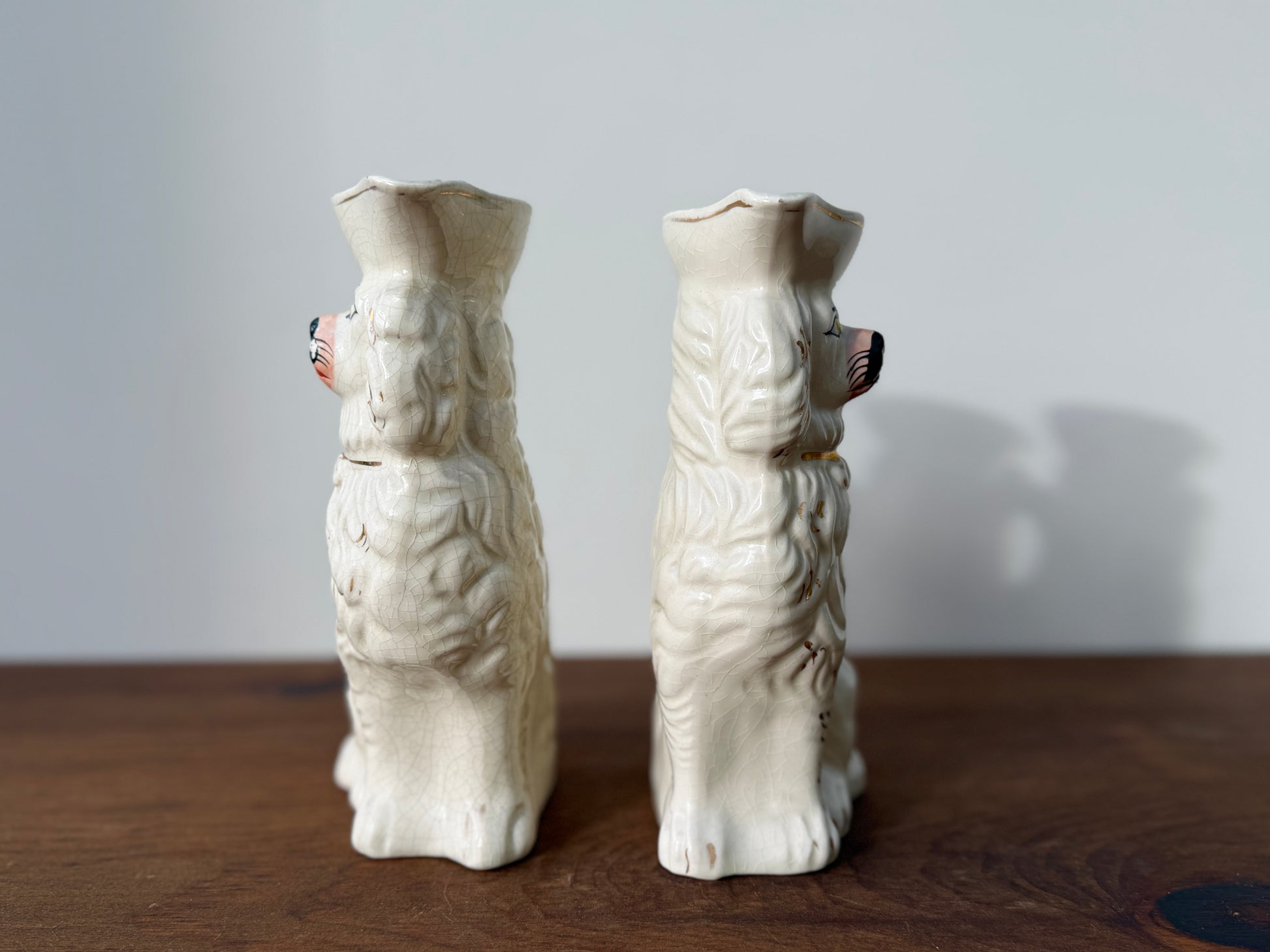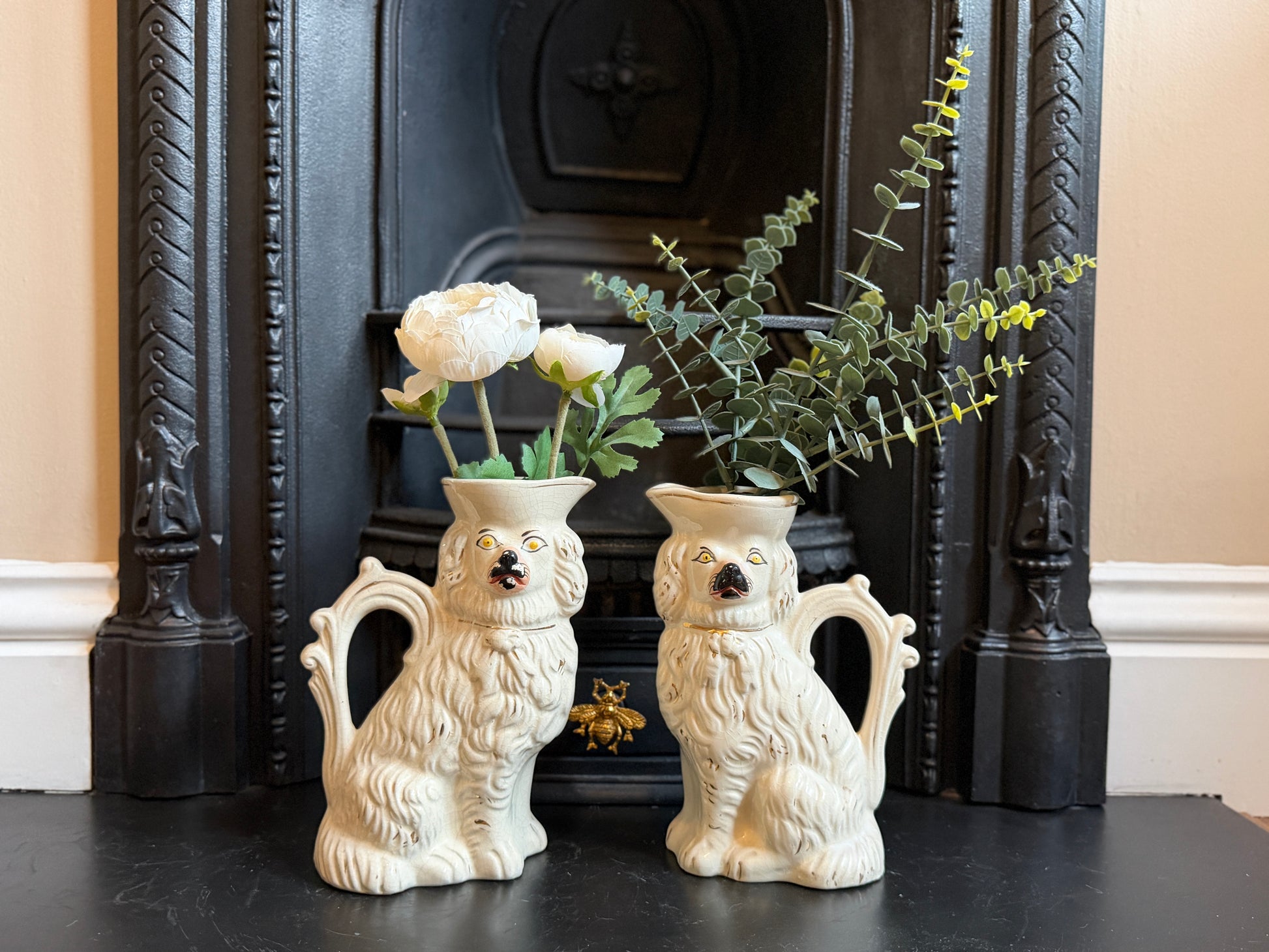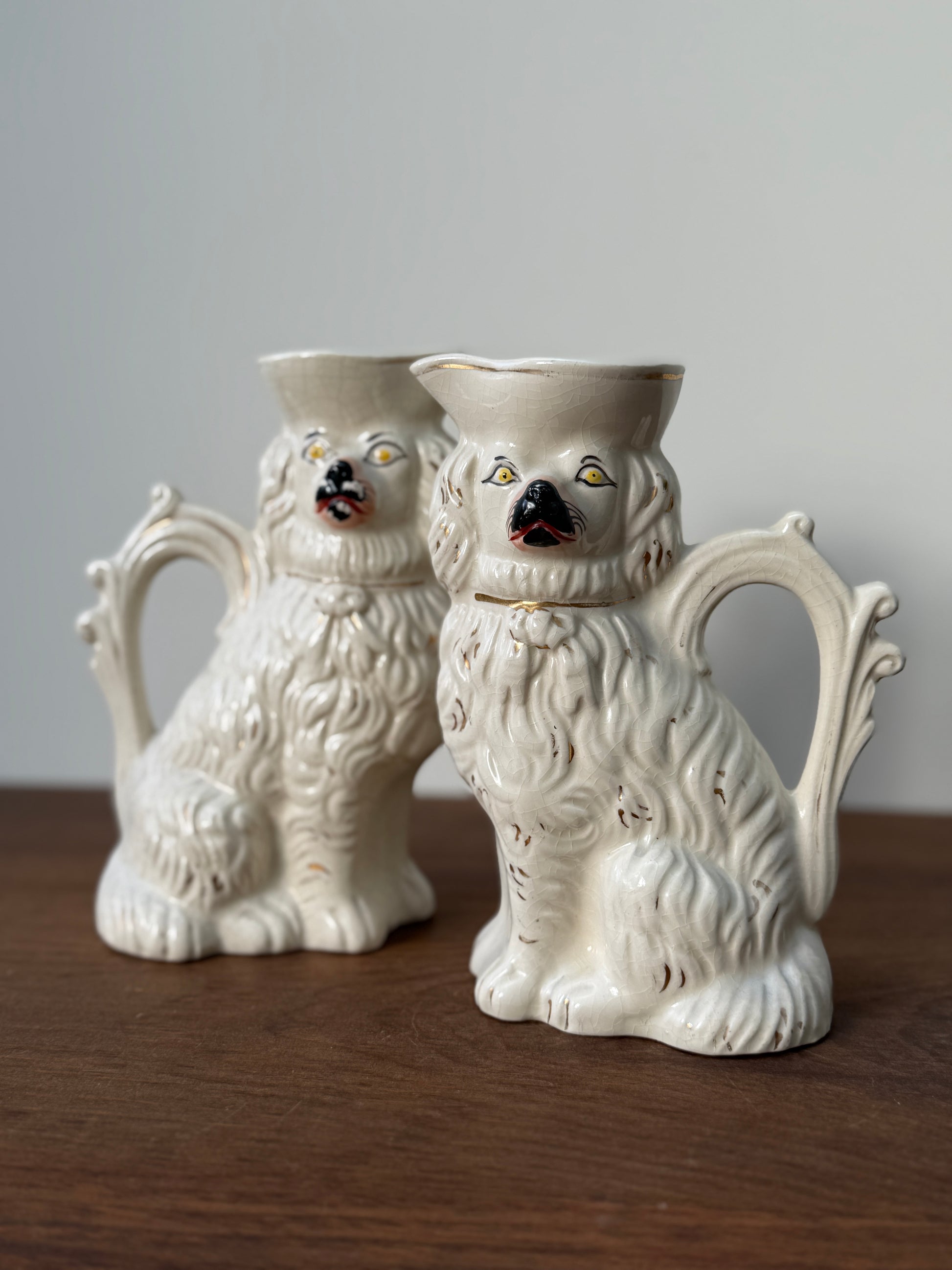 1850年頃に作られたと考えられる、大変レアなヴィクトリア時代のスタッフォードシャードッグ、スパニエルのジャグのペアです。おねだりポーズのデザインはよく見かけますが、こちらは静かに座るスパニエルをかたどったデザインで、落ち着いた佇まいが印象的です。