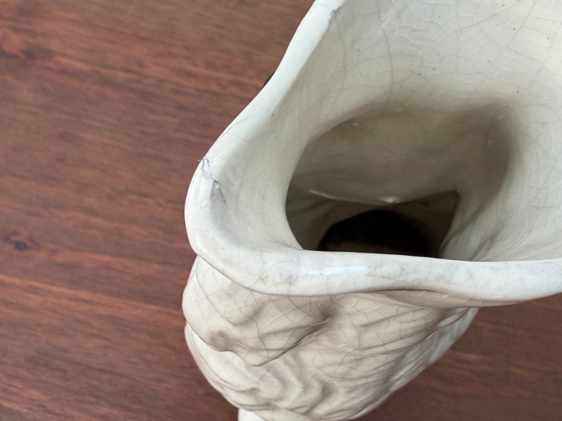 一体(左側)の注ぎ口部分に、ごく小さなヘアラインが見られますが、欠けた部分を接着したものではなく、古い時代に生じたものと考えられます。修復の痕跡は見られず、ディスプレイ時の印象を大きく損なうものではありません。詳しくは写真をご参照ください。