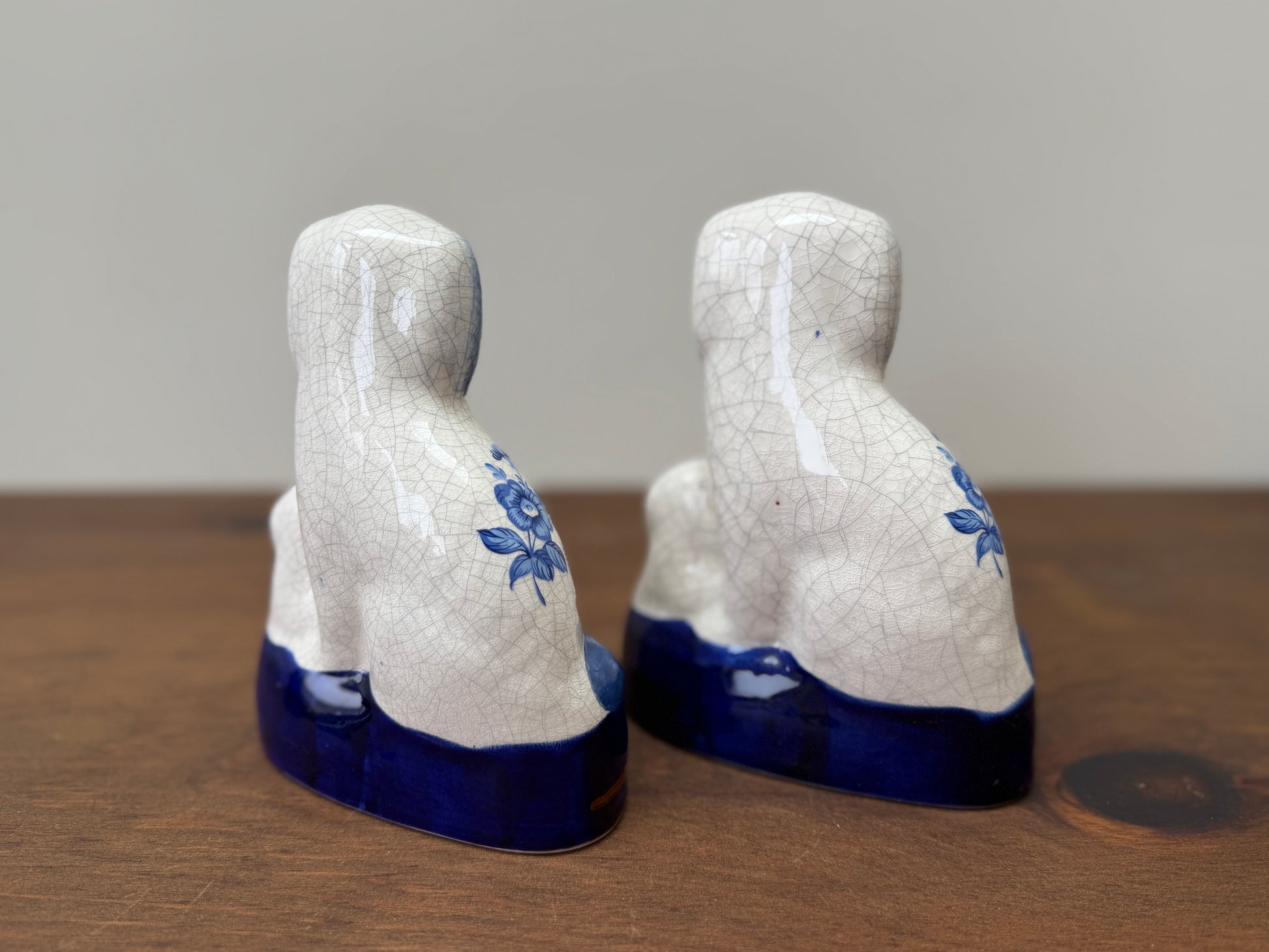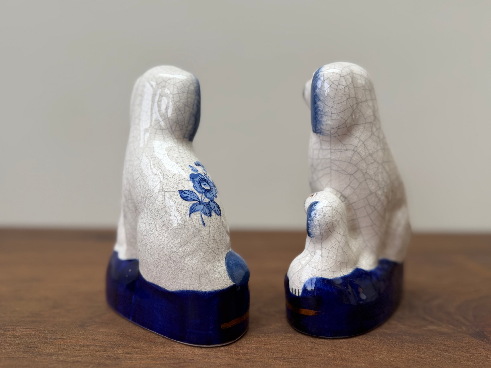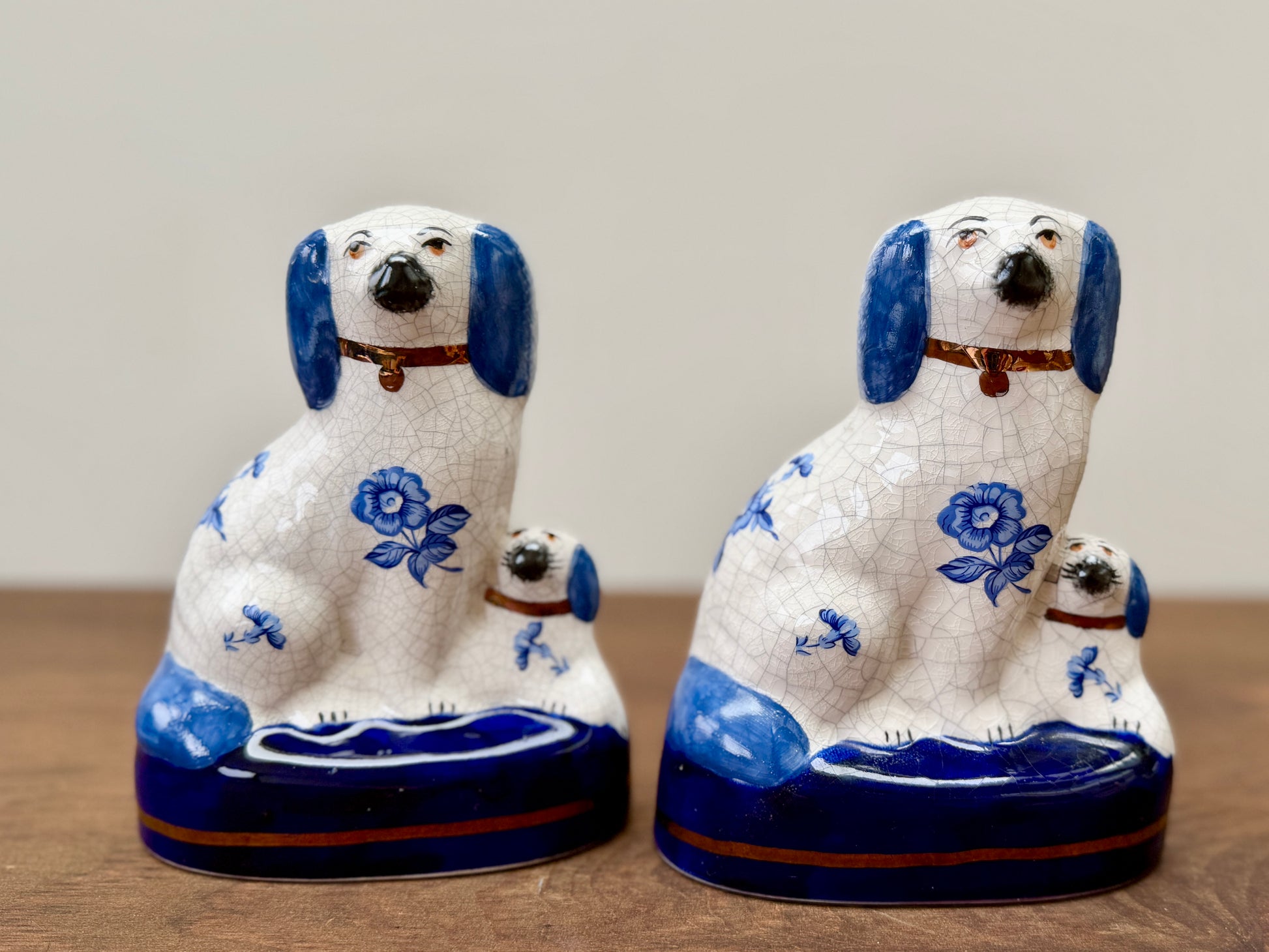 こちらは、ウィリアム・ケント(William Kent)によるヴィンテージのスタッフォードシャードッグのペアです。お母さん犬と子犬が寄り添うように座る、ほっと心が和むようなチャーミングな一対です。白いボディに青い花柄が描かれた希少なデザインです。