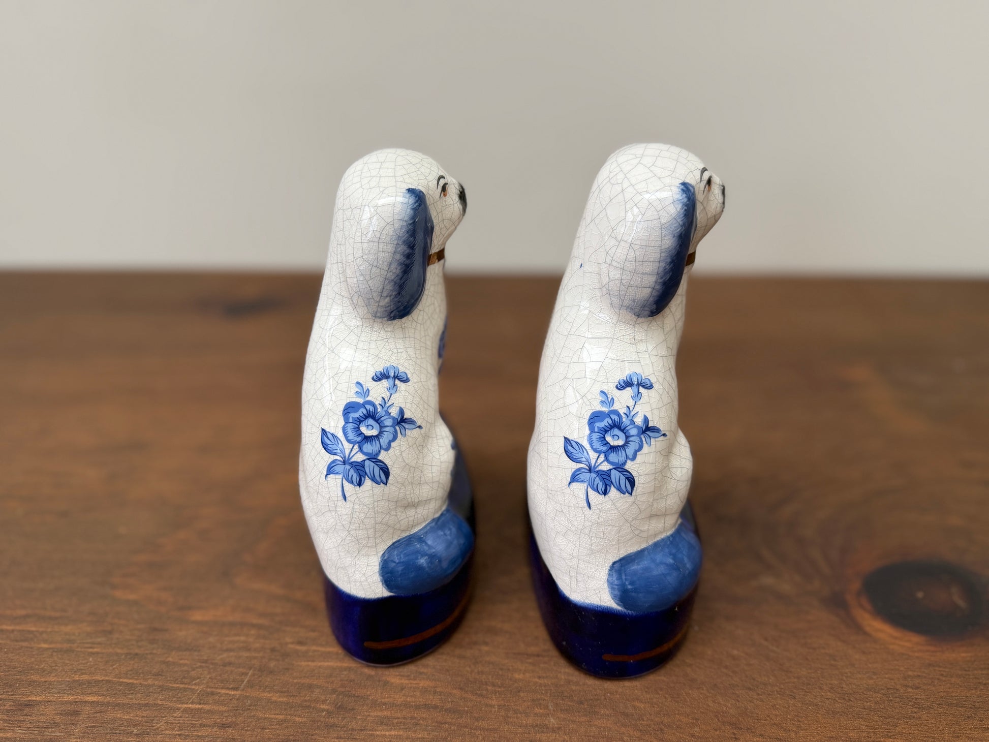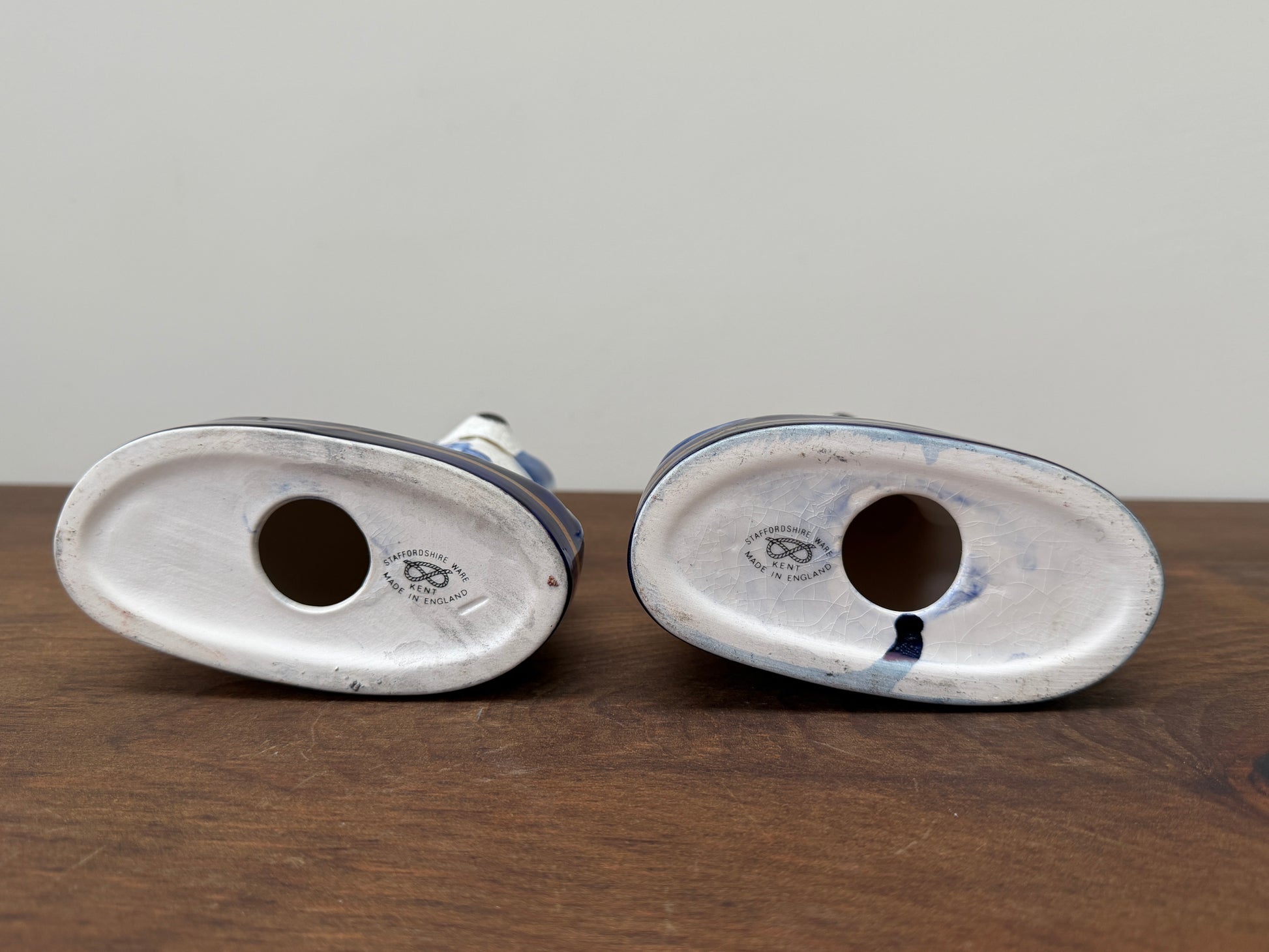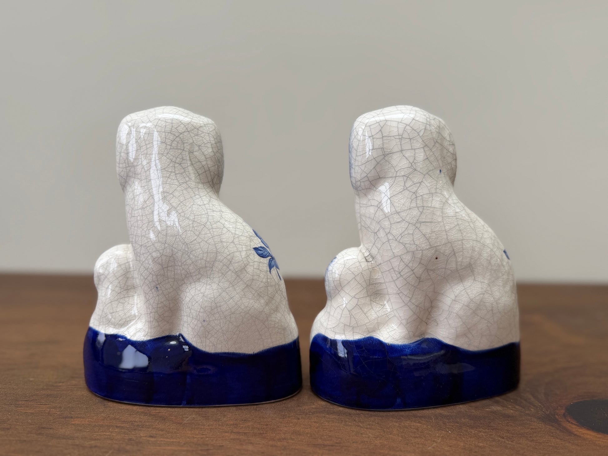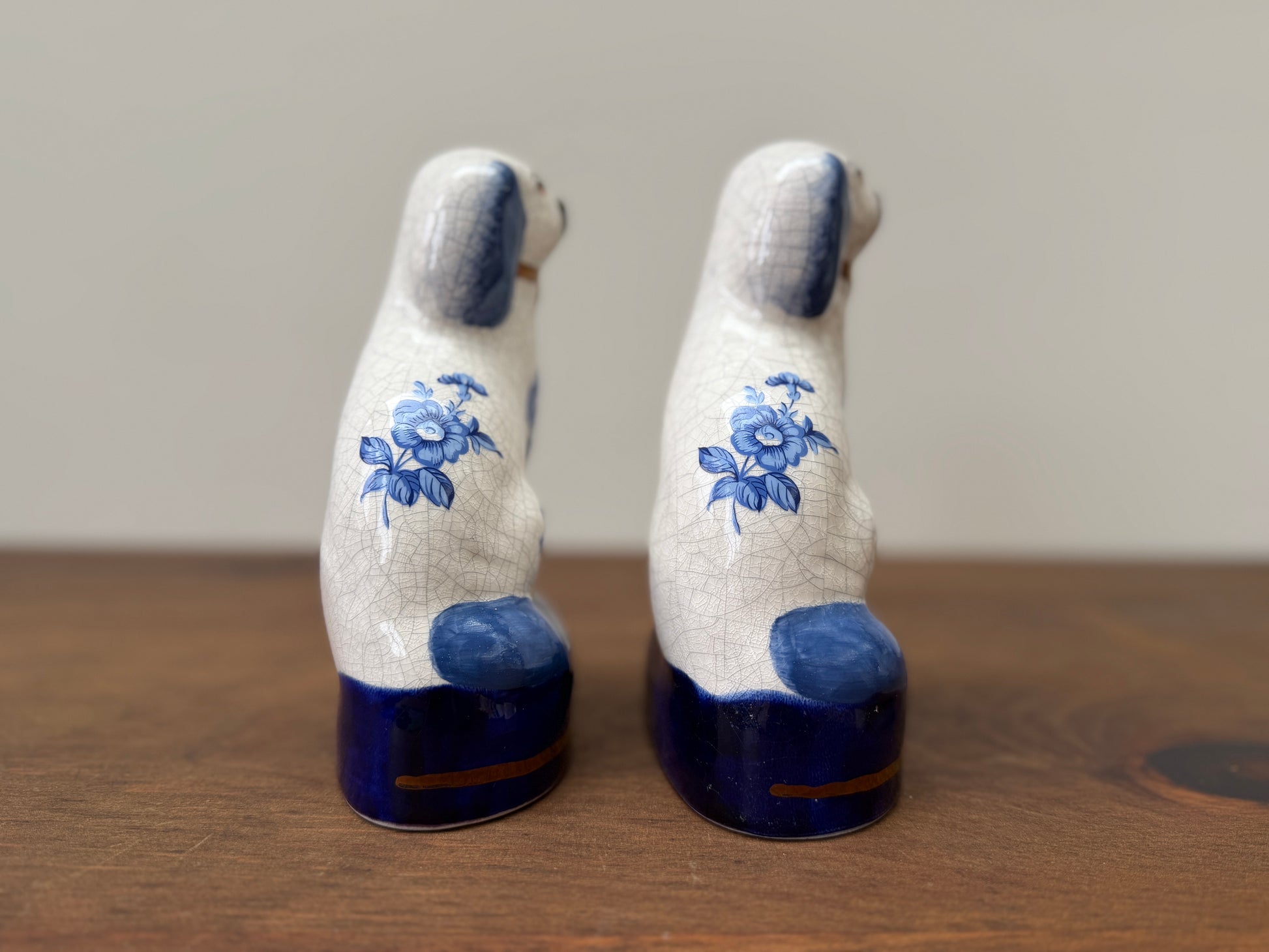 こちらは、ウィリアム・ケント(William Kent)によるヴィンテージのスタッフォードシャードッグのペアです。お母さん犬と子犬が寄り添うように座る、ほっと心が和むようなチャーミングな一対です。白いボディに青い花柄が描かれた希少なデザインです。
