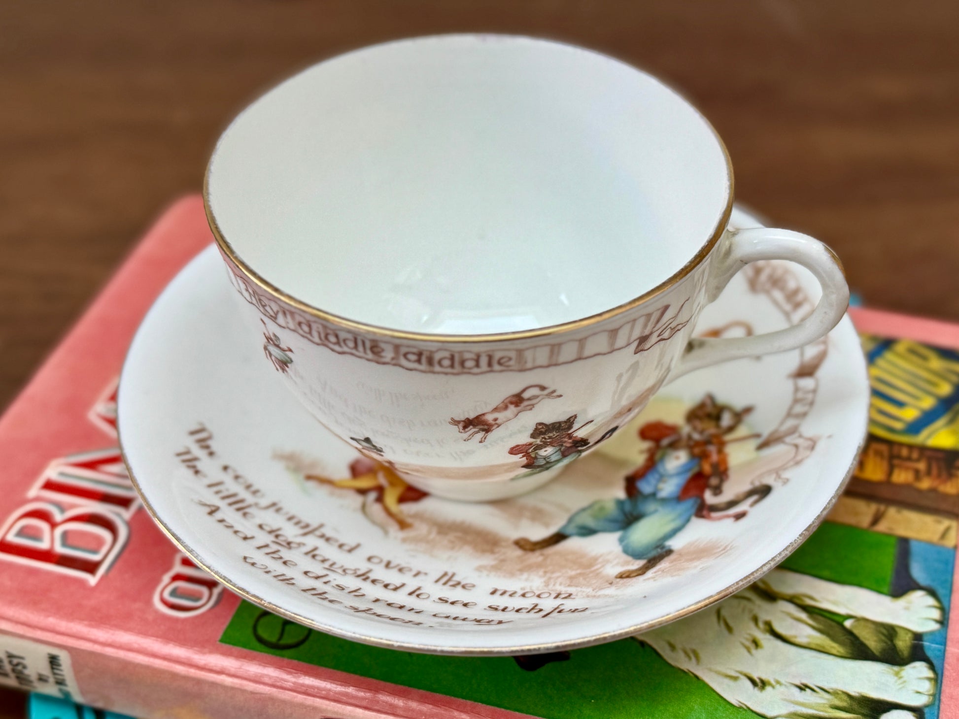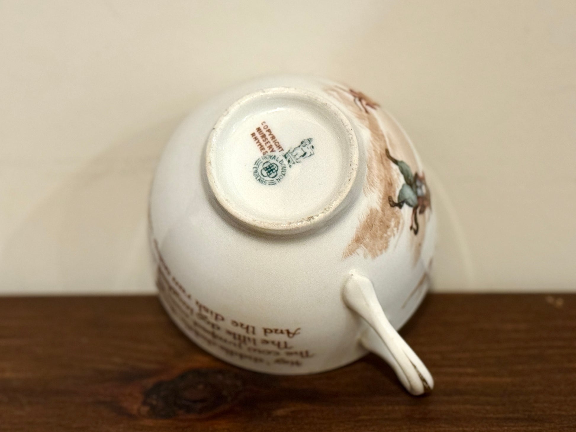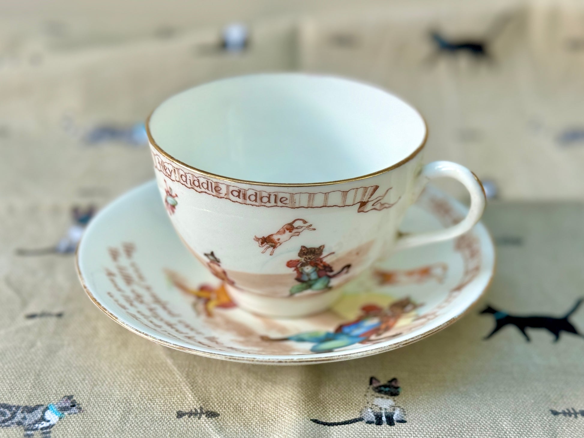 ロイヤルドルトン社、ナーサリーライム「ヘイ・ディドル・ディドル」柄のアンティーク・カップ&ソーサー|C.1908年頃