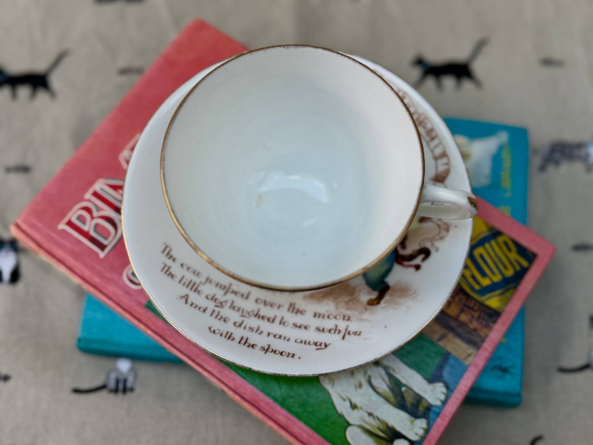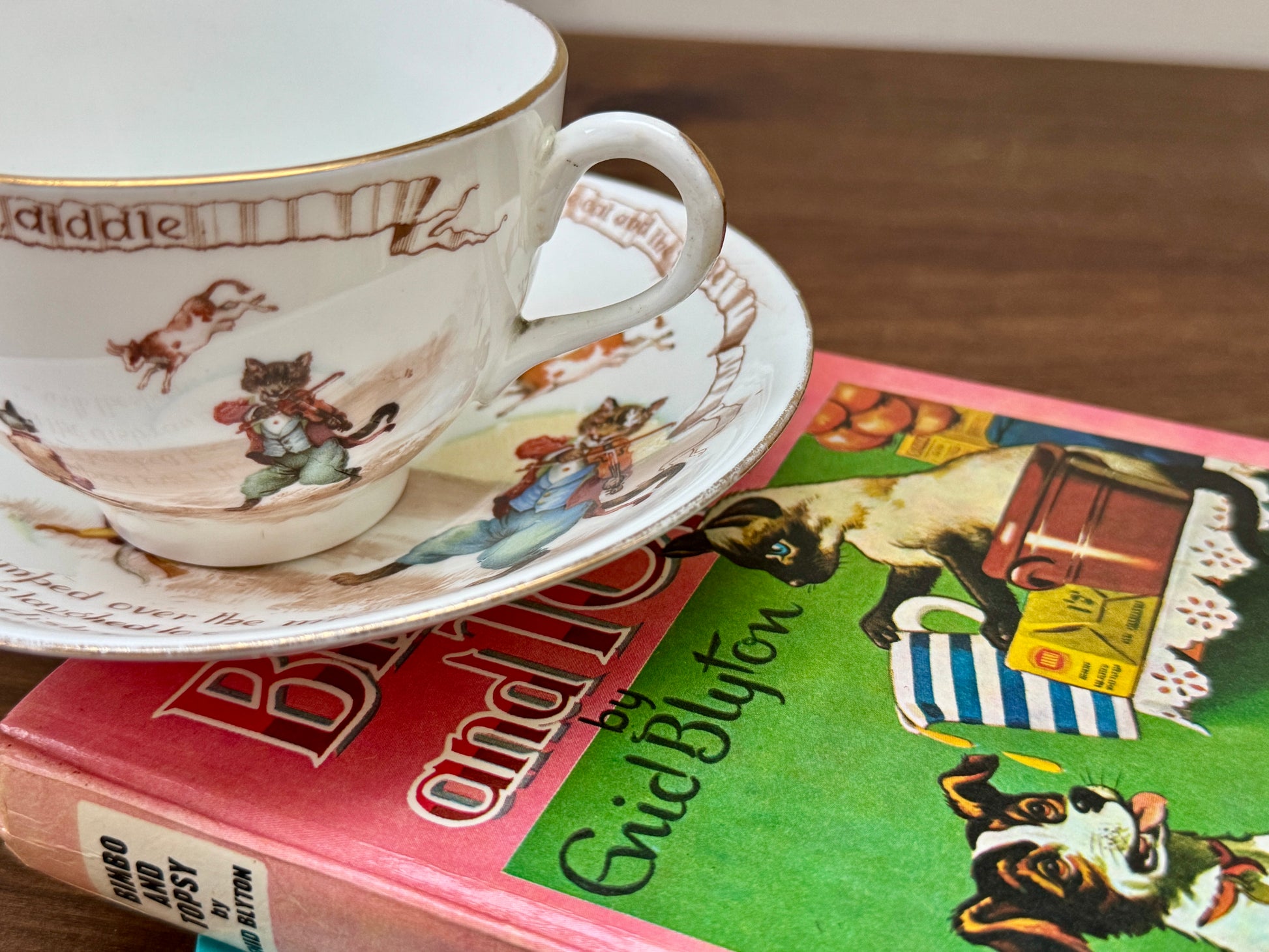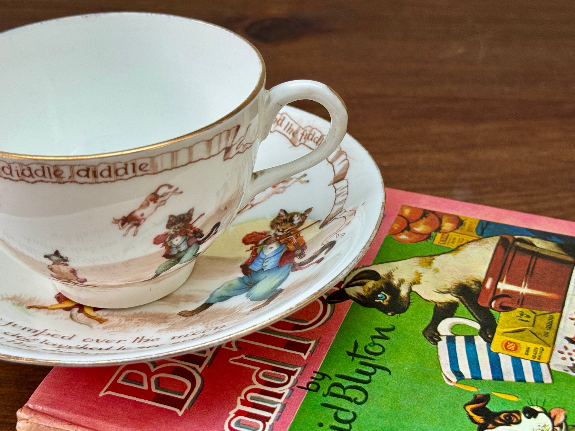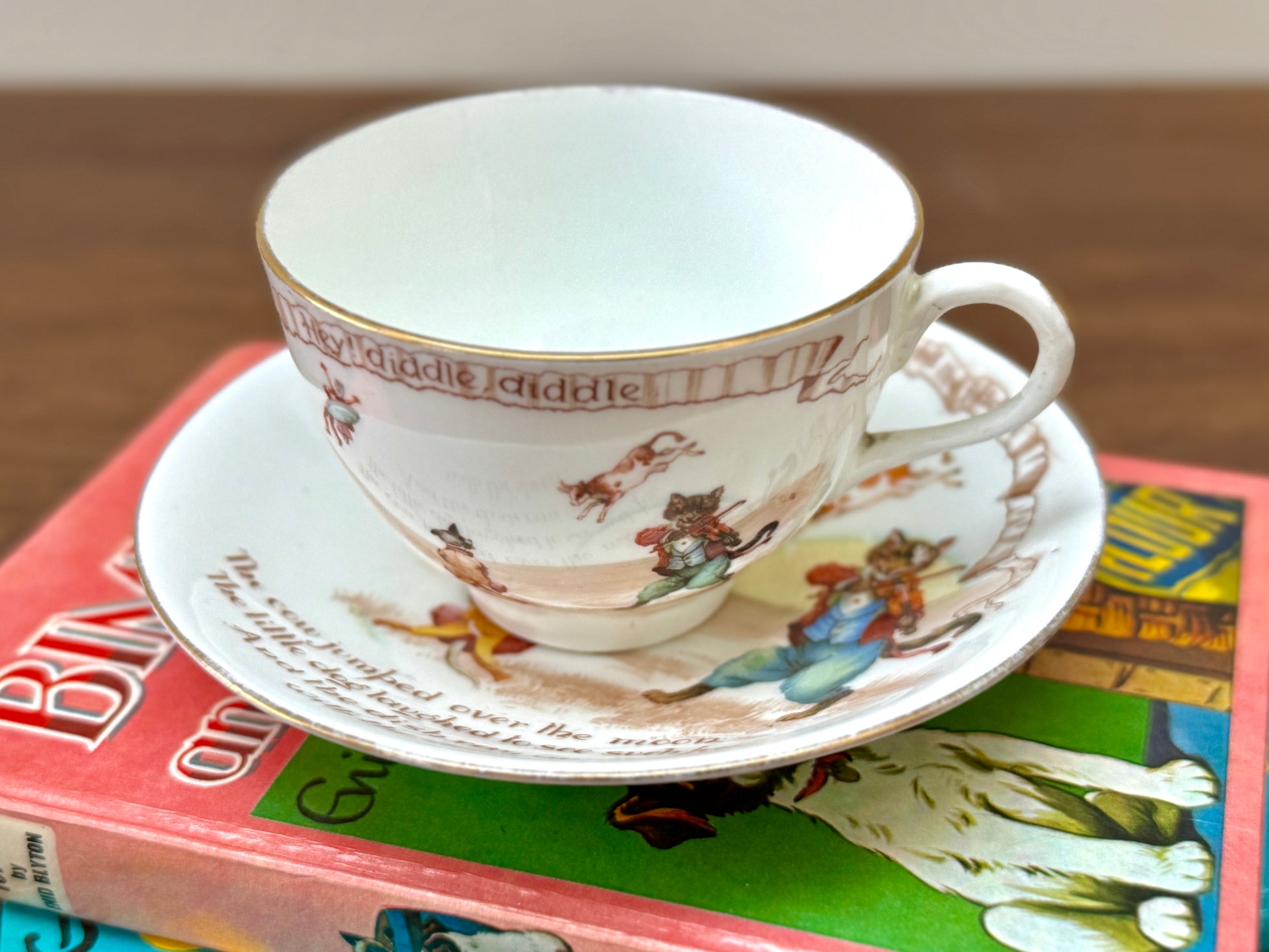 ロイヤルドルトン社、ナーサリーライム「ヘイ・ディドル・ディドル」柄のアンティーク・カップ&ソーサー|C.1908年頃