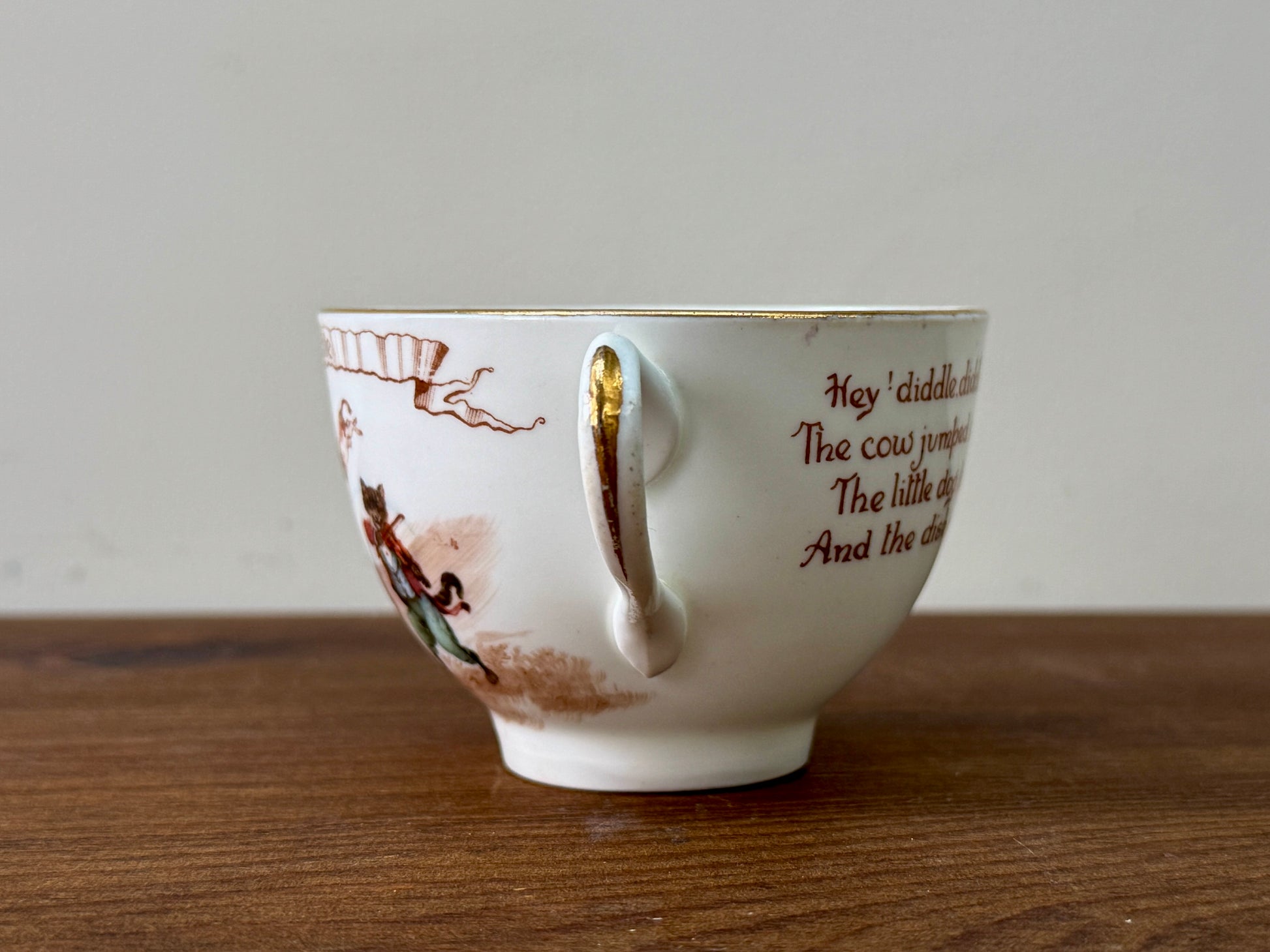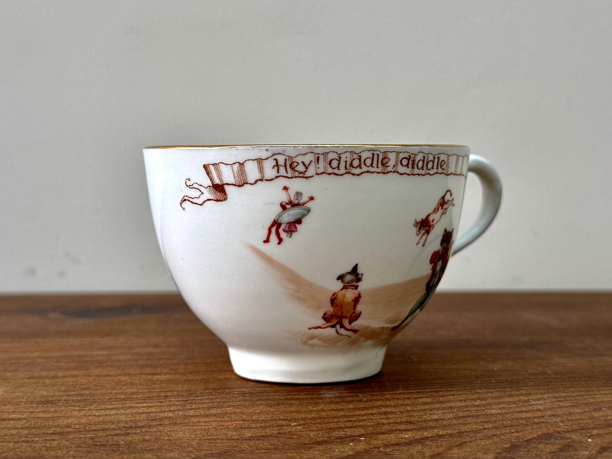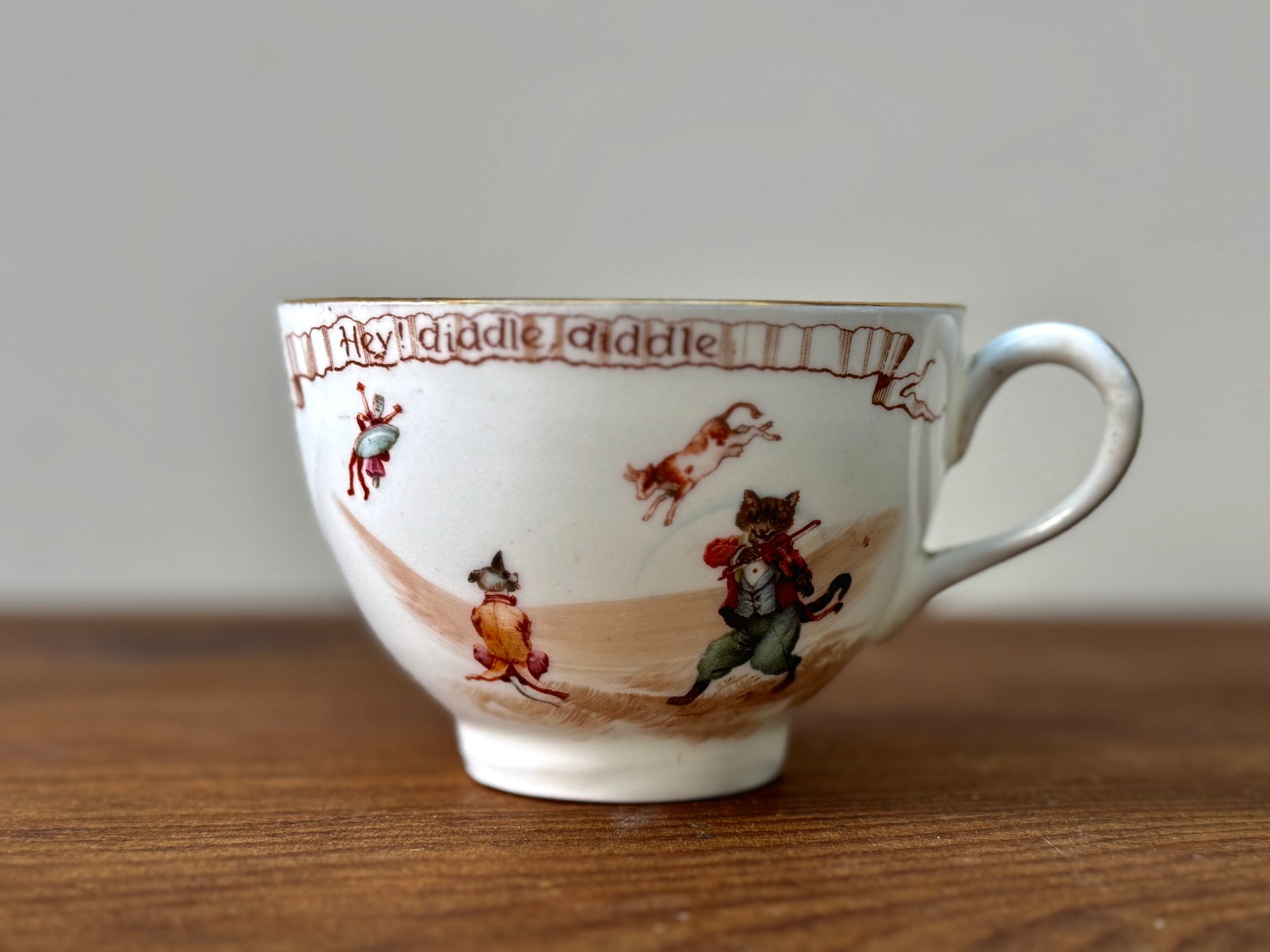 1908年頃に作られた、ロイヤルドルトン初期のナーサリーライムシリーズ「Hey Diddle Diddle」のカップ&ソーサーです。エドワード朝の雰囲気が漂う、優しいセピア調の転写と繊細な彩色、そして縁にあしらわれた金彩が、時代を超えた可愛らしさと上品さを引き立てています。
