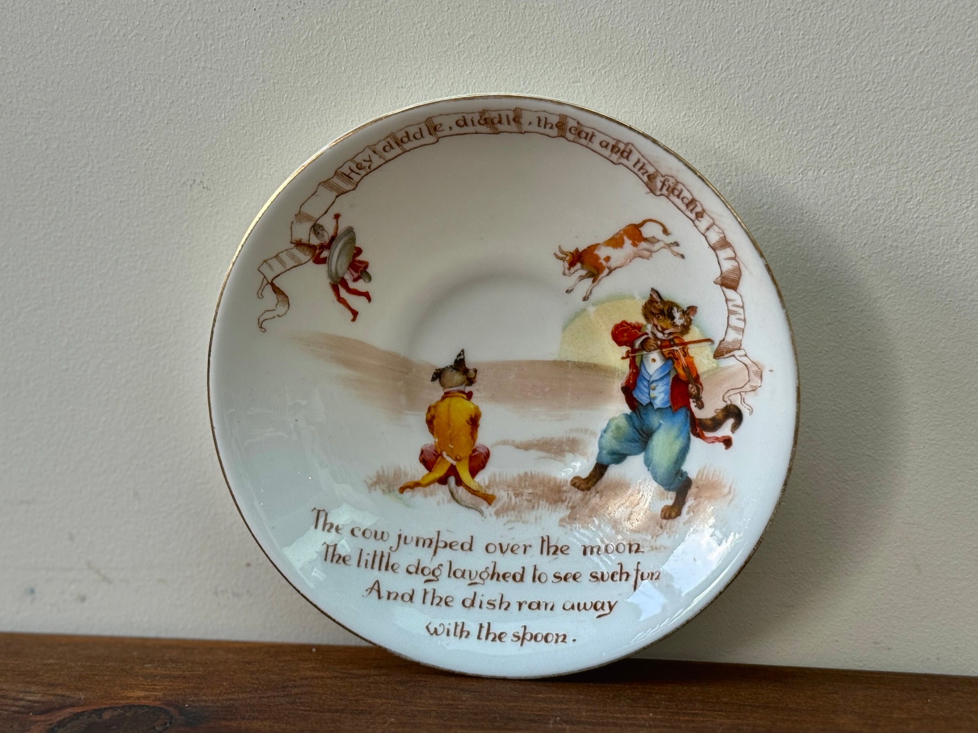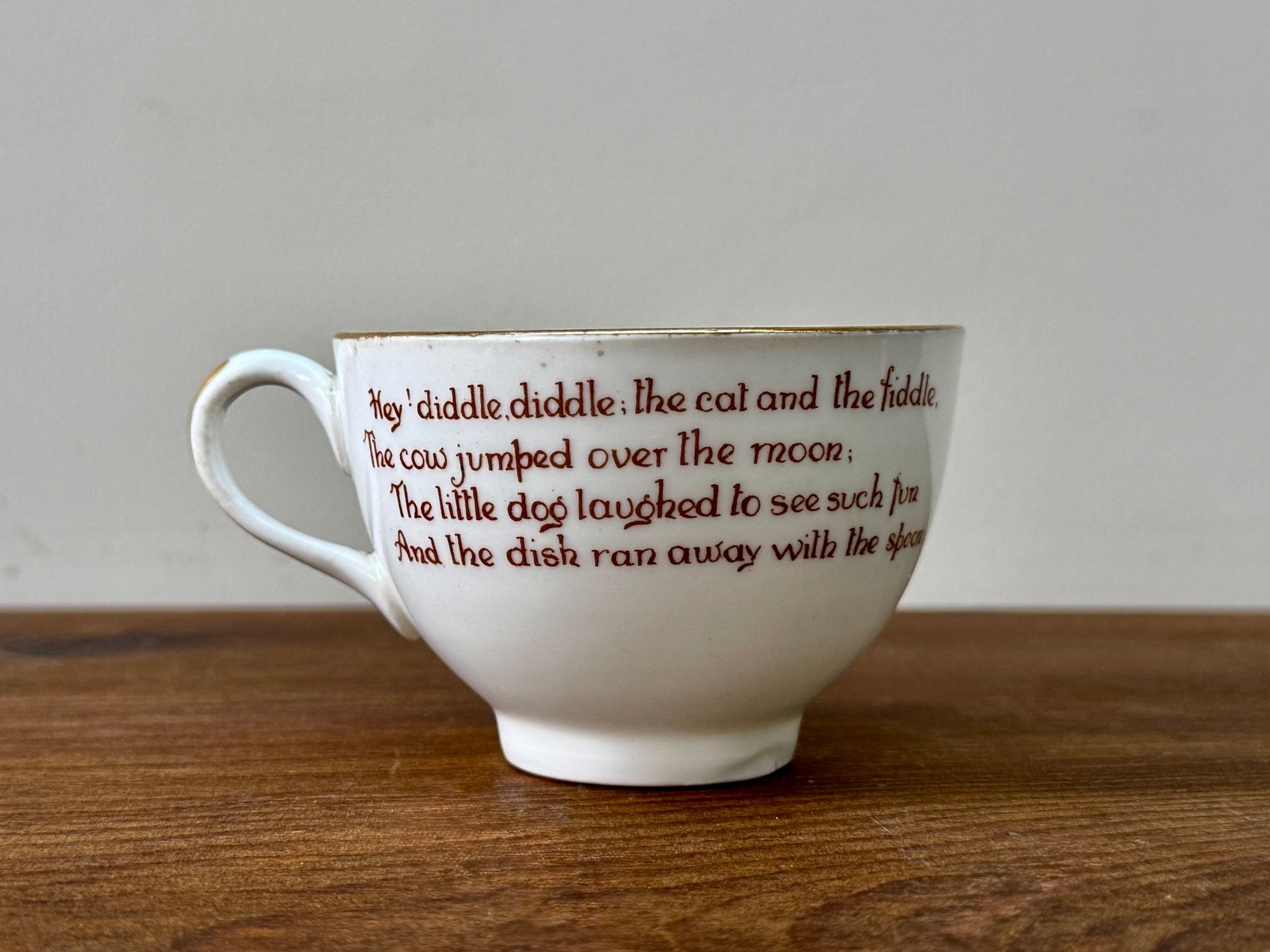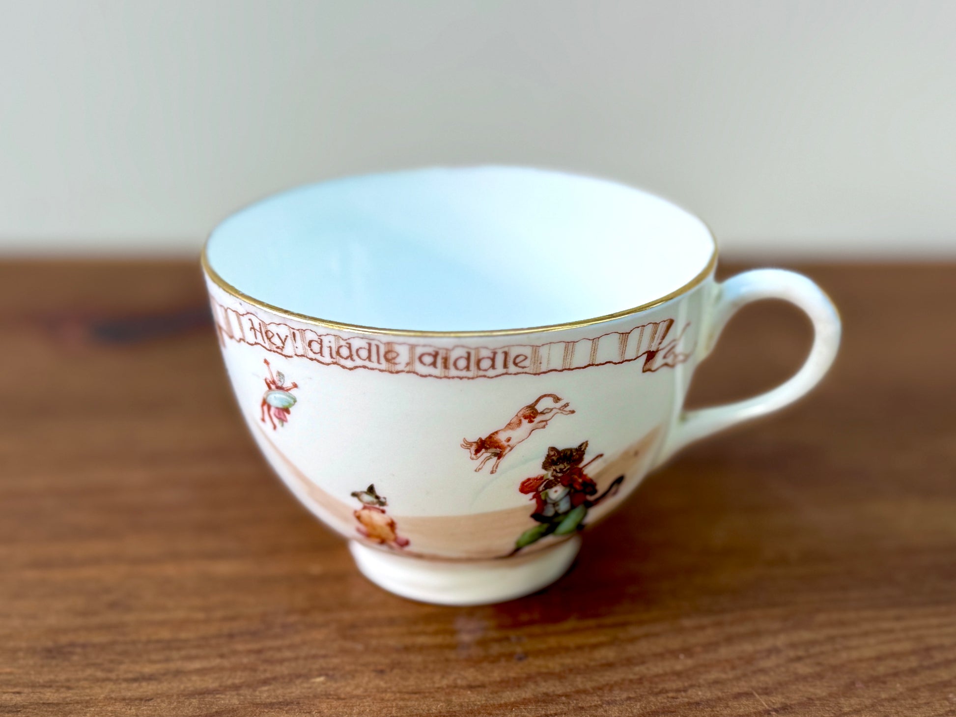 1908年頃に作られた、ロイヤルドルトン初期のナーサリーライムシリーズ「Hey Diddle Diddle」のカップ&ソーサーです。エドワード朝の雰囲気が漂う、優しいセピア調の転写と繊細な彩色、そして縁にあしらわれた金彩が、時代を超えた可愛らしさと上品さを引き立てています。