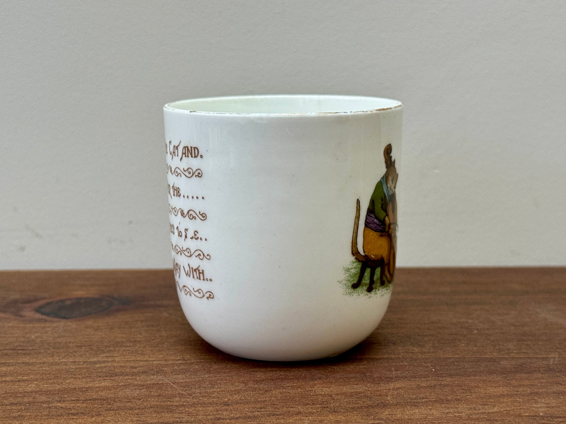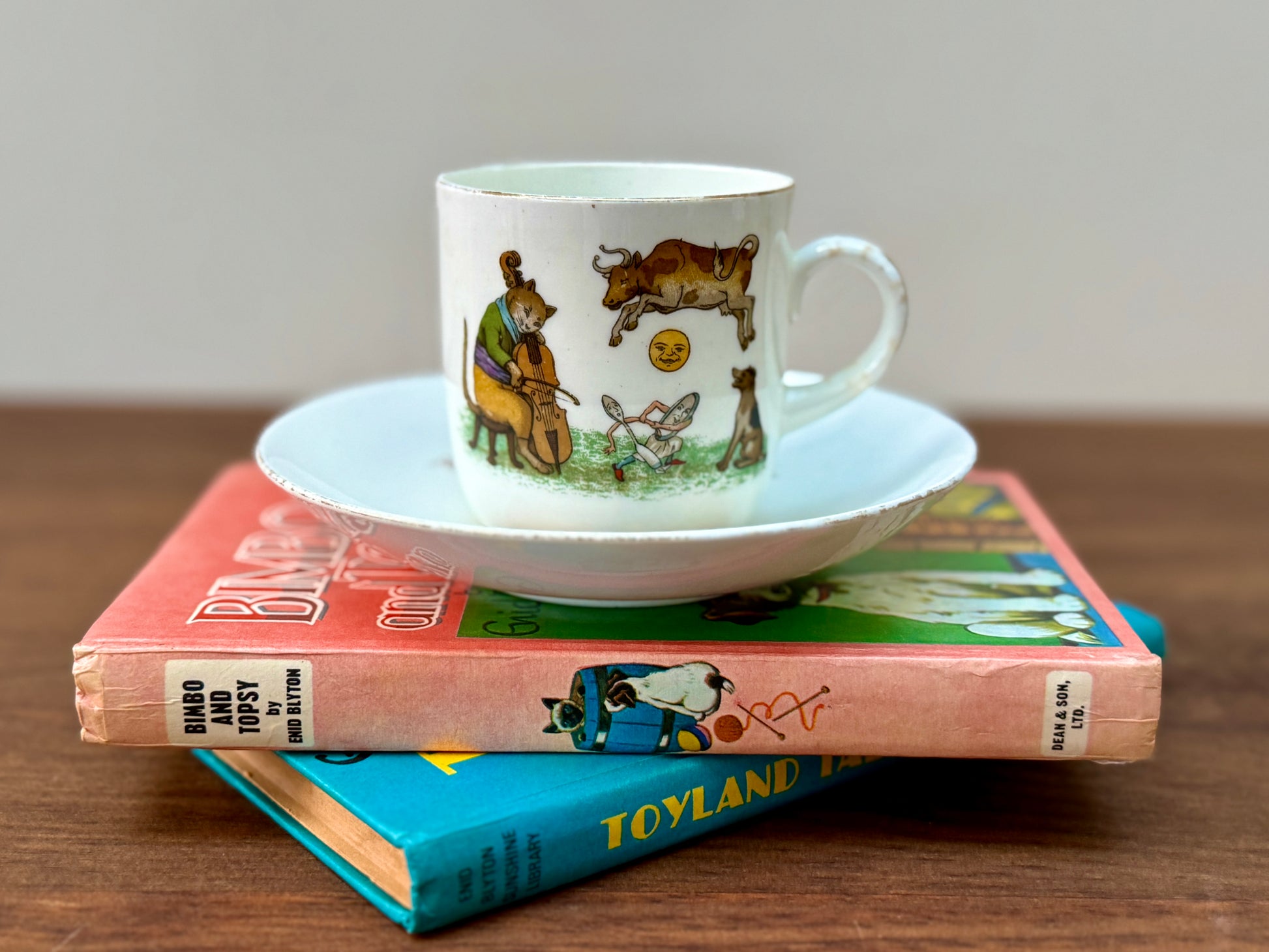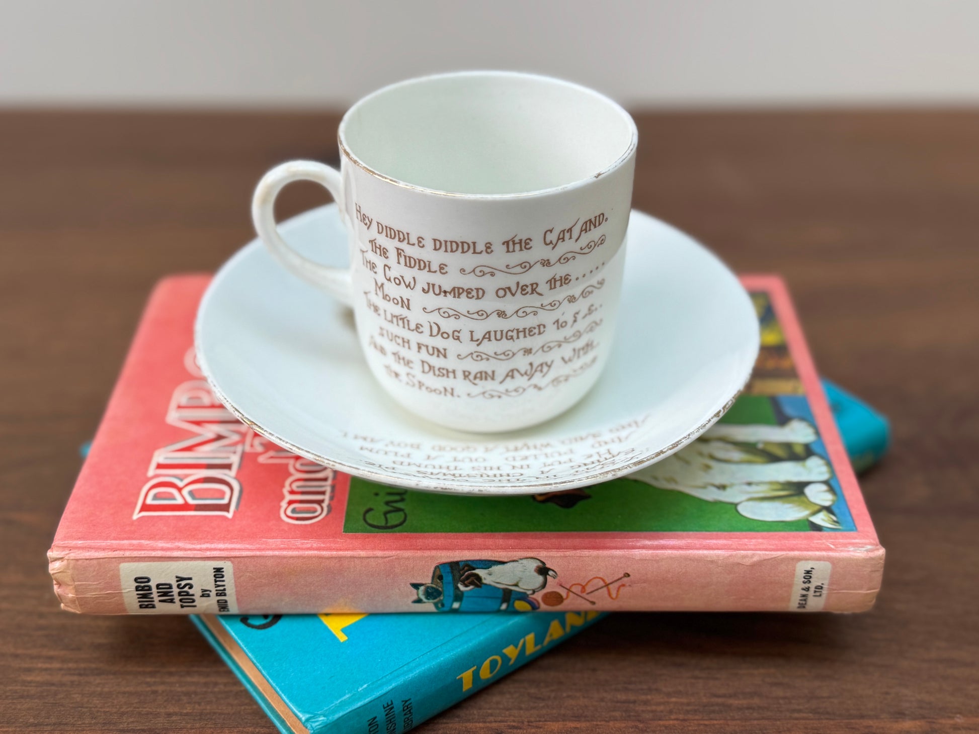 タスカン・チャイナ社、ナーサリーライム「ヘイ・ディドル・ディドル」柄のアンティーク・カップ&ソーサー|c.1910年代