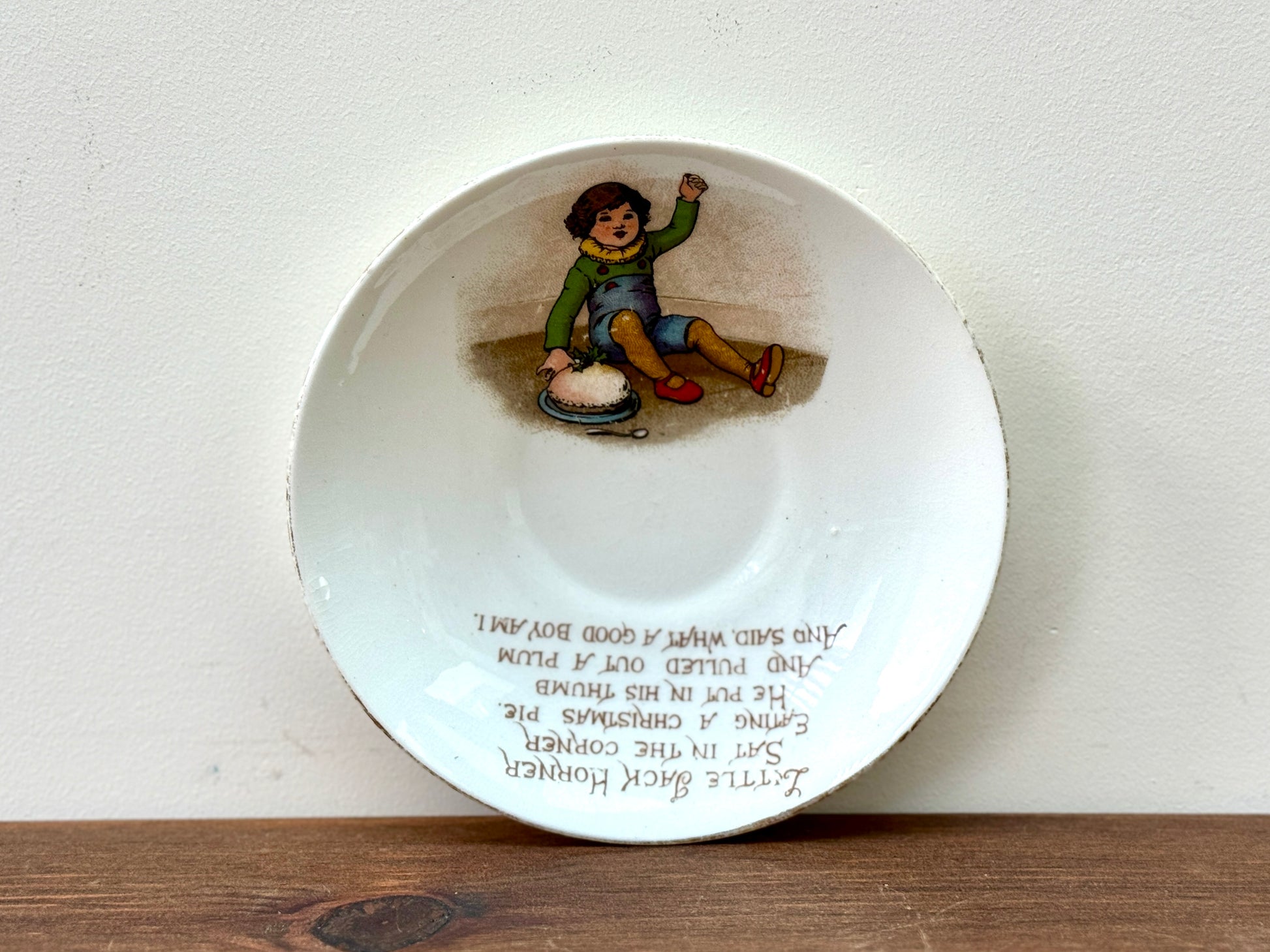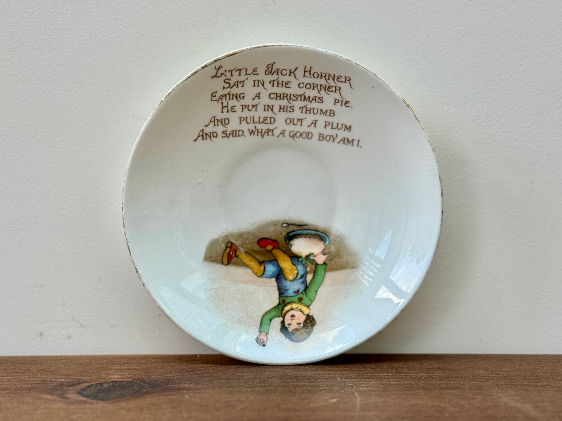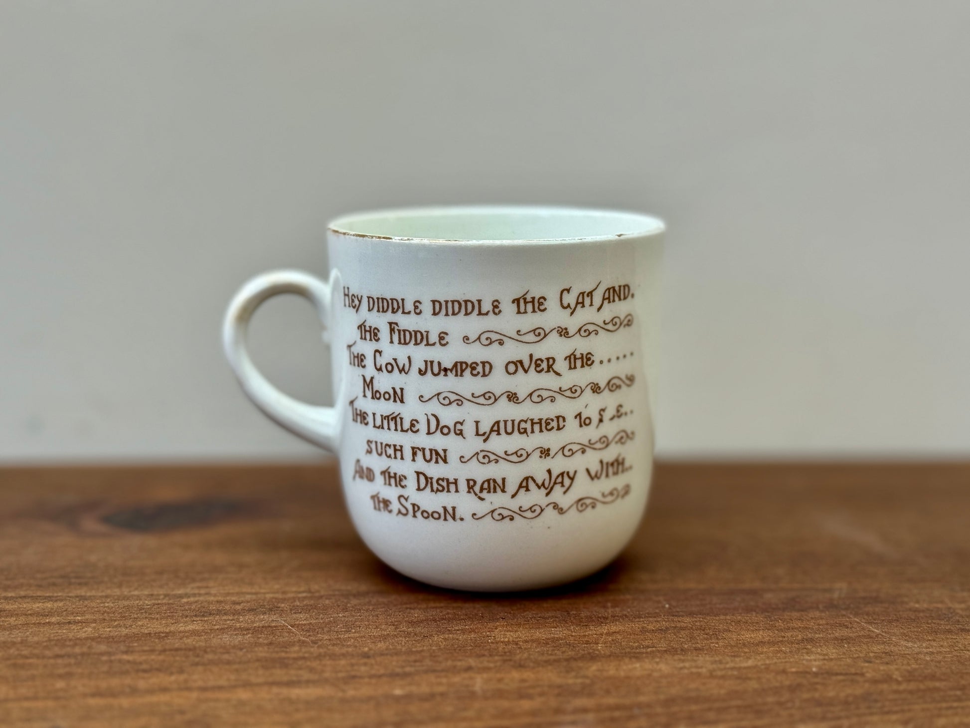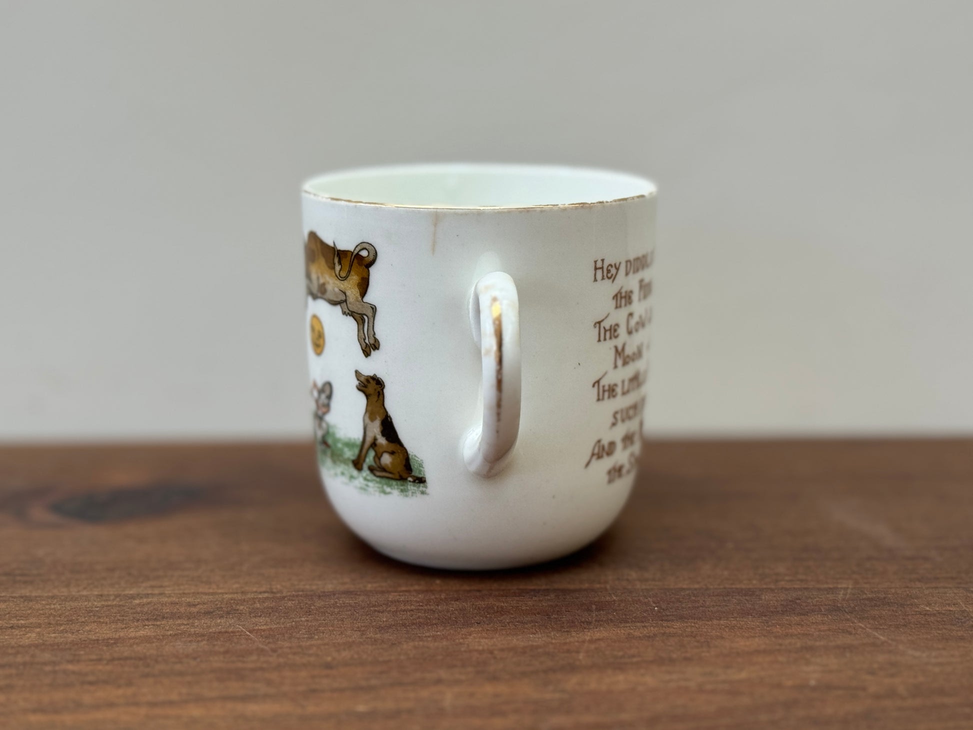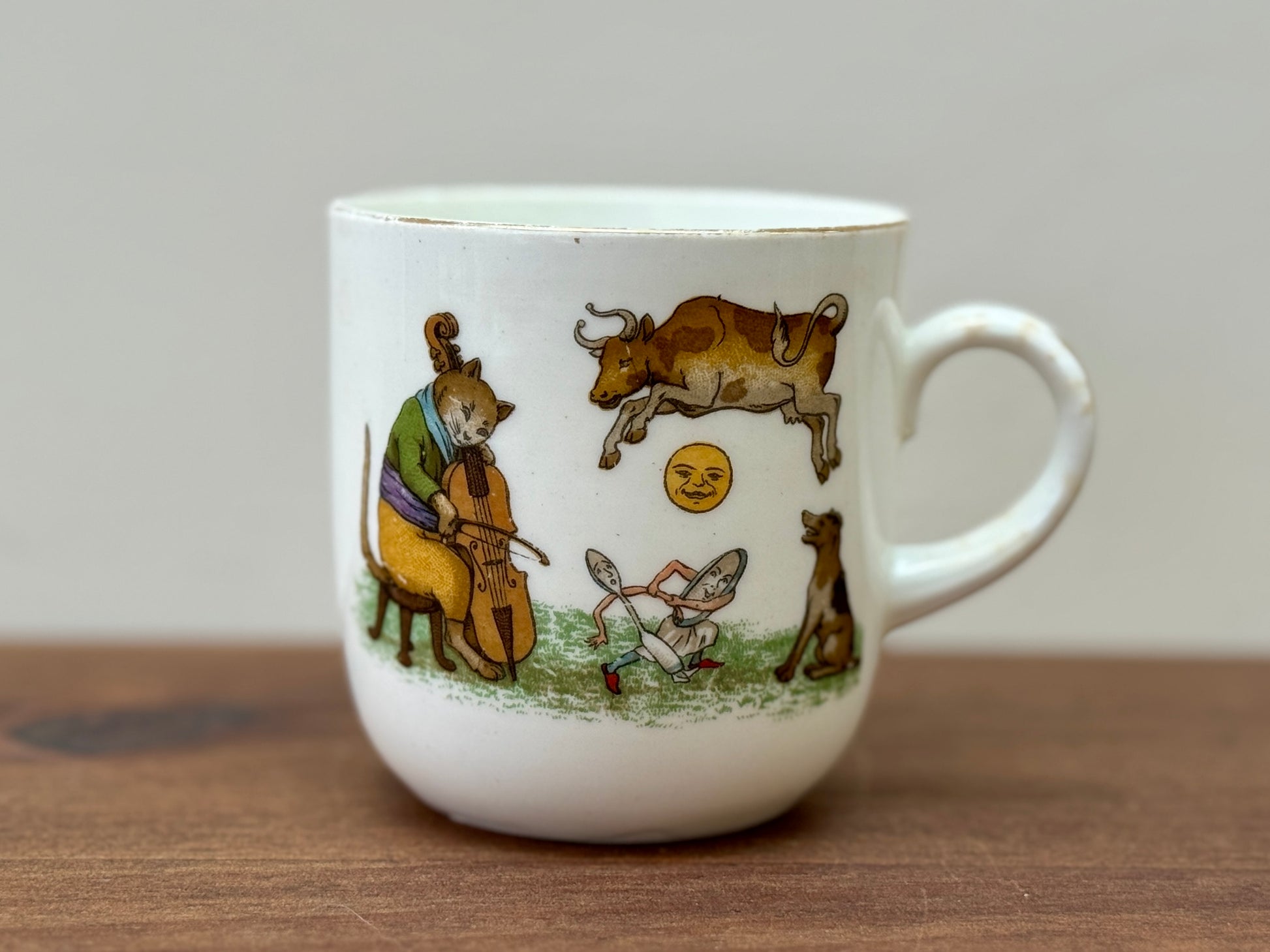 1910年代頃に製作された、タスカン・チャイナ(Tuscan China)によるナーサリーライム柄のカップ&ソーサーです。「Hey Diddle Diddle(ヘイ・ディドル・ディドル)」の、フィドルを奏でる猫や月を飛び越える牛、皿とスプーンなど、英国の古い童謡詩の世界が愛らしく描かれています。ソーサーには「Little Jack Horner(リトル・ジャック・ホーナー)」の詩も描かれており、2種類のナーサリーライムを楽しめる特別なデザインです。