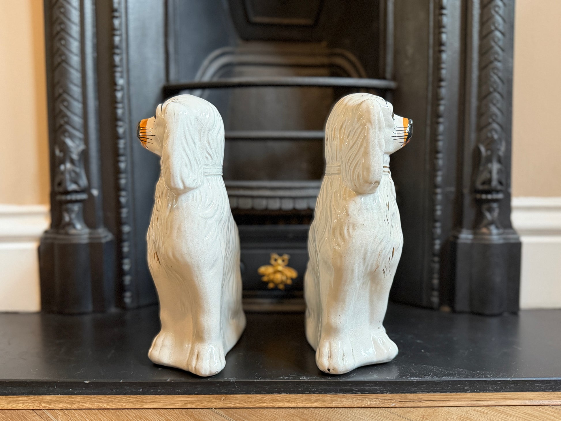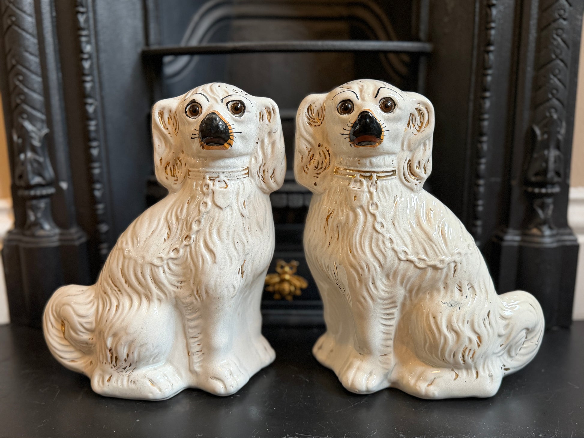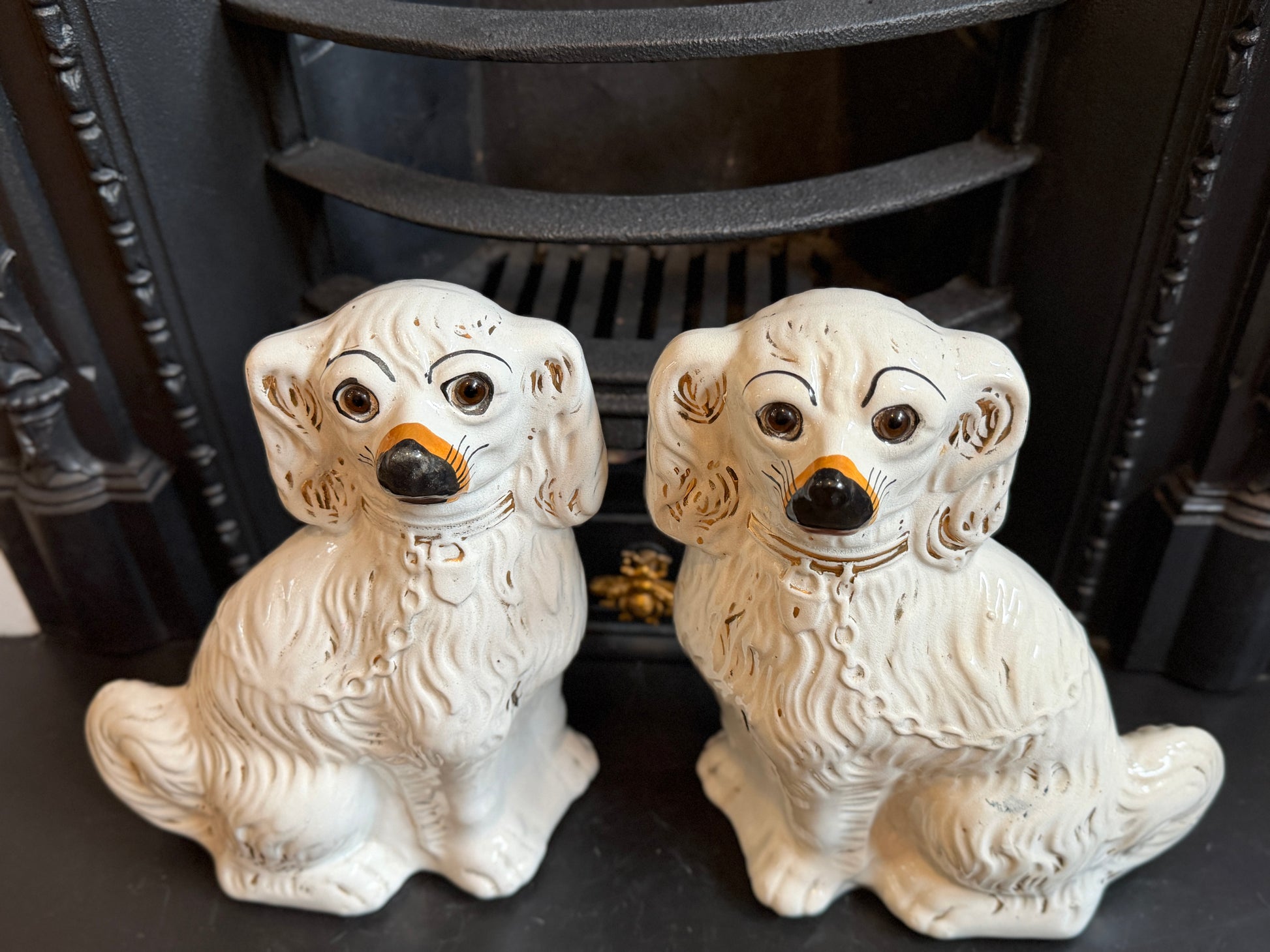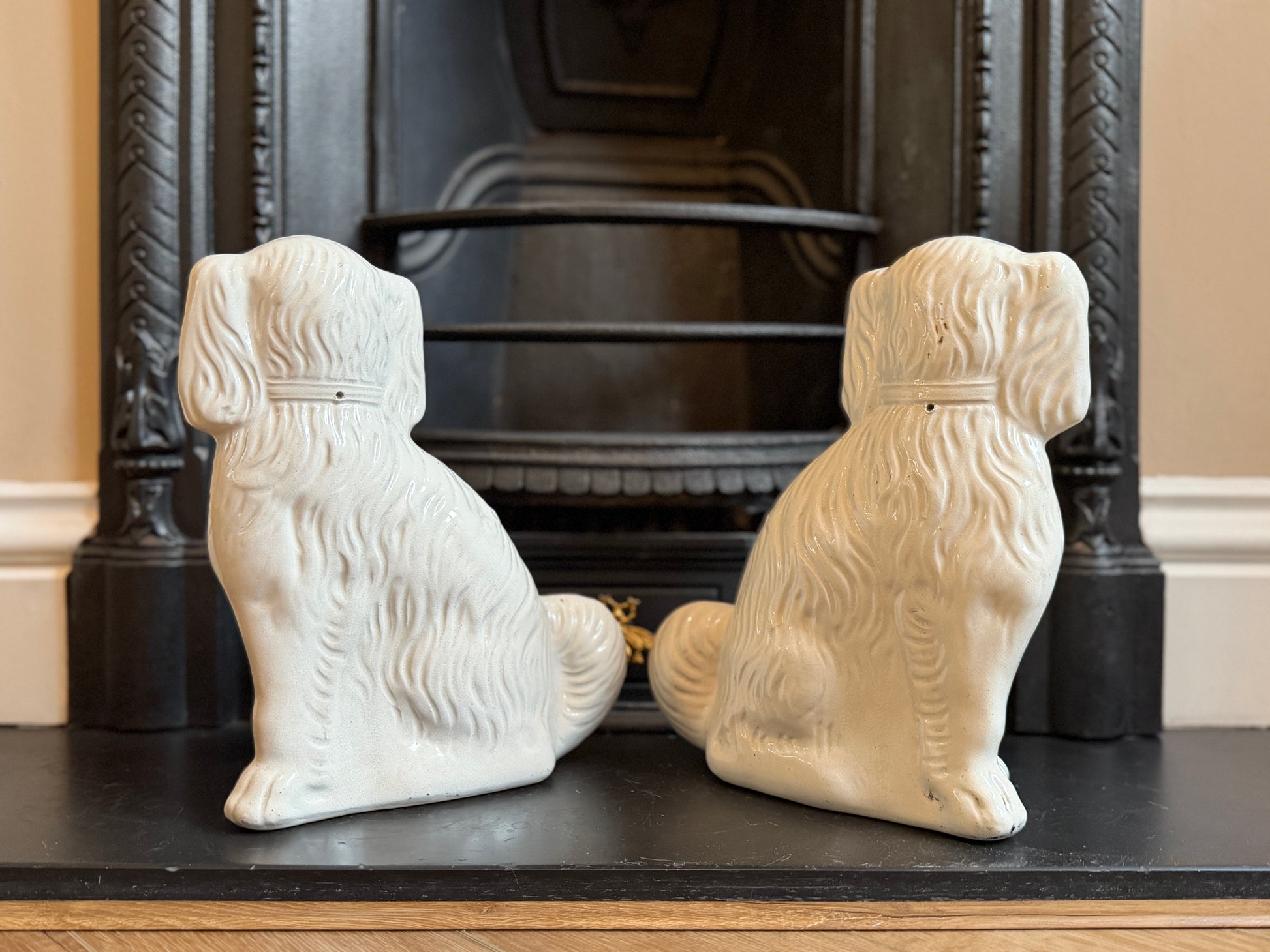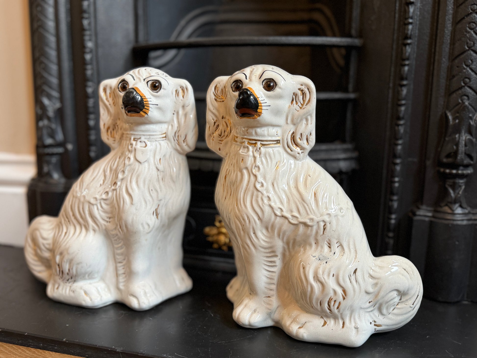 1890年代頃に作られたと考えられる、ヴィクトリア時代のスタッフォードシャードッグ(スパニエル)のペアです。こちらはガラスの目が入ったタイプで、表情に奥行きがあり、穏やかで愛らしい佇まいが魅力です。