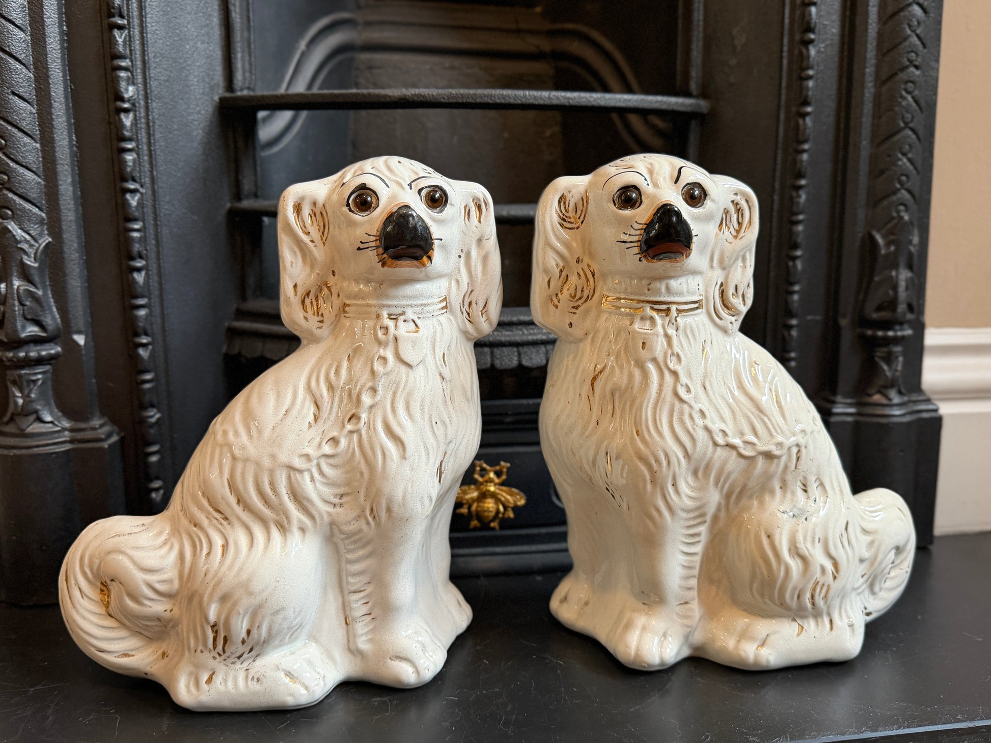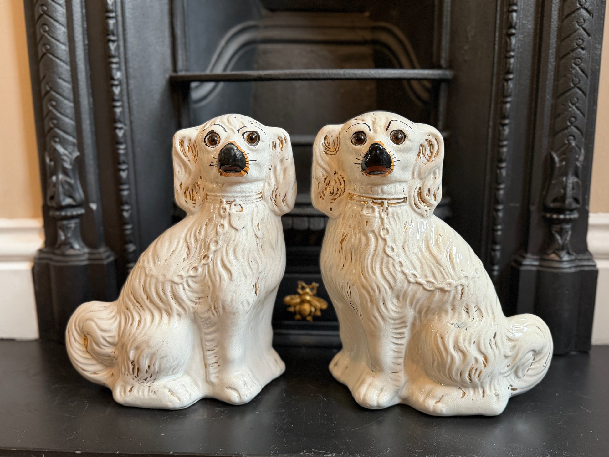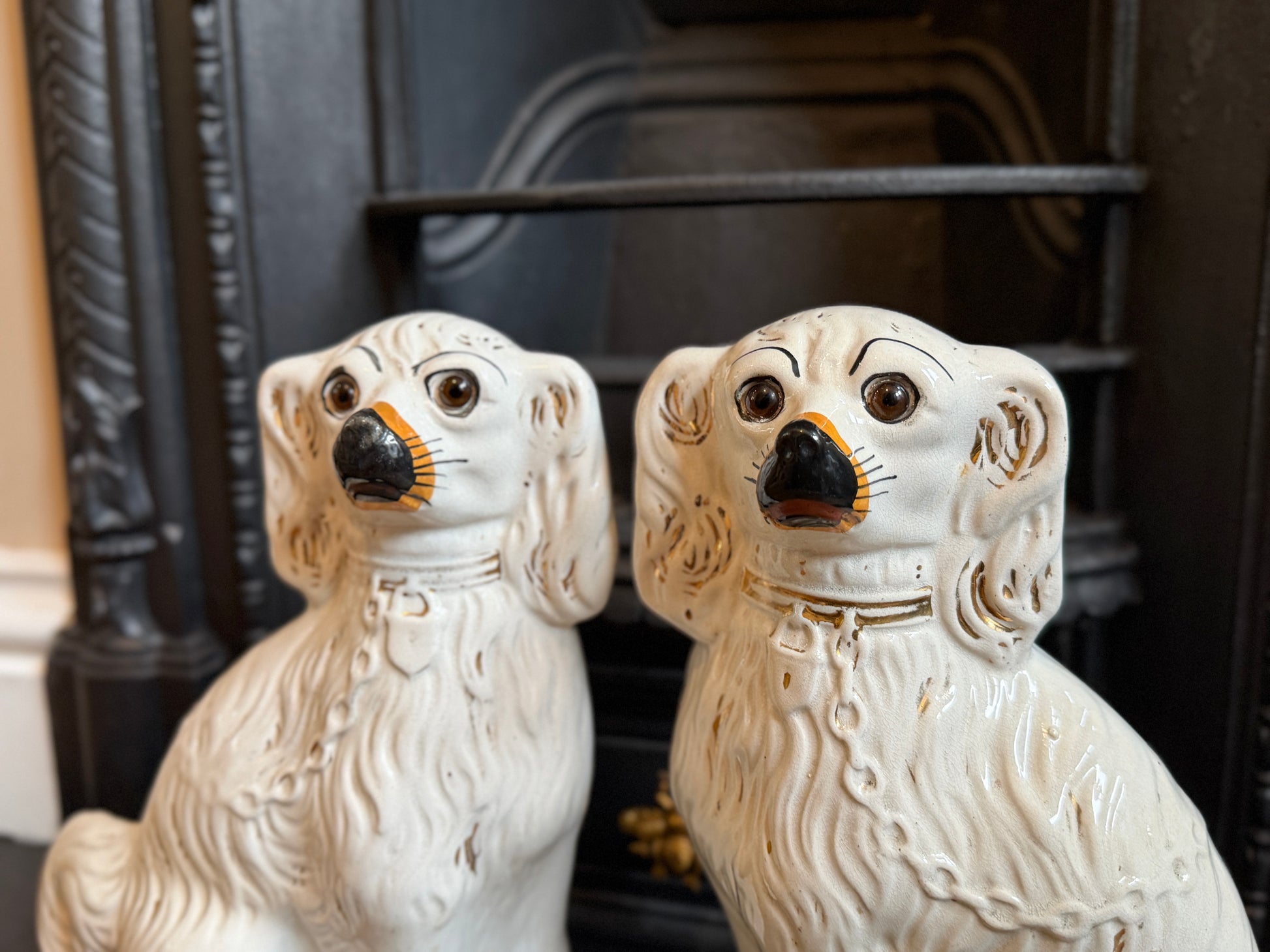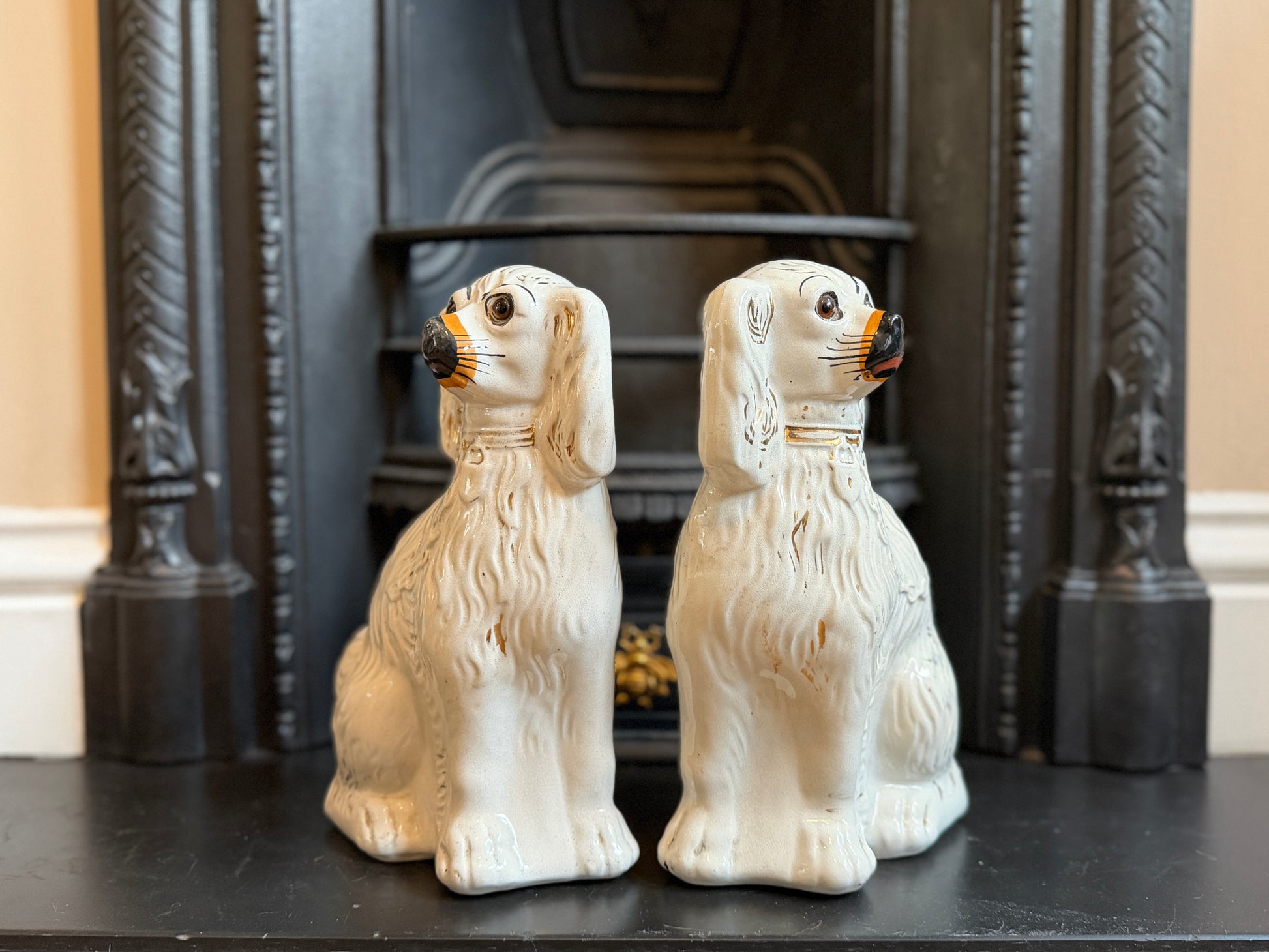 1890年代頃に作られたと考えられる、ヴィクトリア時代のスタッフォードシャードッグ(スパニエル)のペアです。こちらはガラスの目が入ったタイプで、表情に奥行きがあり、穏やかで愛らしい佇まいが魅力です。