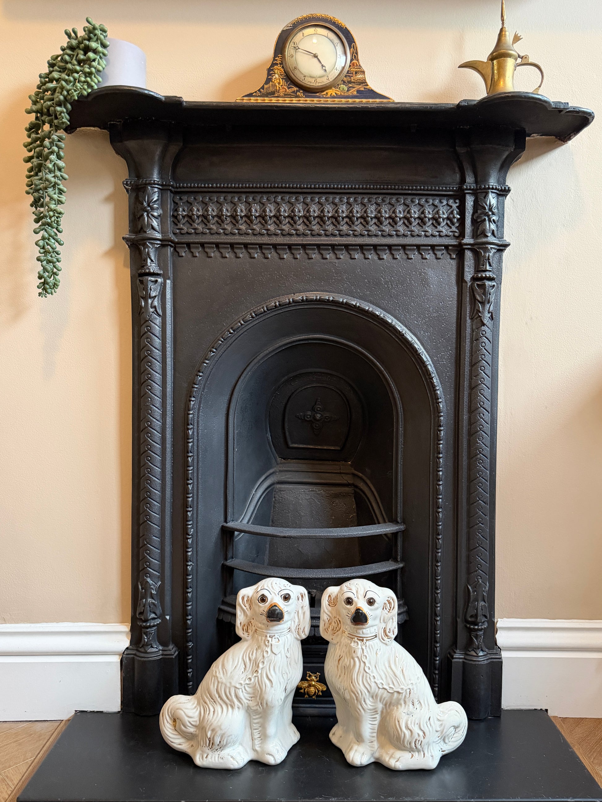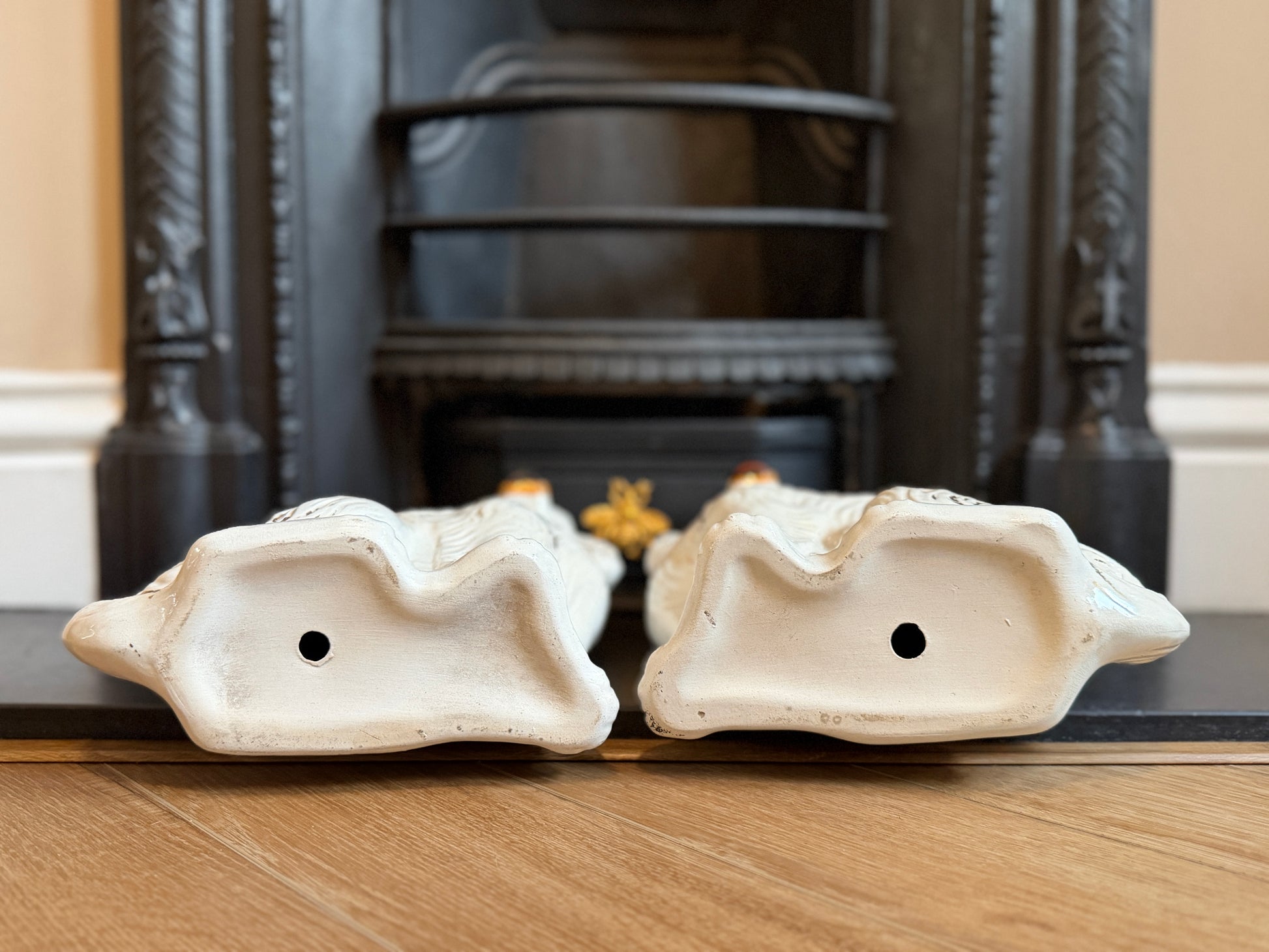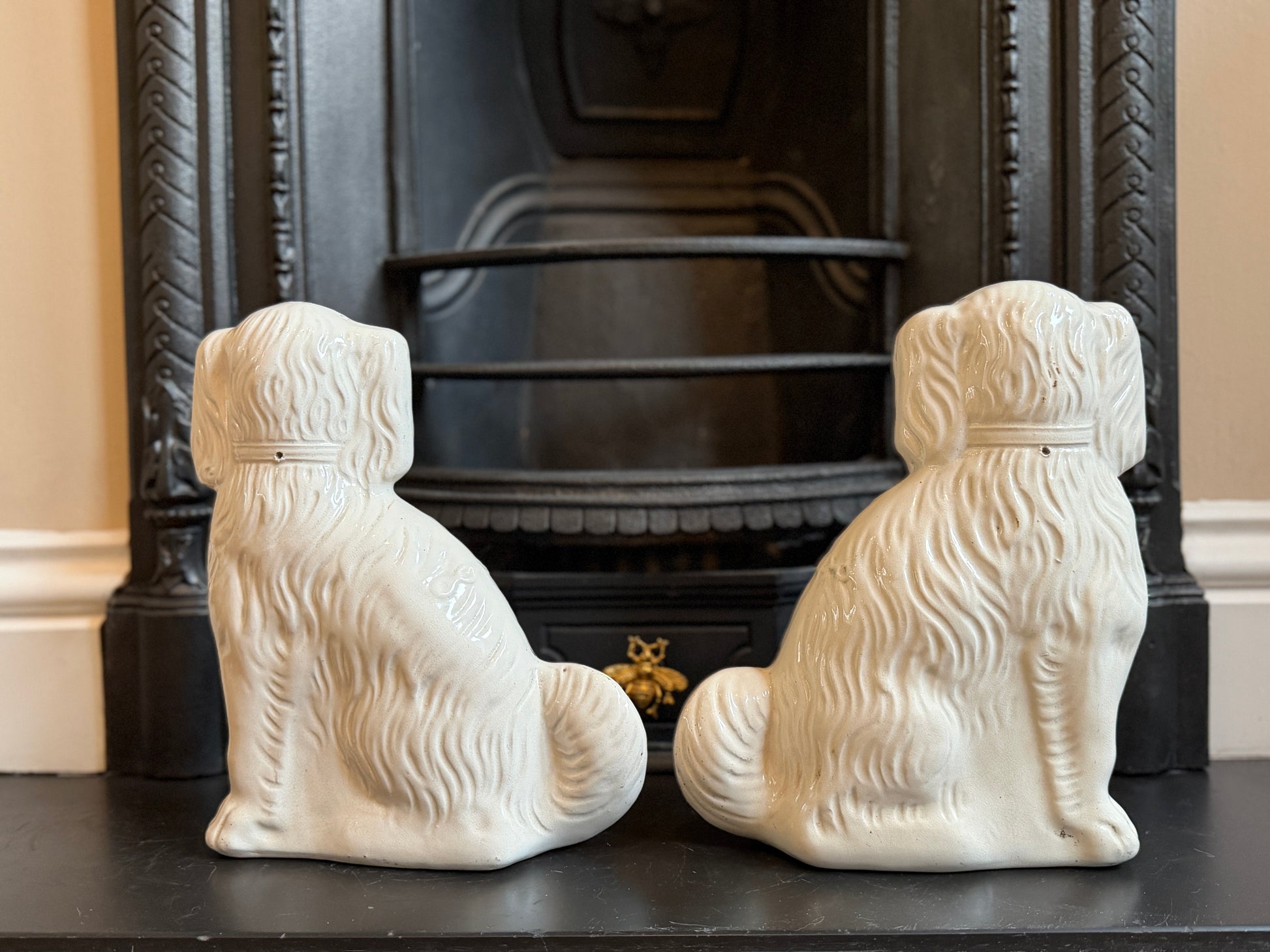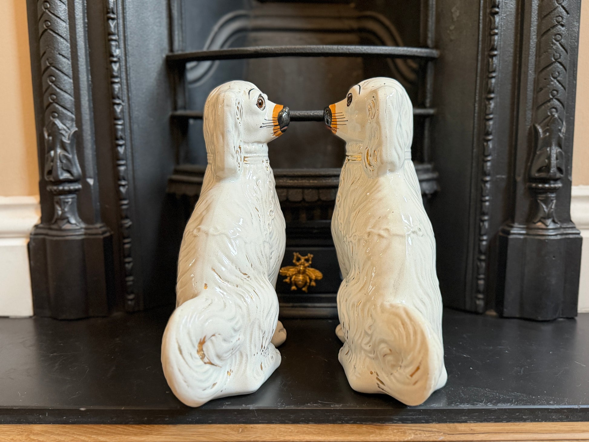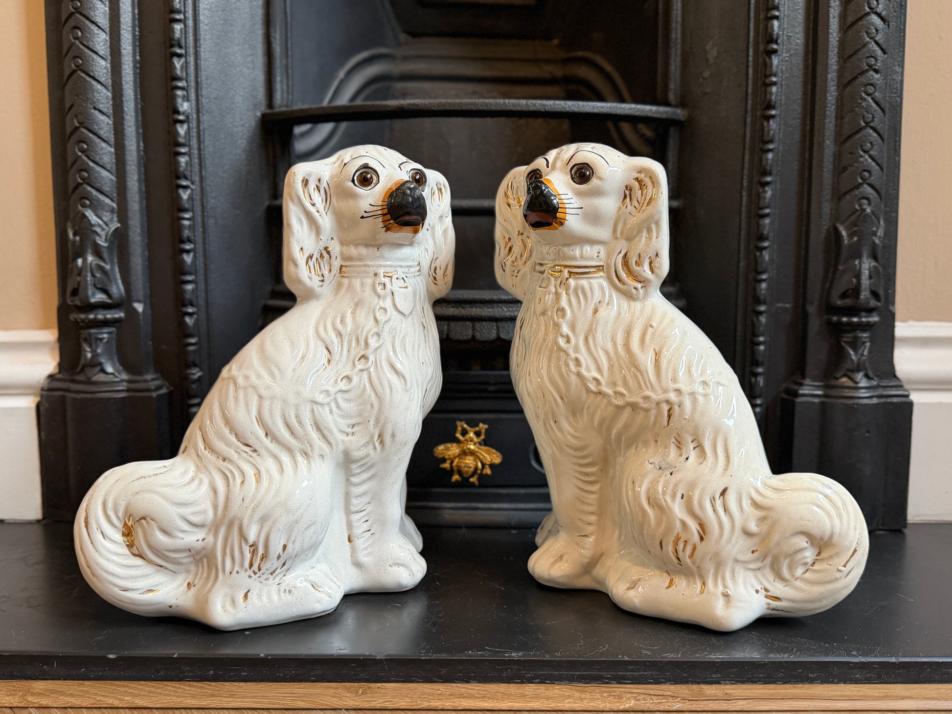 1890年代頃に作られたと考えられる、ヴィクトリア時代のスタッフォードシャードッグ(スパニエル)のペアです。こちらはガラスの目が入ったタイプで、表情に奥行きがあり、穏やかで愛らしい佇まいが魅力です。