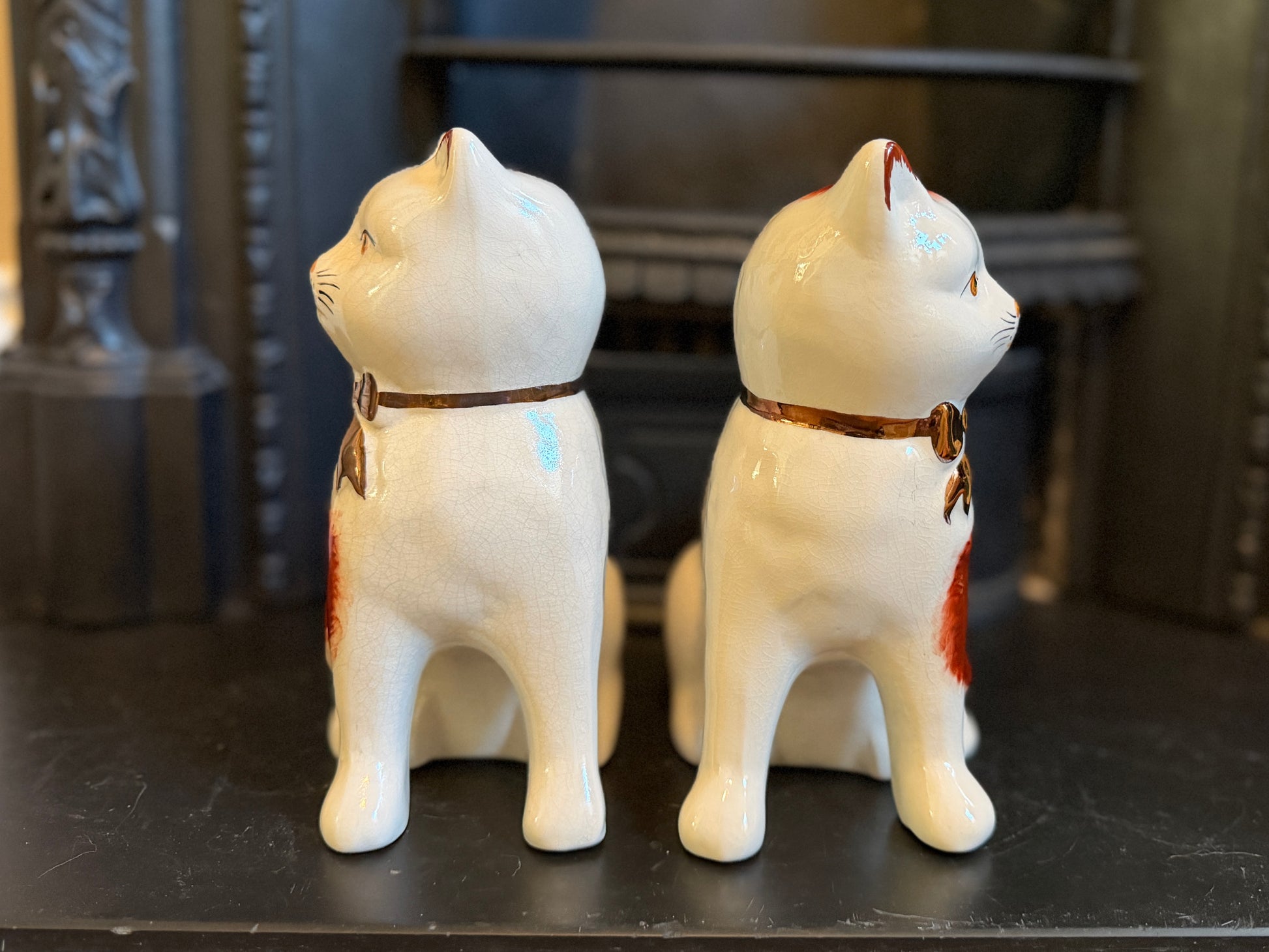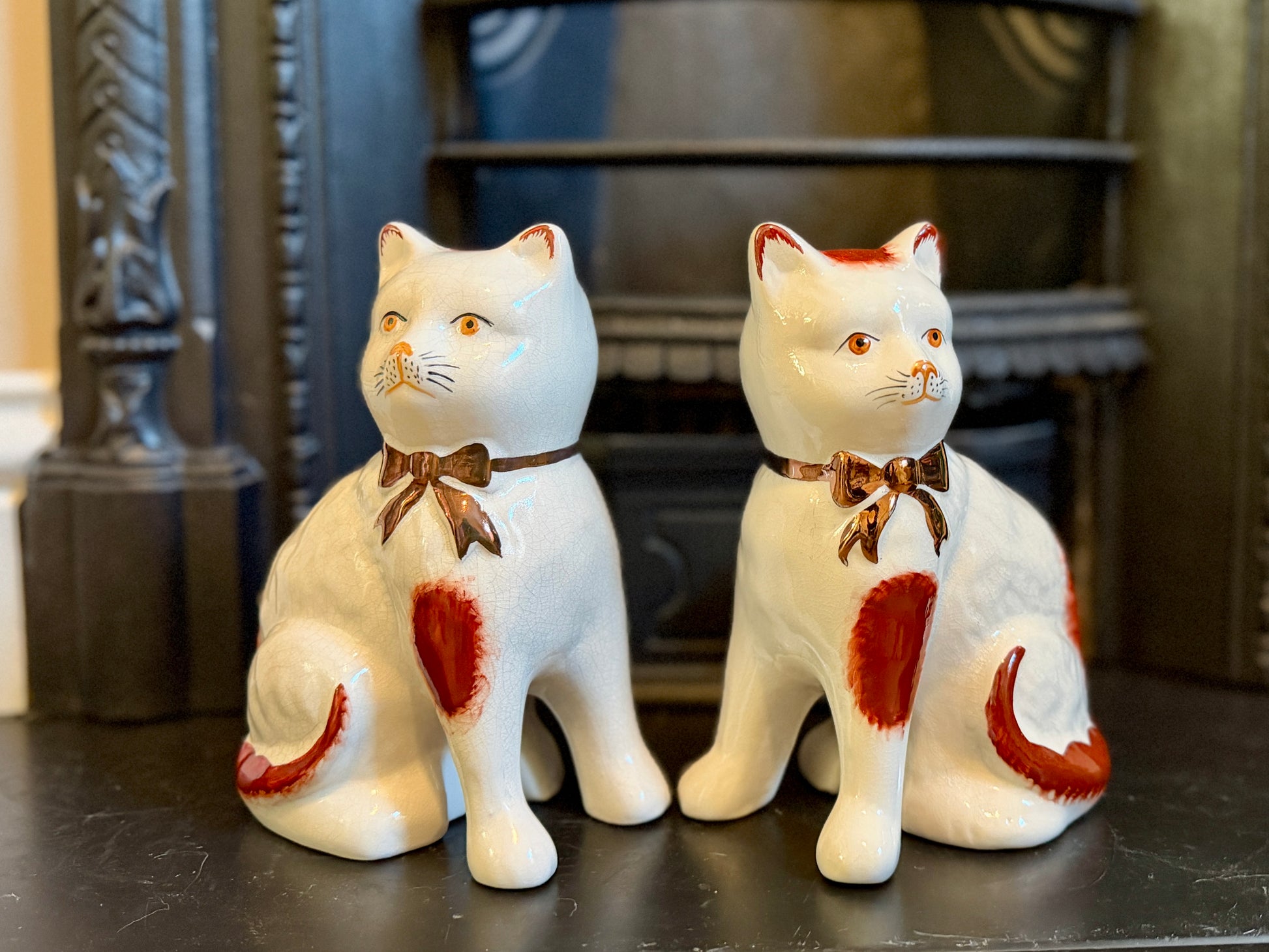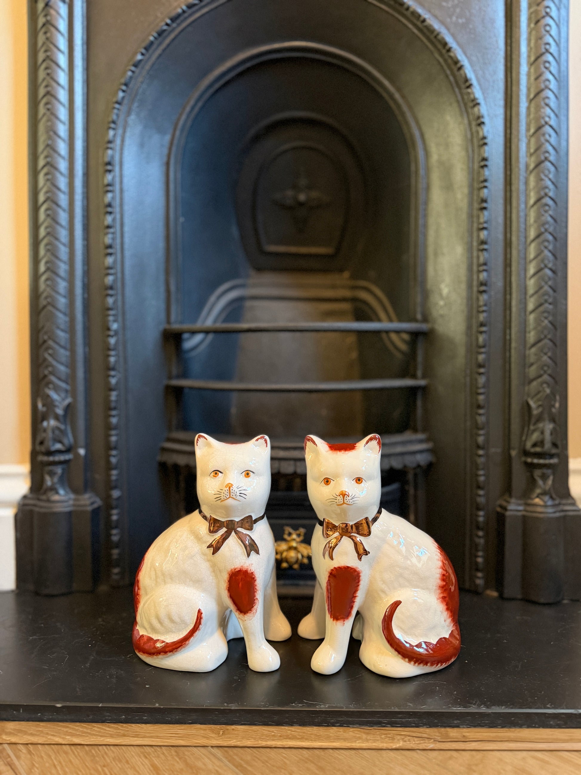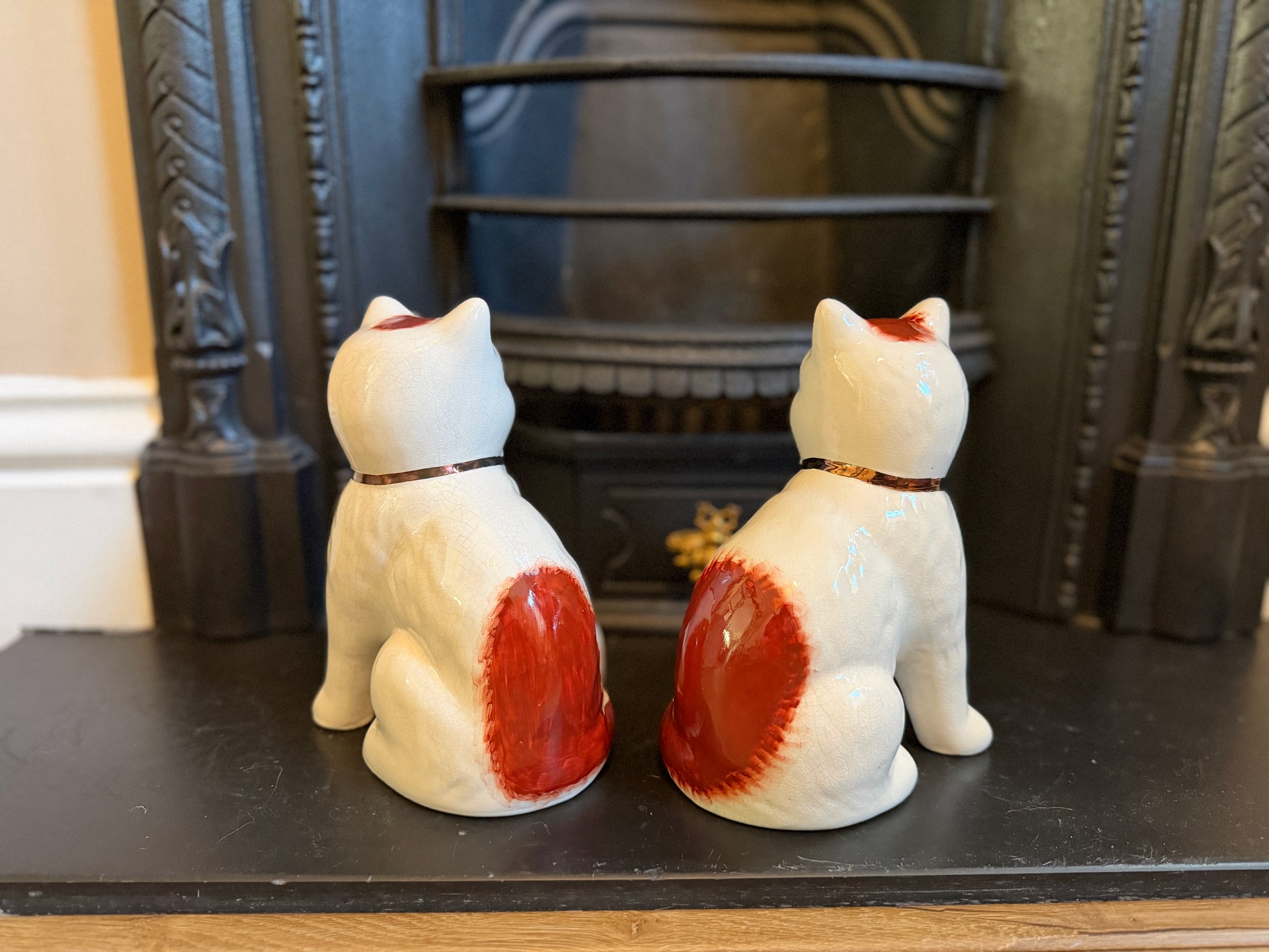 艶やかな仕上がりと手描きの個性、そしてどこか温かみのある表情が魅力のこのペアは、玄関やサイドボード、ブックシェルフなどに飾ると、空間に英国らしい上品さと柔らかな彩りを添えてくれます。猫モチーフをお探しの方や、インテリアにユニークなポイントを加えたい方におすすめです。