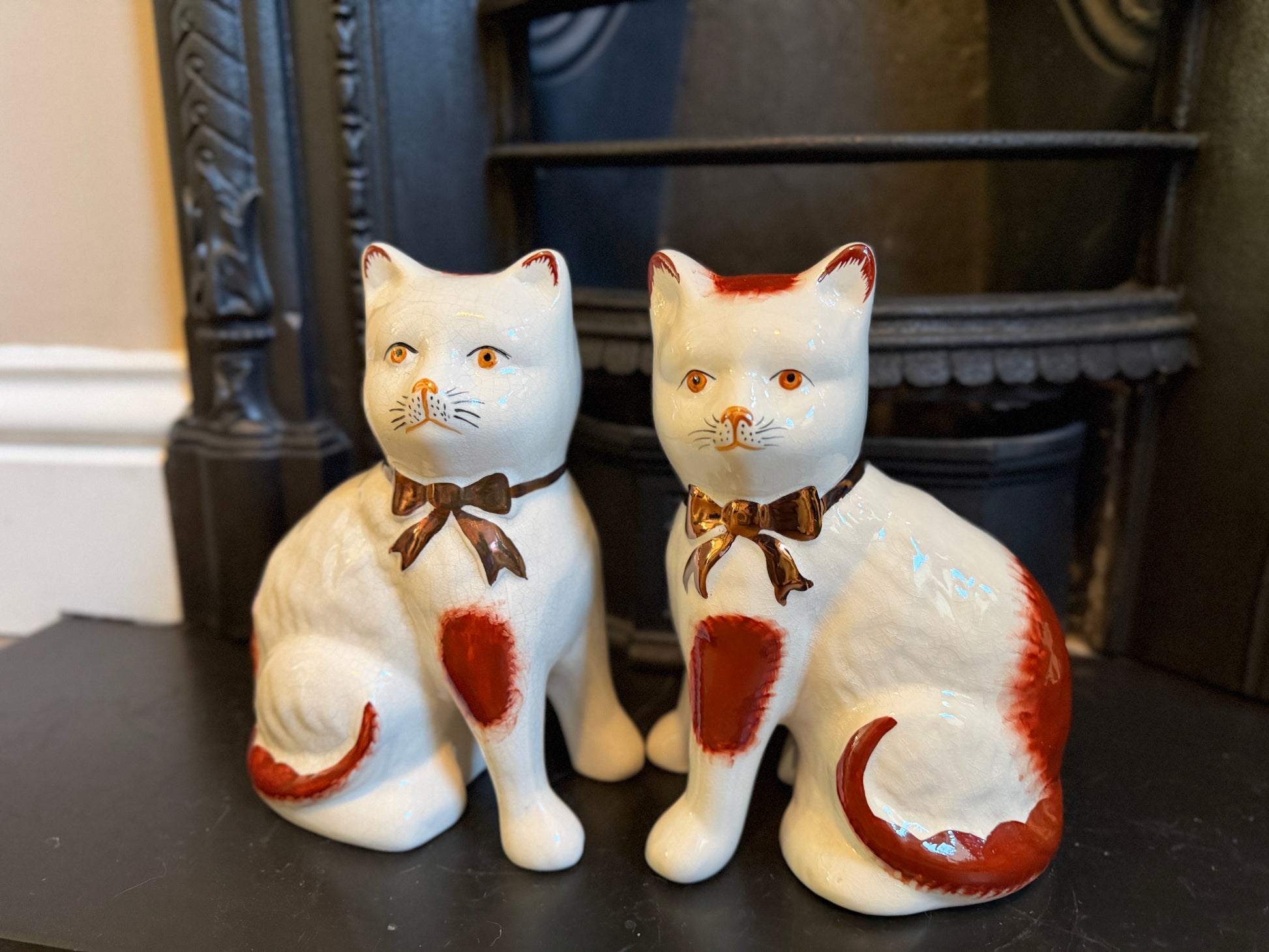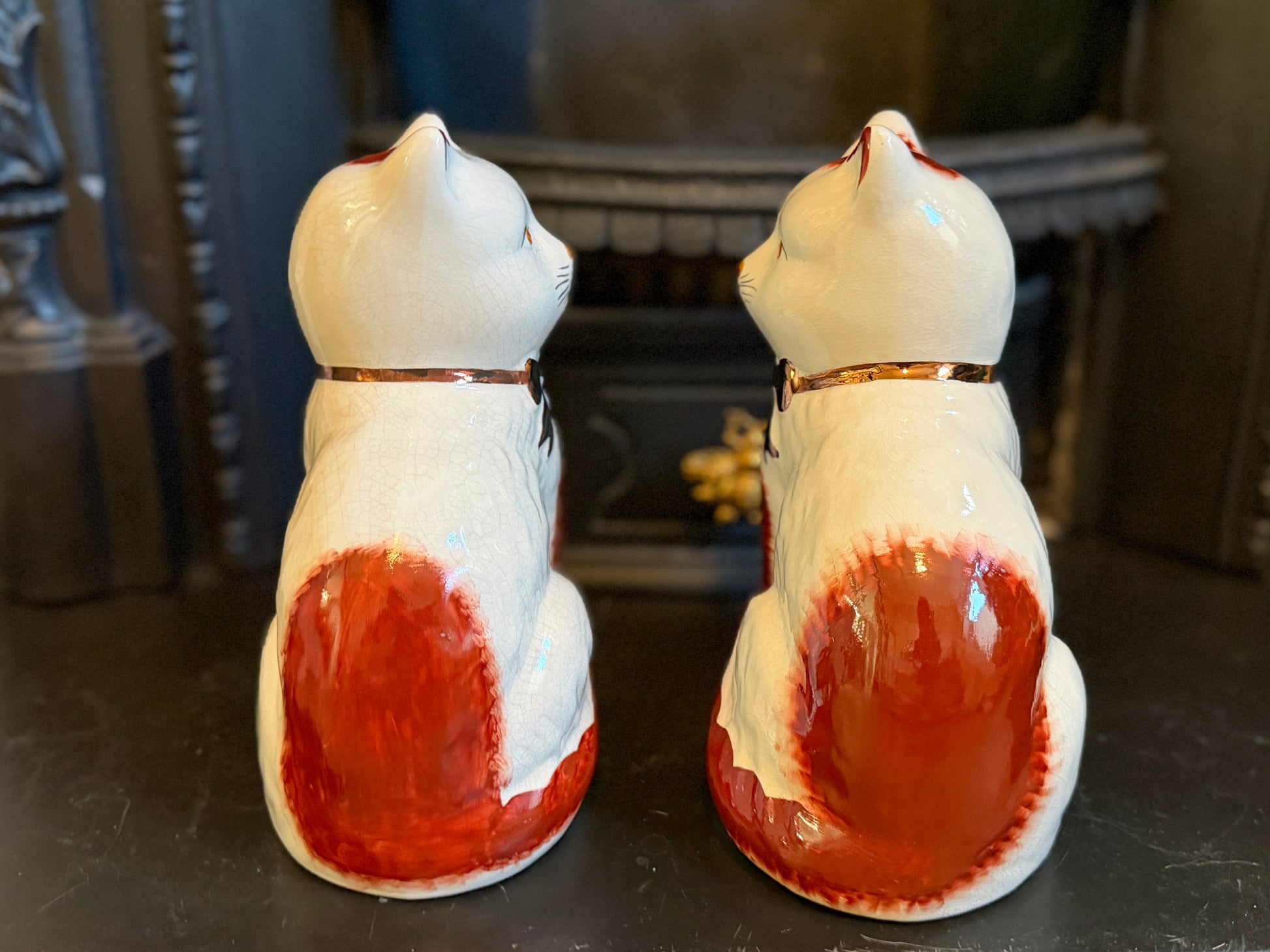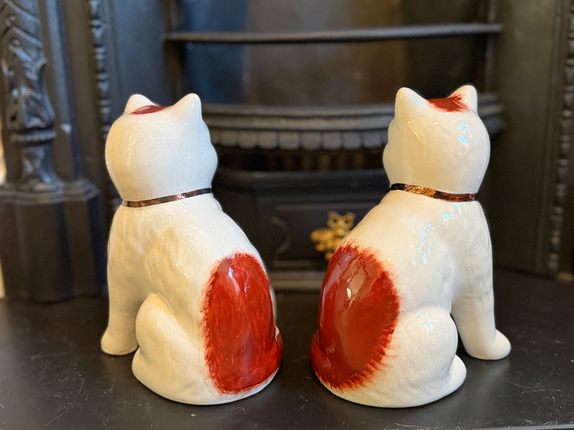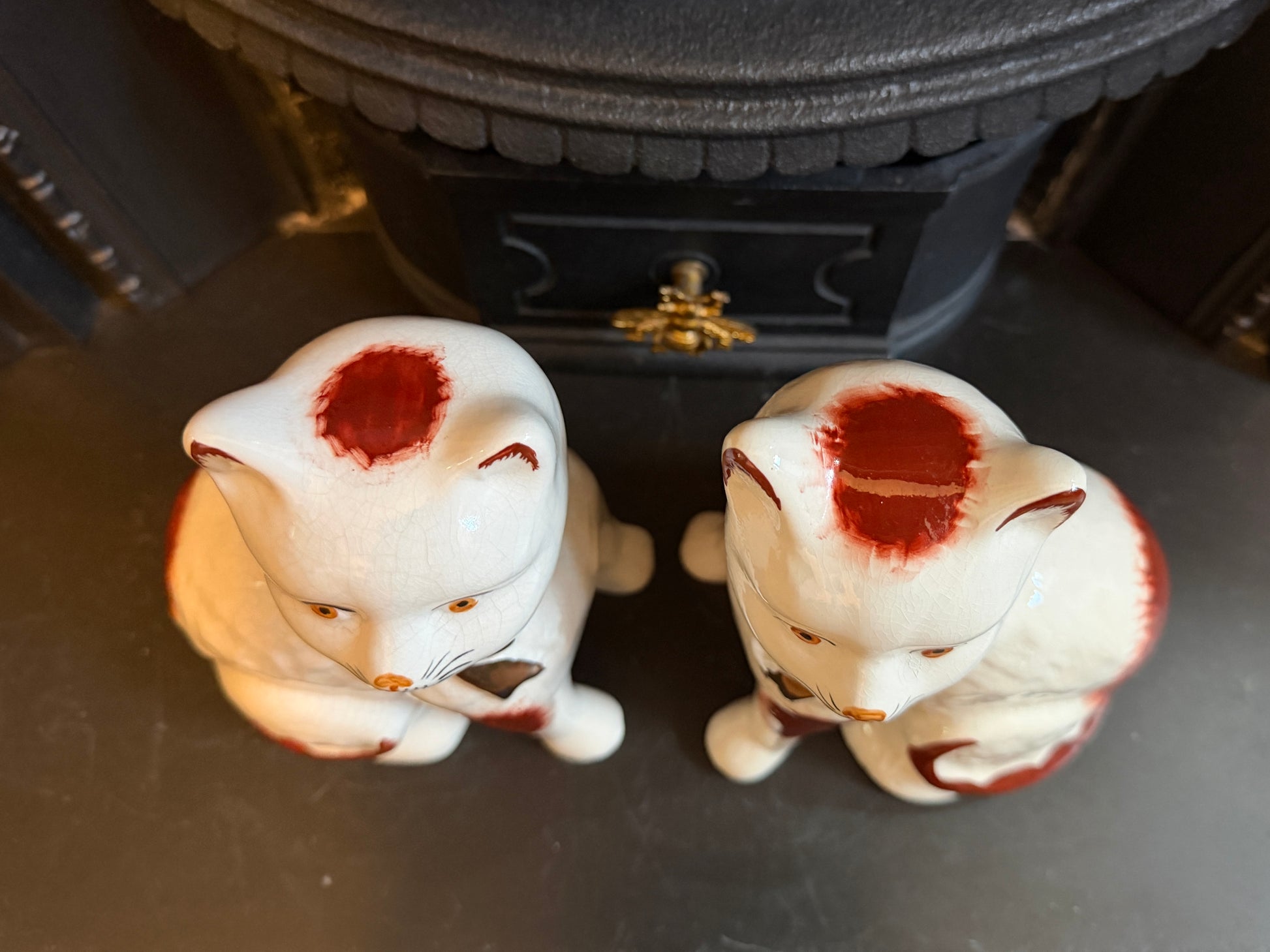 艶やかな仕上がりと手描きの個性、そしてどこか温かみのある表情が魅力のこのペアは、玄関やサイドボード、ブックシェルフなどに飾ると、空間に英国らしい上品さと柔らかな彩りを添えてくれます。猫モチーフをお探しの方や、インテリアにユニークなポイントを加えたい方におすすめです。